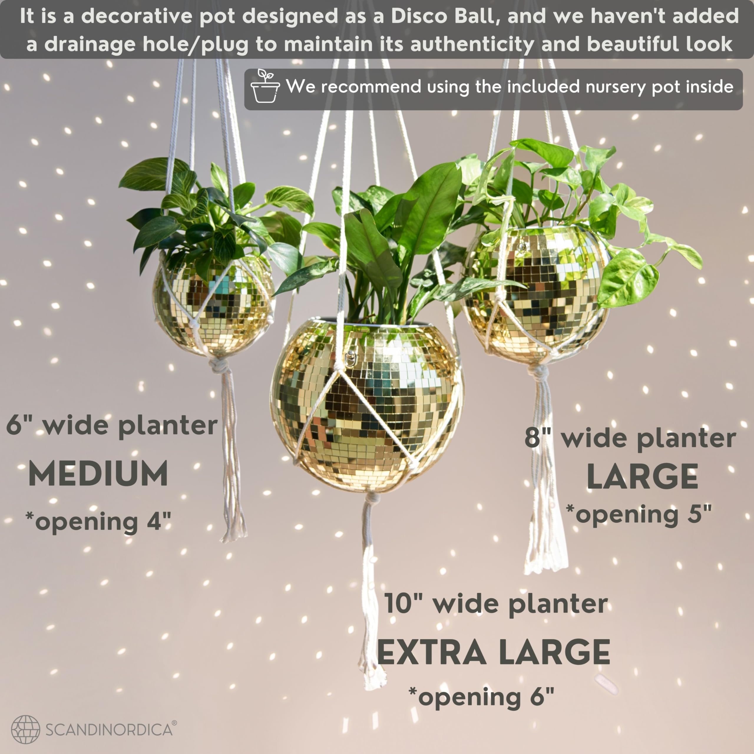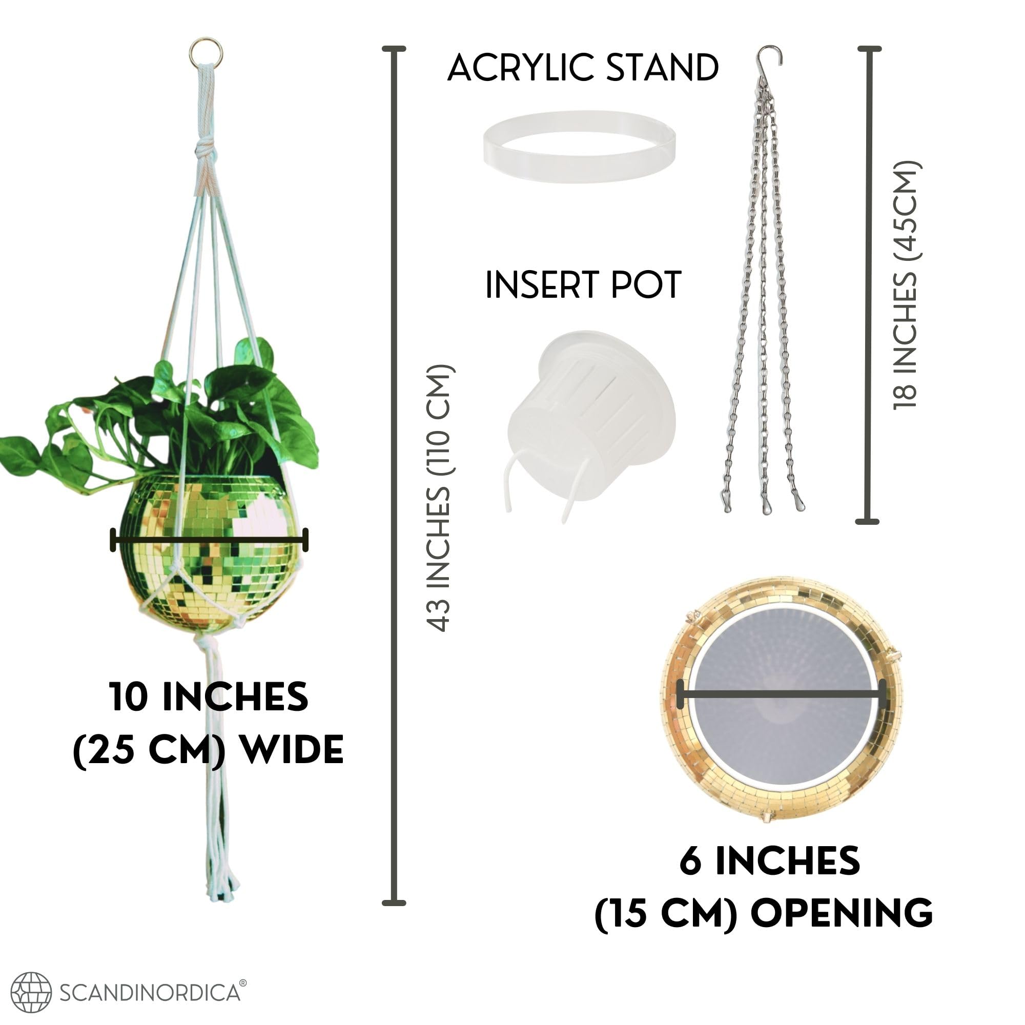 SCANDINORDICA Discokugel-Pflanzgefäss, Vorteilspaket mit Spiegel-Disco-Pflanzgefäss mit Kette, Makramee-Aufhänger und Acrylständer für den Tisch, mit selbstbewässerndem Einsatz, Pflanzzubehör, ca.