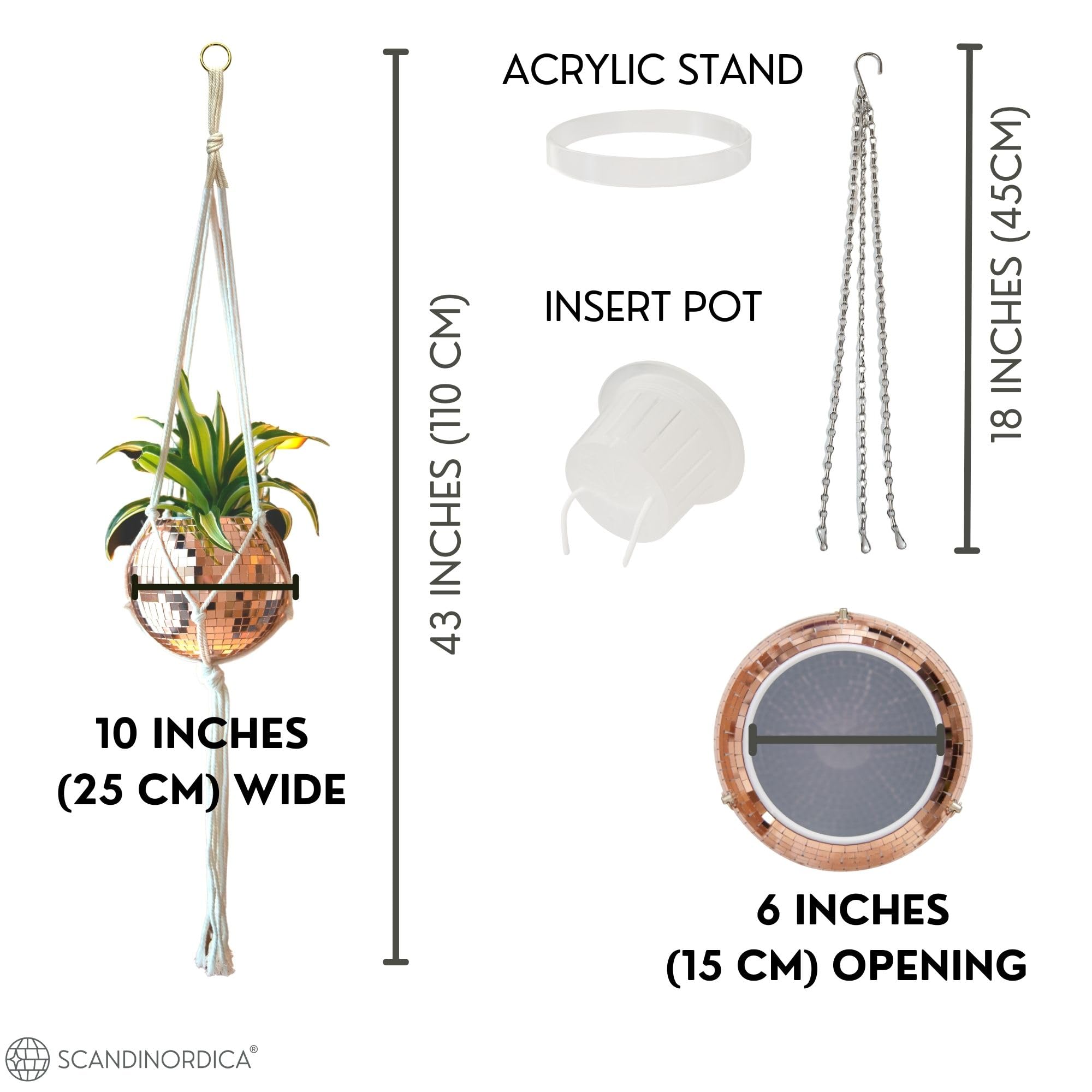 SCANDINORDICA Discokugel-Pflanzgefäss, Vorteilspaket mit Spiegel-Disco-Pflanzgefäss mit Kette, Makramee-Aufhänger und Acrylständer für den Tisch, mit selbstbewässerndem Einsatz, ca. 25,5 cm, Roségold