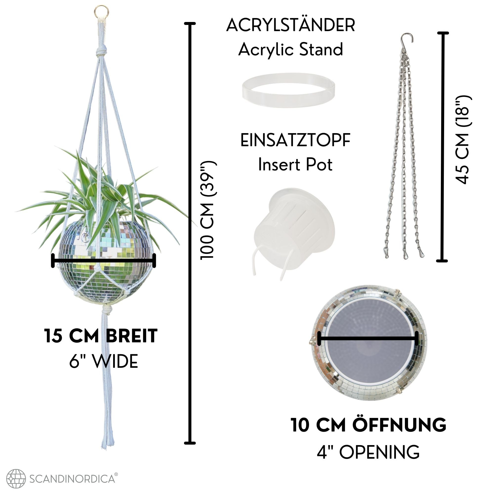 SCANDINORDICA Hängender Disco Ball Pflanzer erhellt jeden Raum oder jede Veranda und fängt das Sonnenlicht ein, um dort zu glänzen, wo es am dringendsten benötigt wird. Diese stilvolle Boho Discokugel erweitert die Reichweite Ihres Fensters, wodurch andere Zimmerpflanzen von mehr natürlichem Licht profitieren und Ihr Interieur aufpeppen!