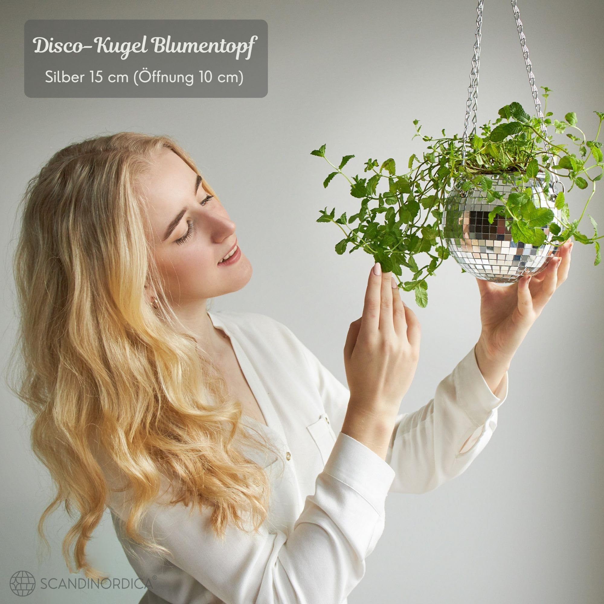 SCANDINORDICA Discokugel blumentopf - Spiegelkugel hängende blumentöpfe, diskokugel Pflanzen, discokugel deko übertopf makramee, Geschenk Freundin | Disco Kugel pflanzentopf – 15 cm Silber