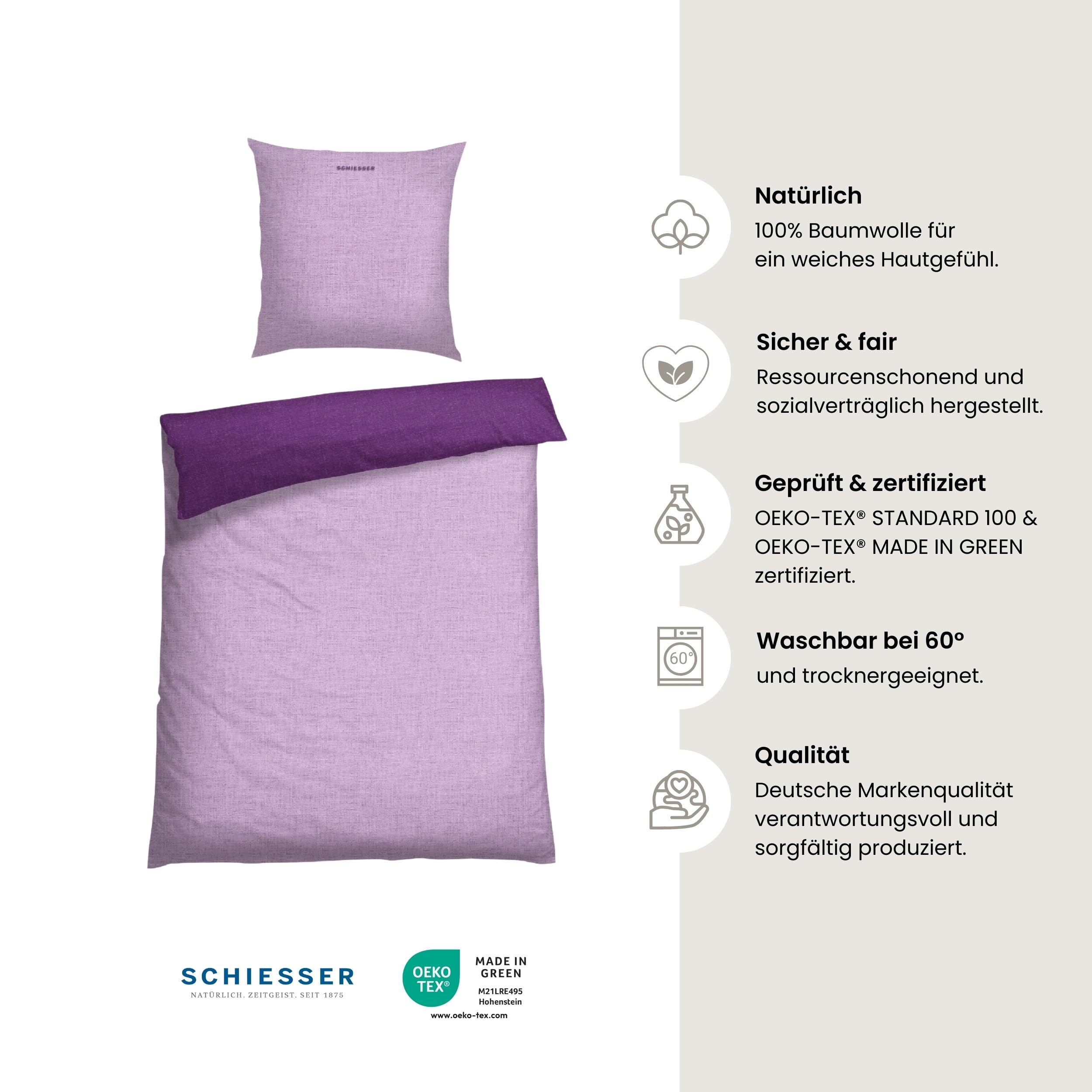 Schiesser Bettwäscheset Doubleface | Renforcé | 2-teilig | Zweifarbig | 100 % Baumwolle | Oeko-Tex® Made in Green Zertifiziert | Reissverschluss | 135x200cm + 80x80cm | Lila