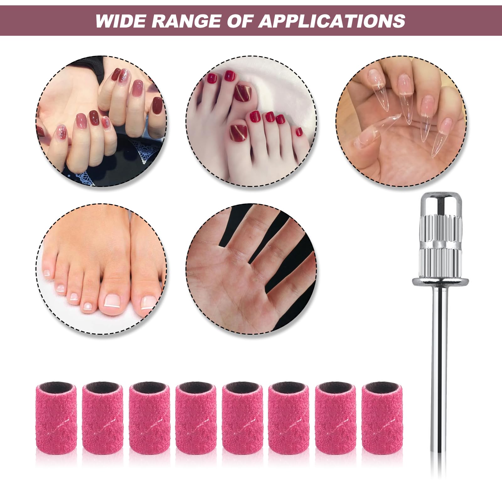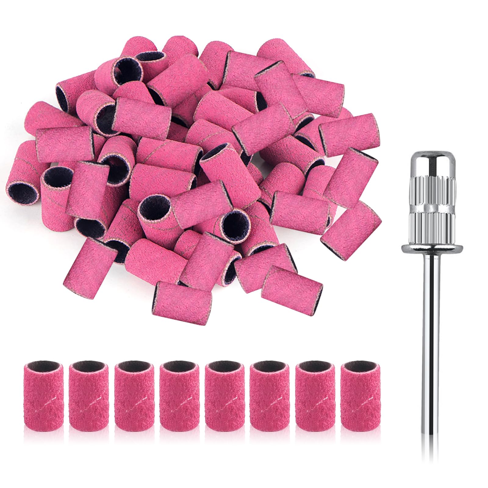 Die Schleifhuelsen sind vielseitig einsetzbar, unter anderem zum Bearbeiten der Nagelhaut, zum Polieren der Naegel, zum Formen von Nagelspitzen sowie fuer leichte Modellagearbeiten. Sie werden haeufig in Nagelstudios, Kosmetiksalons und fuer Nail Art Anwendungen verwendet.
