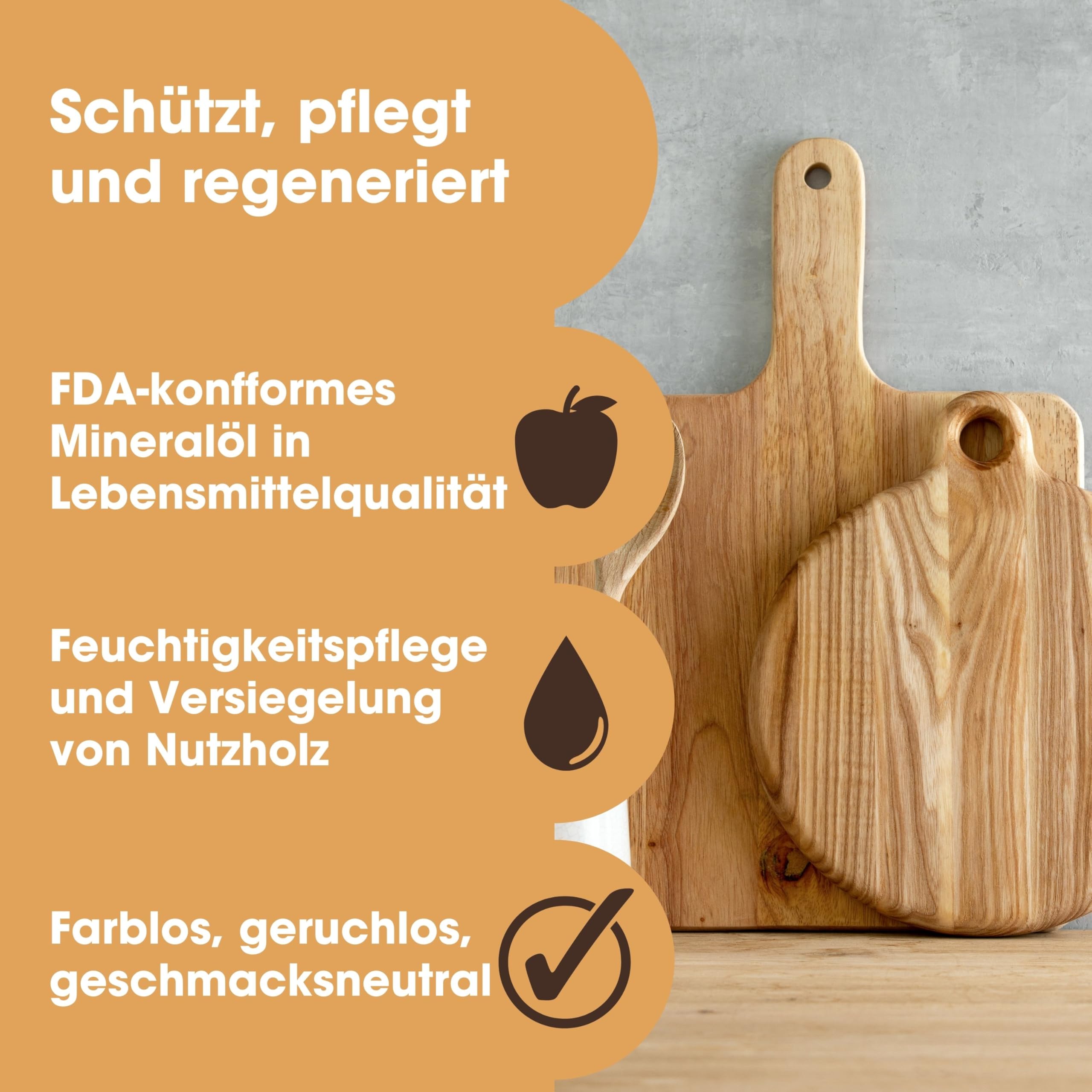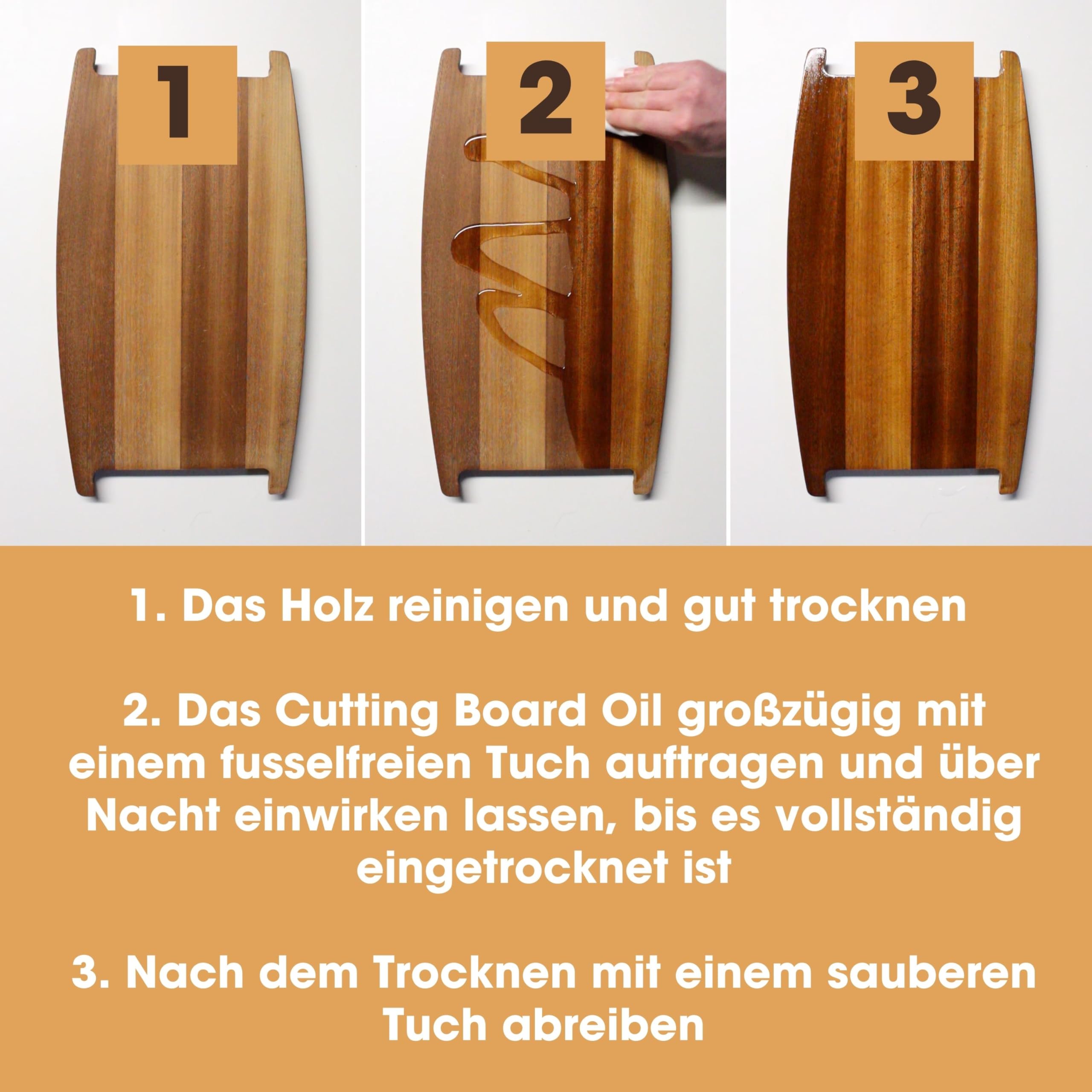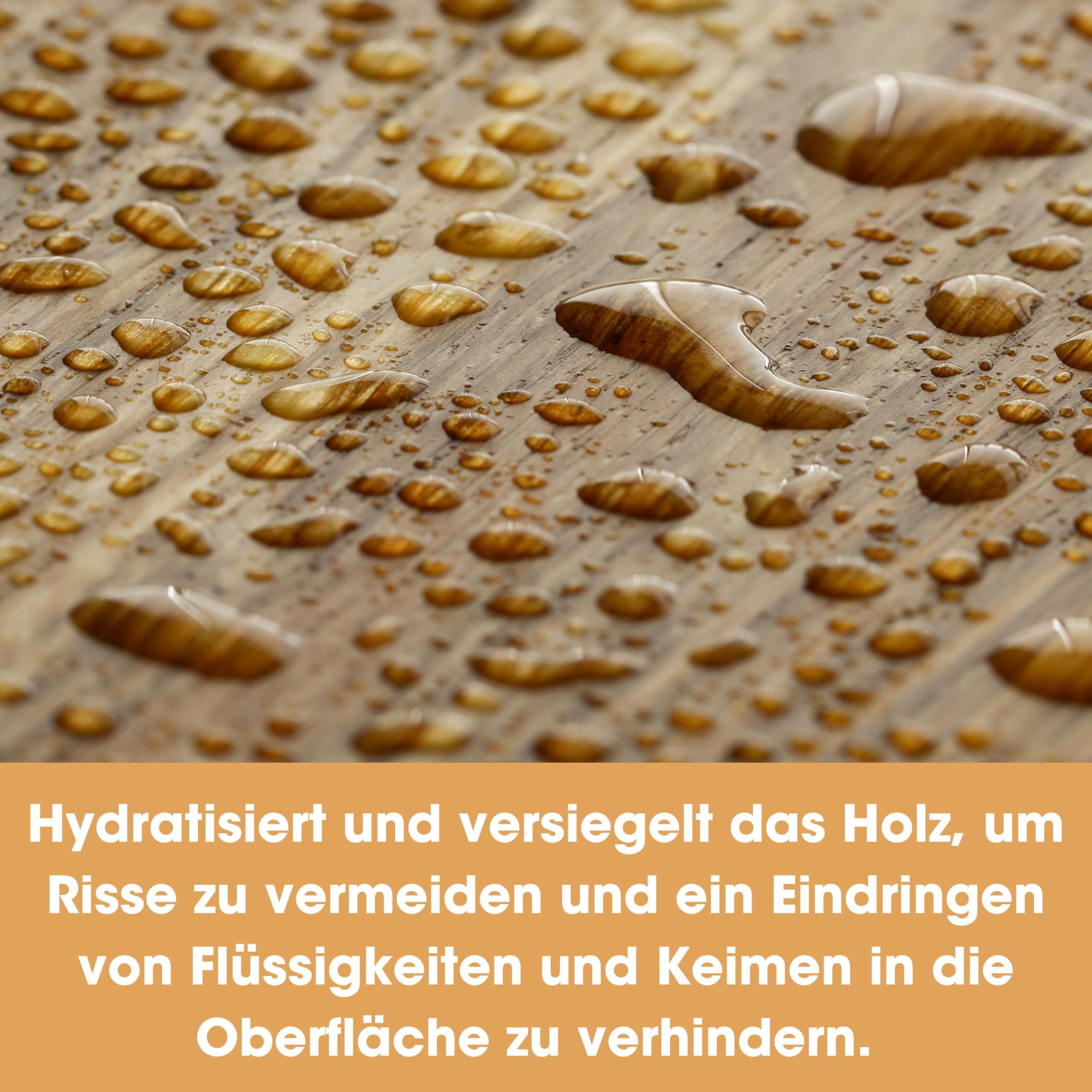 Unser Schneidebrett-Öl ist die perfekte Wahl für den Schutz, die Pflege und die Wiederherstellung von Küchenartikeln aus Holz wie Schneidebrettern, Metzgerblöcken, Holzlöffeln und mehr. Ein regelmässiges Auftragen des Holzöl Schneidebrett verhindert, dass Schneidebretter trocken, rissig und spröde werden. Der Ölfilm bildet eine schützende Barriere und verhindert, dass Flüssigkeiten in die Oberfläche eindringen, sodass die Vermehrung von Keimen und Bakterien reduziert wird. Unser Öl für Schneidebretter ist lebensmittelecht und eignet sich daher perfekt für die Behandlung von Gegenständen, die für die Zubereitung von Lebensmitteln verwendet werden. Im Gegensatz zu vielen anderen Produkten für die Holzimprägnierung auf Ölbasis verdirbt dieses Öl nicht. Unser reines Mineralöl für Nutzholz dringt ins Holz ein, erneuert die natürliche Farbe und den Charakter des Holzes und schützt es vor Keimen und Abnutzung. So lässt sich die Lebensdauer Ihrer Küchenbretter, -blöcke und -utensilien aus Holz verlängern.
