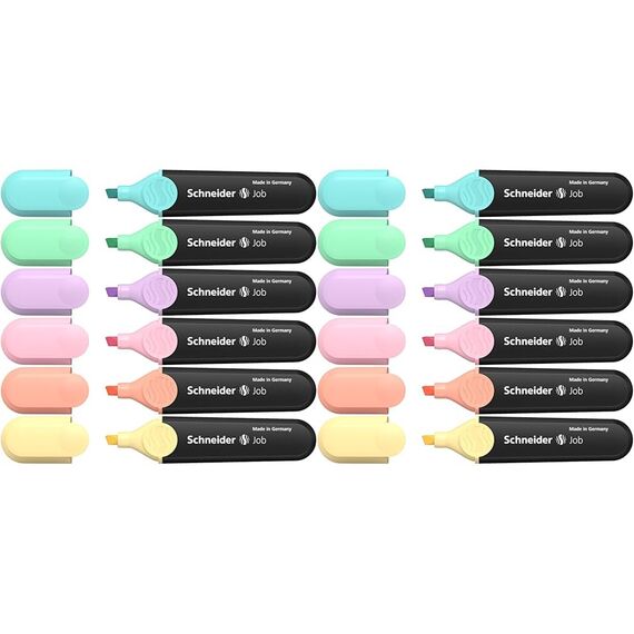 Schneider Job 150 PastellTextmarker mit Keilspitze für zwei Strichstärken, 1+5 mm.Der Textmarker Job ist der erste Textmarker aus über 90% Recyclingmaterial, welcher mit dem weltbekannten Umweltzeichen „Blauer Engel“ ausgezeichnet wurde. Das Gehäuse, sowie der innenliegende Speicher und die Spitze, bestehen aus recyceltem Kunststoff. Die Tinte ist biobasiert.Die Universaltinte für Normal-, Kopier- und Faxpapier hat maximale Leuchtkraft und ist gut lichtbeständig. Damit empfiehlt sich der Job Textmarker in der Schule, im Studium oder im Büro und ist mit seiner Keilspitze zudem auch für kreatives Arbeiten im Bullet Journal oder zum Kalligraphieren beim Handlettering perfekt geeignet.Mit seinem grossen Tintenvorrat markiert der Job mehr als 15.000 Worte.