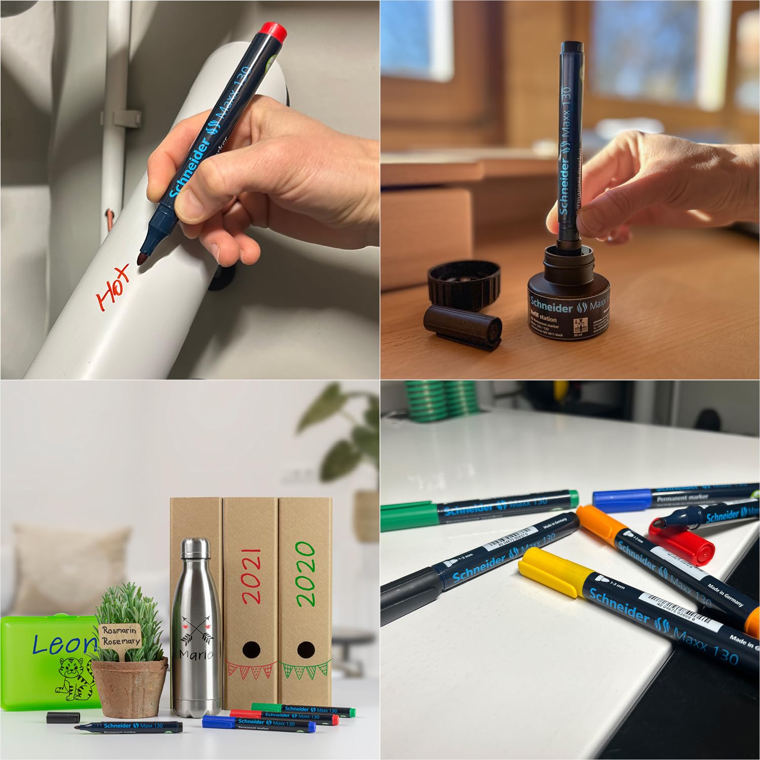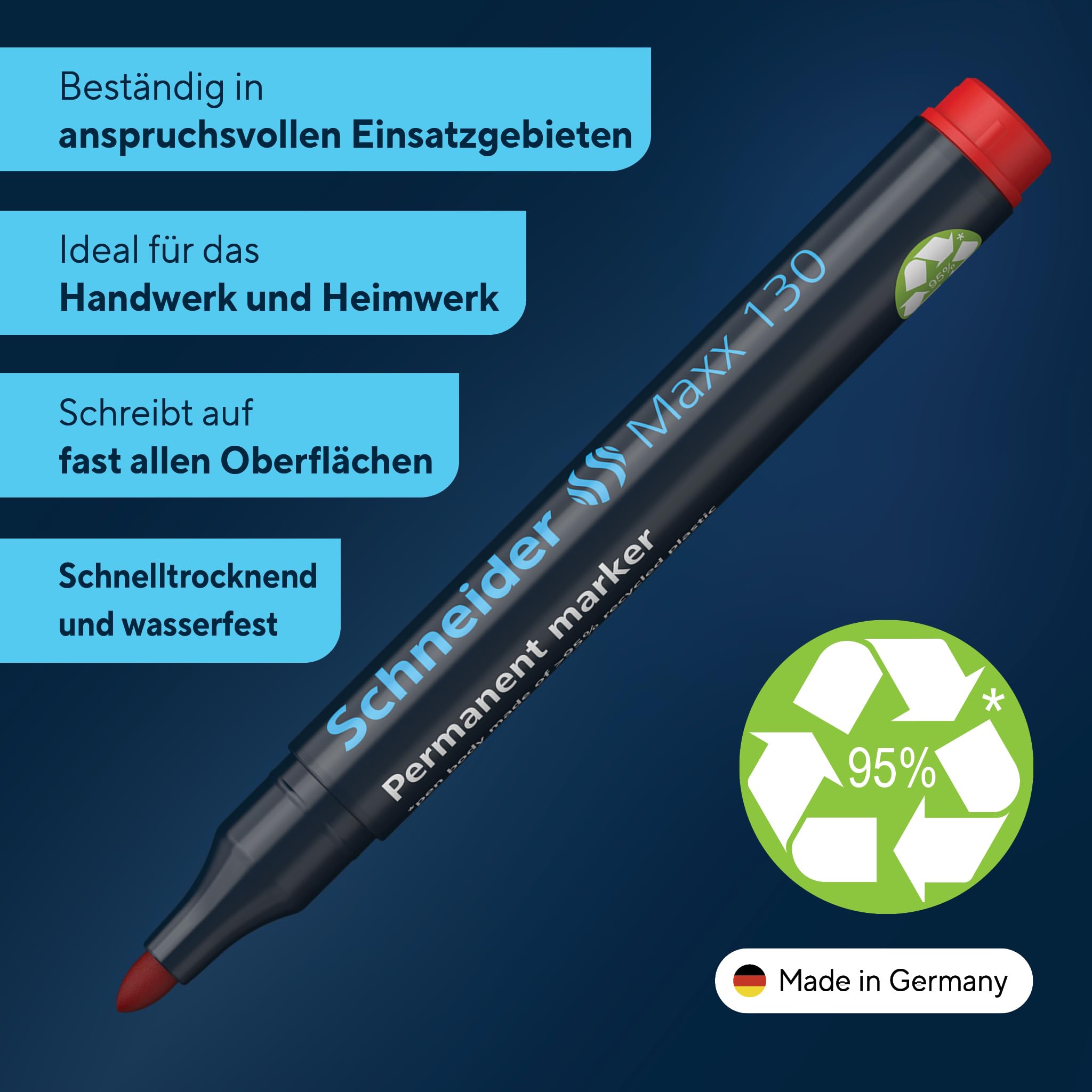 Schneider Permanent-Marker Maxx 130Rundspitze mit Strichstärke 1-3 mmFür Karton, Papier, Kunststoff, Glas, Metall, Holz u.v.mSchnelltrocknend, wasserfest, lichtbeständigGeruchsarm, ohne Toluol und XylolCap-Off-Tinte, kann 2-3 Tage offen bleibenNachfüllbar mit Maxx 640 refill stationPraktische ClipkappeDie Kunststoffteile der Gehäuse unserer Marker-Serie Maxx werden seit Mai 2019 mit einem Recyclatgehalt von > 95 Prozent in Serie hergestellt. Der eingesetzte Recycling-Kunststoff stammt aus spartenfremden Rohstoffquellen und ist frei von Schadstoffen und Belastungen.