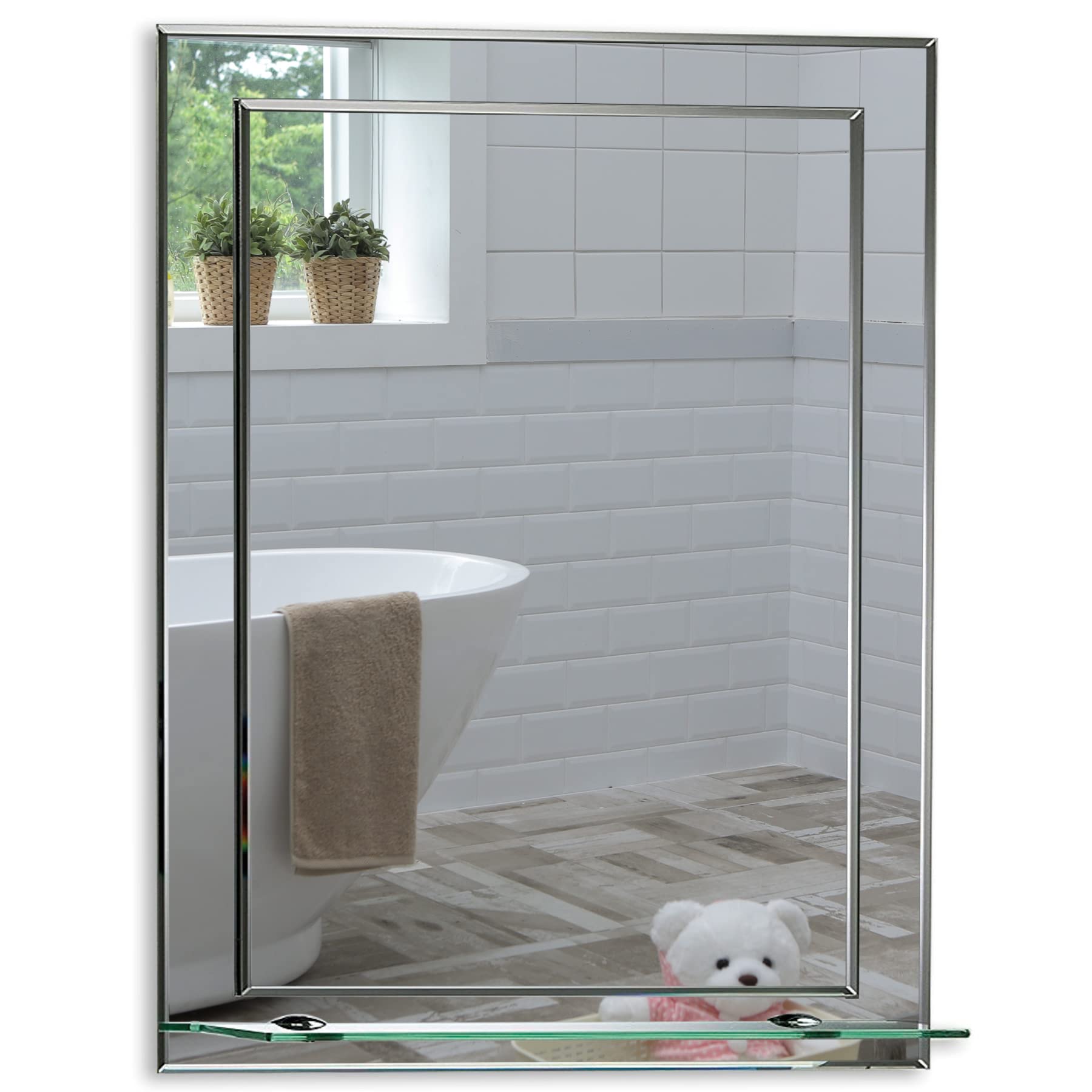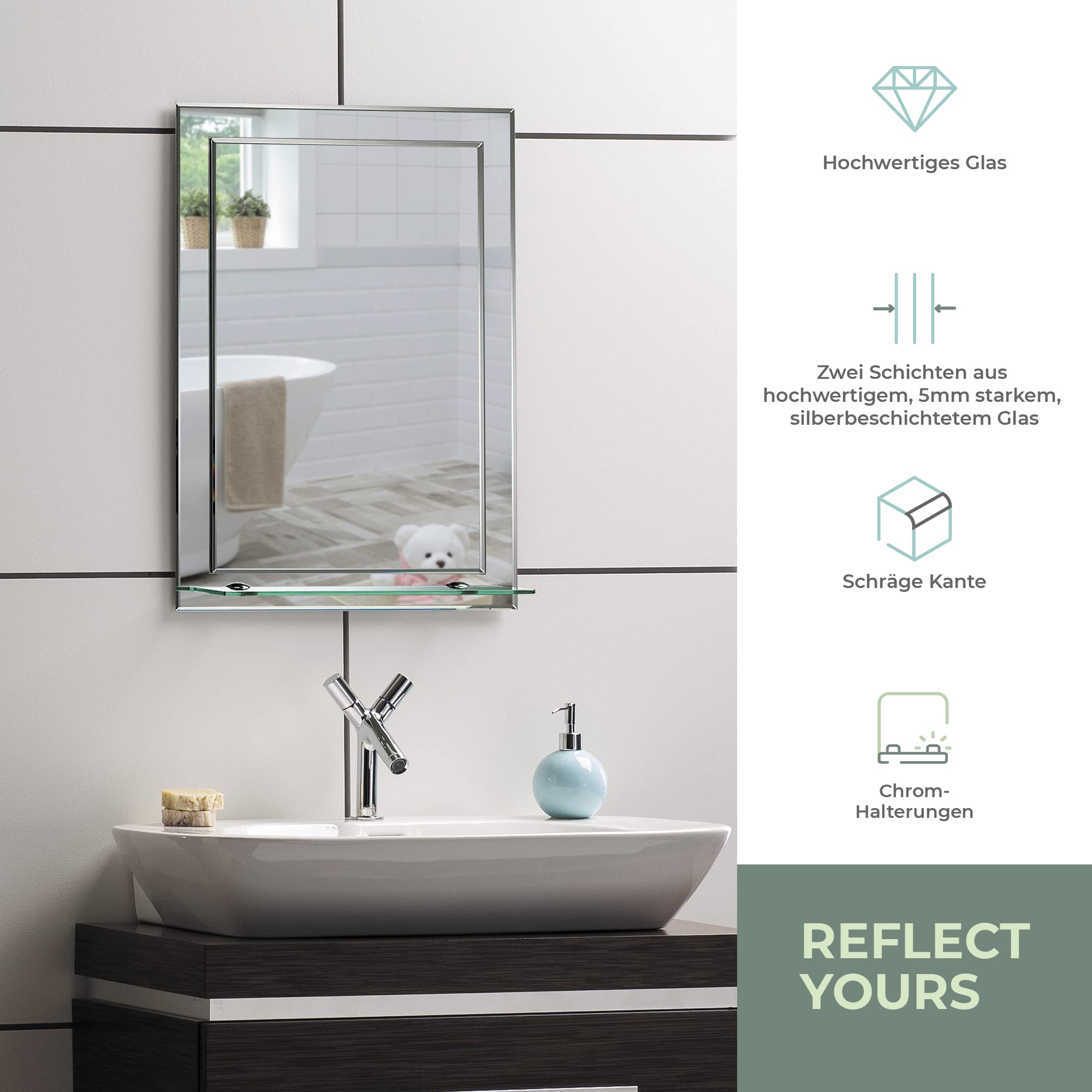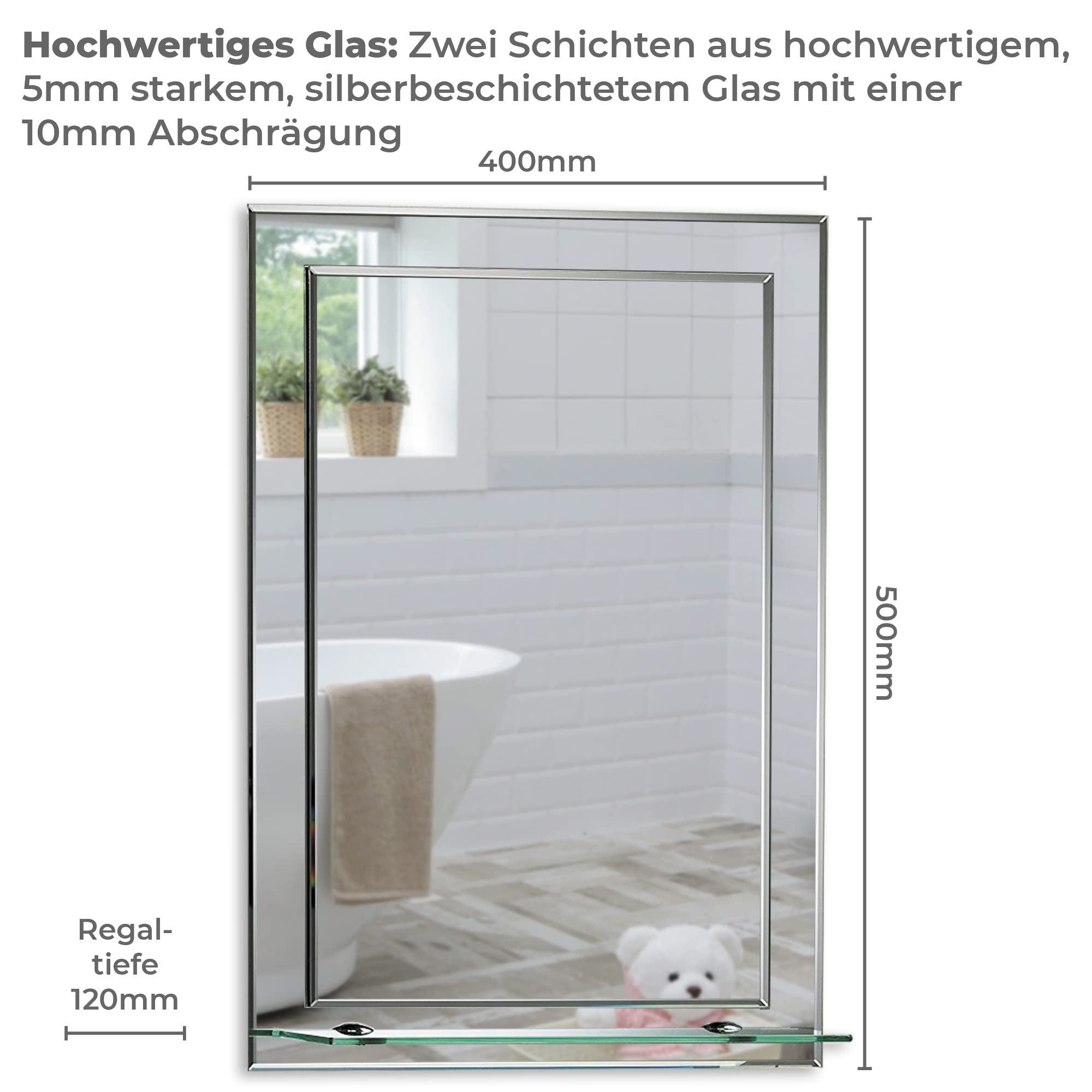 Schöner rechteckiger Badezimmerspiegel mit Ablage, modern und stylish, 2 Lagen Glass, mit abgerundeten Kanten, Wandbefestigung, Badspiegel, Wandspiegel, abgeschrägte Kante, Spiegel 50cm x 40cm