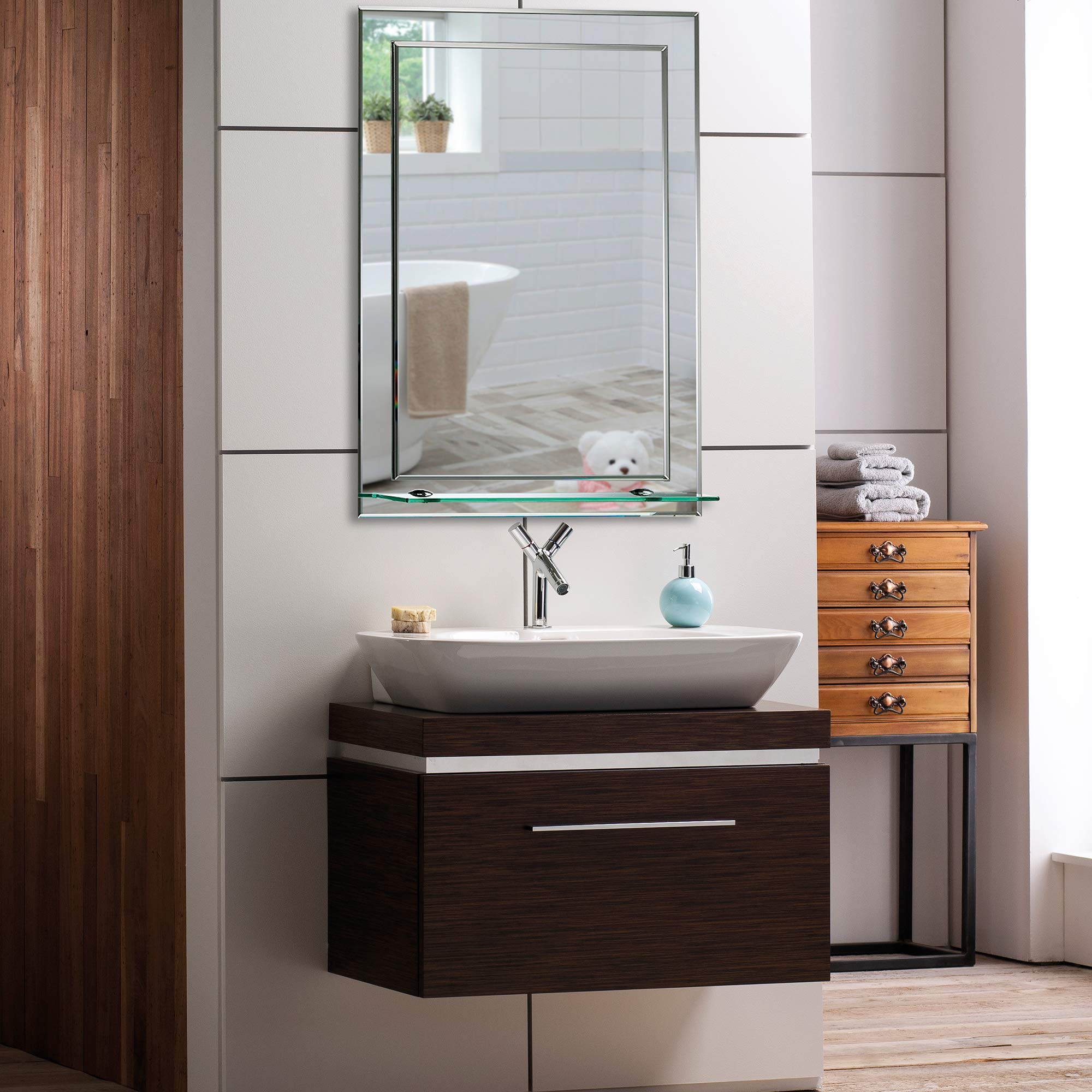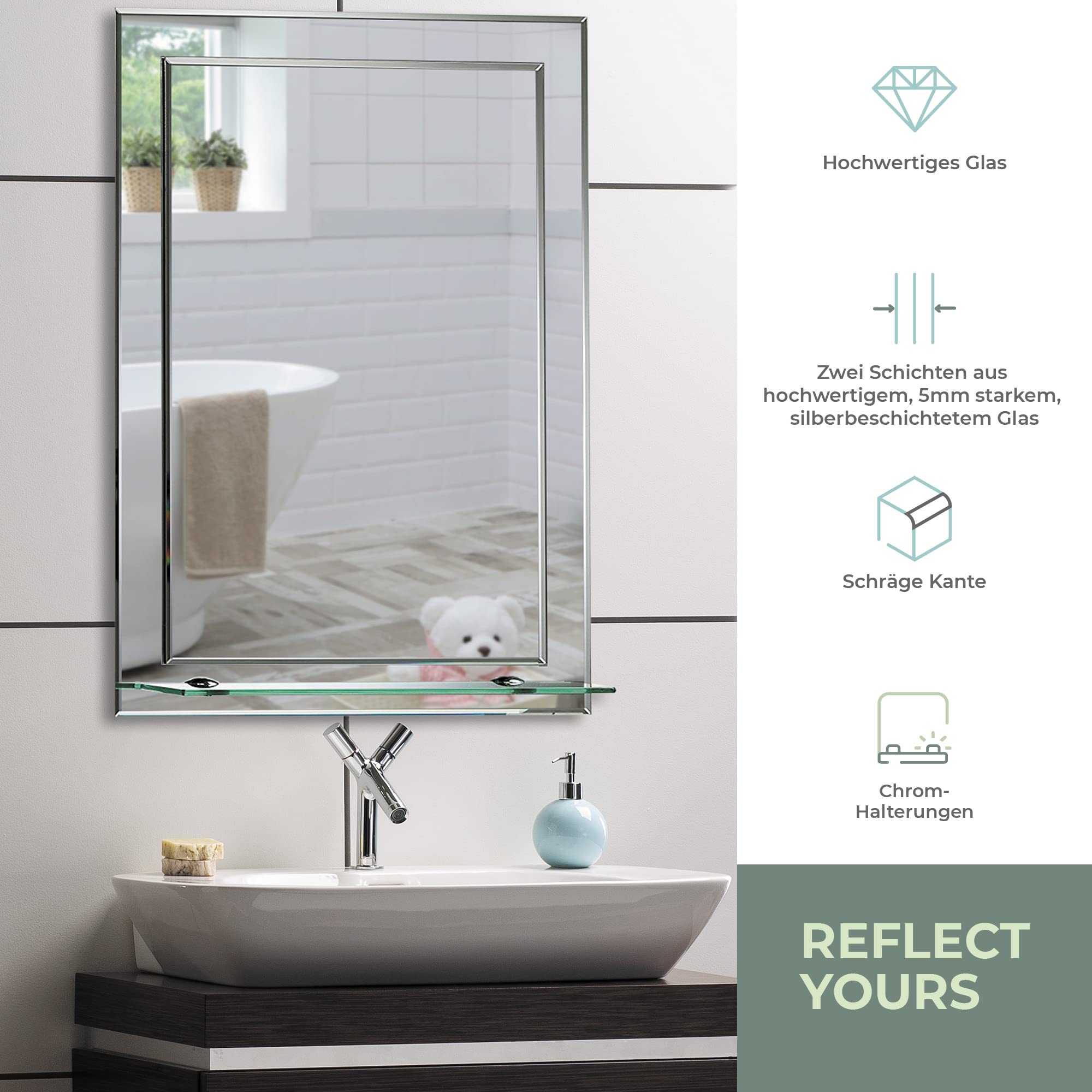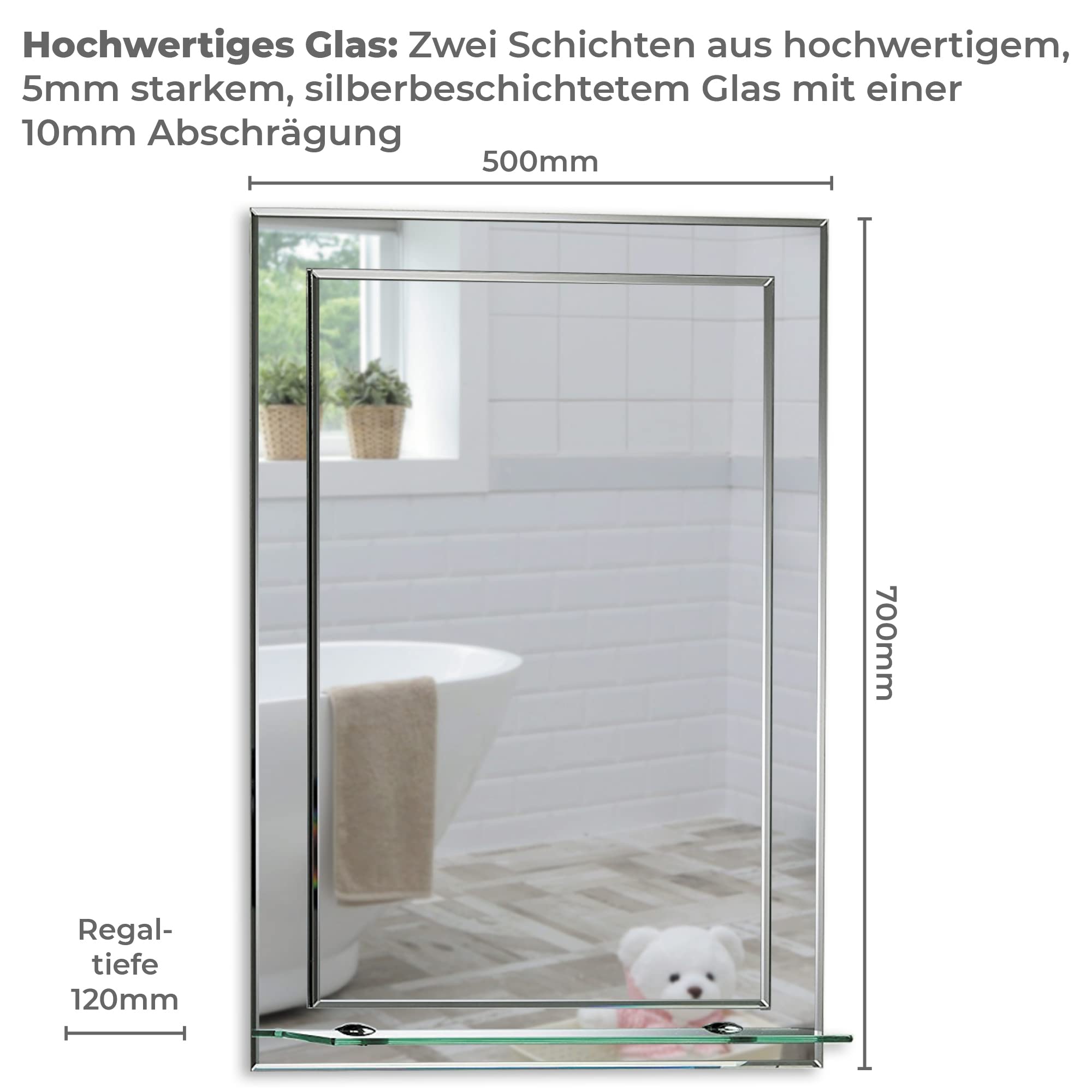 Schöner rechteckiger Badezimmerspiegel mit Ablage, modern und stylish, 2 Lagen Glass, mit abgerundeten Kanten, Wandbefestigung, Badspiegel, Wandspiegel, abgeschrägte Kante, Spiegel 70cm X 50cm