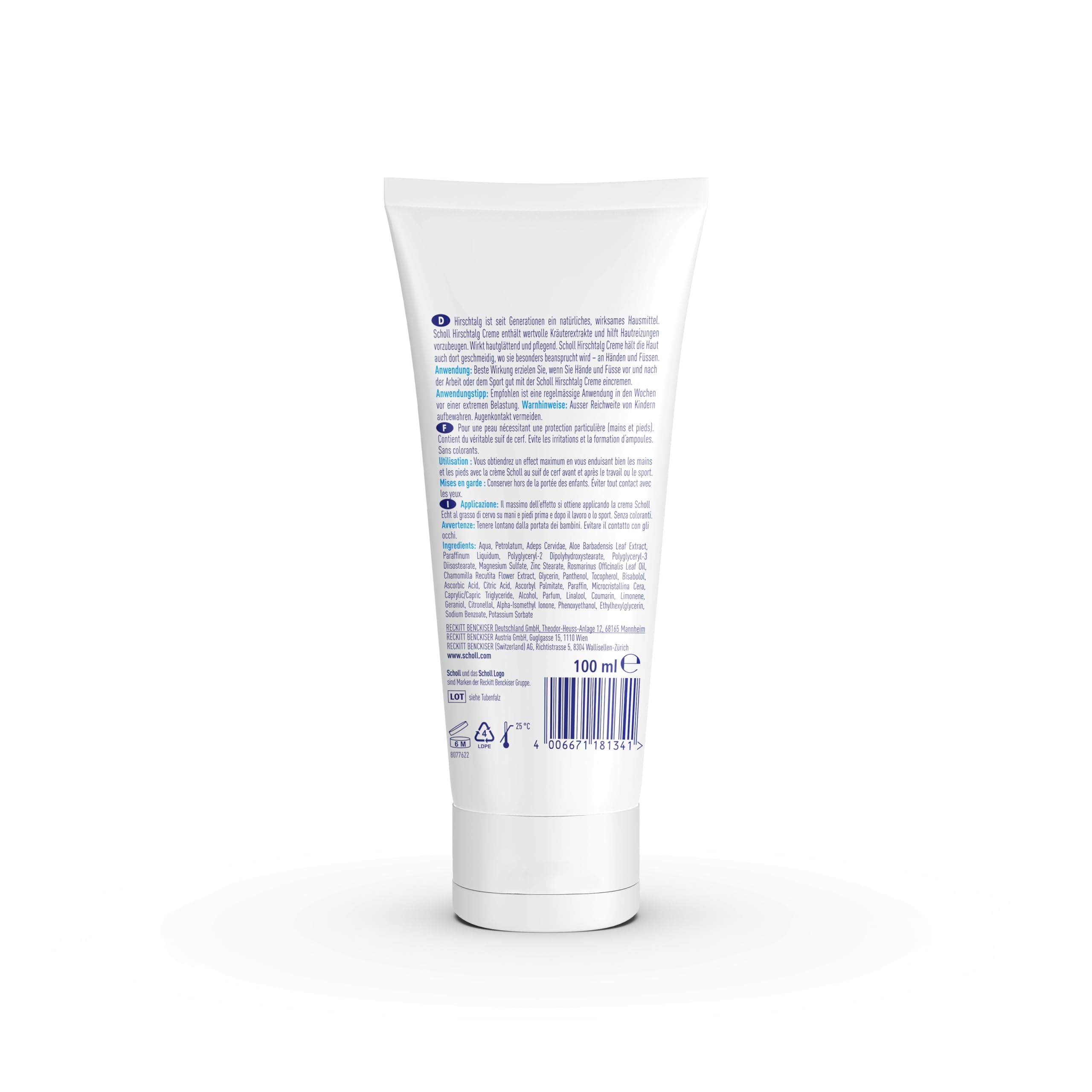 Mindestanzahl für die Bestellung von "Scholl Hirschtalgcreme, 100 ml – Fusscreme gegen Hornhaut, Feuchtigkeitspflege für Hände und Füsse" ist 1.