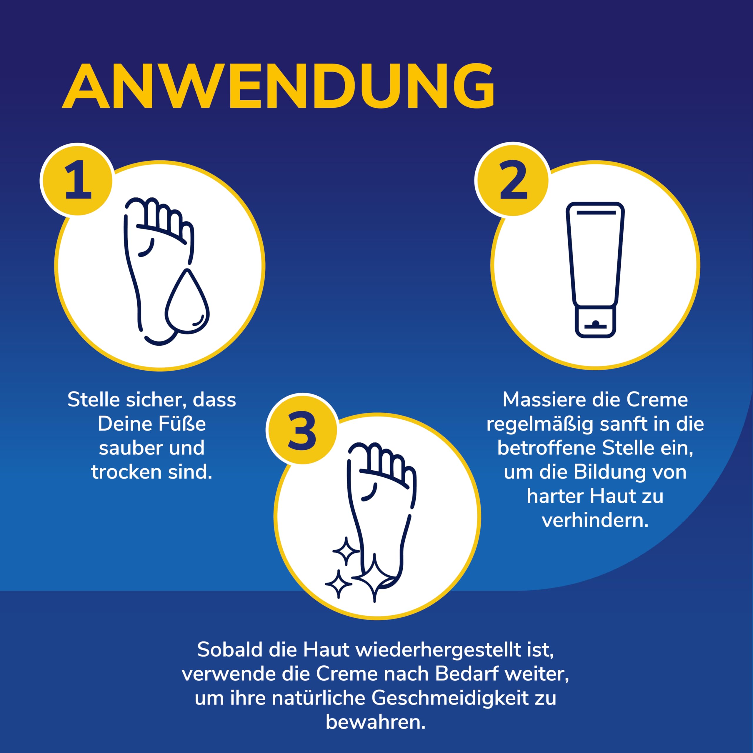 - Die Creme nach Bedarf auf die sauberen, trockenen Füsse auftragen.