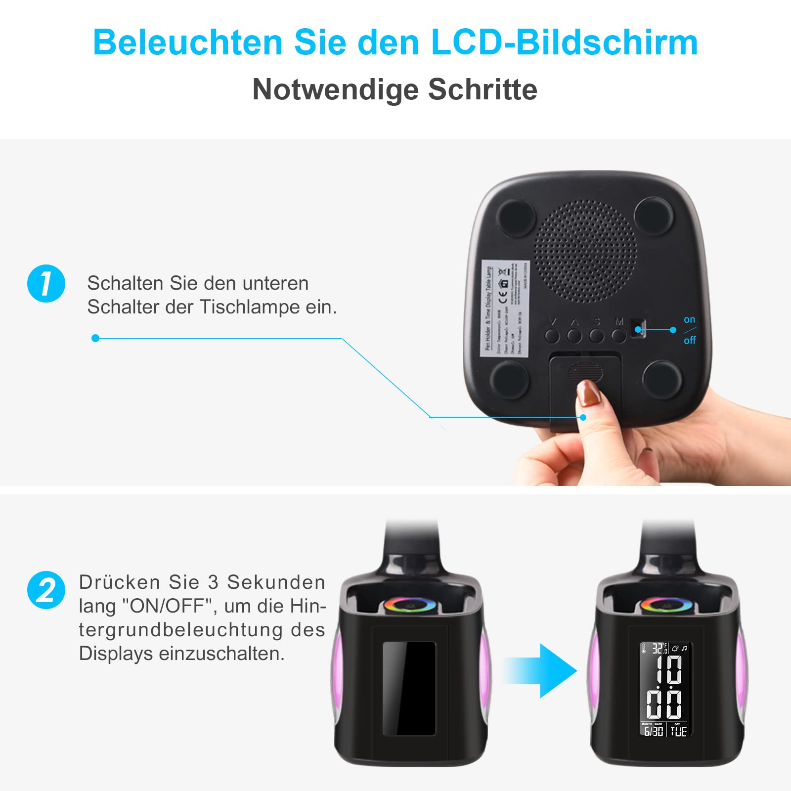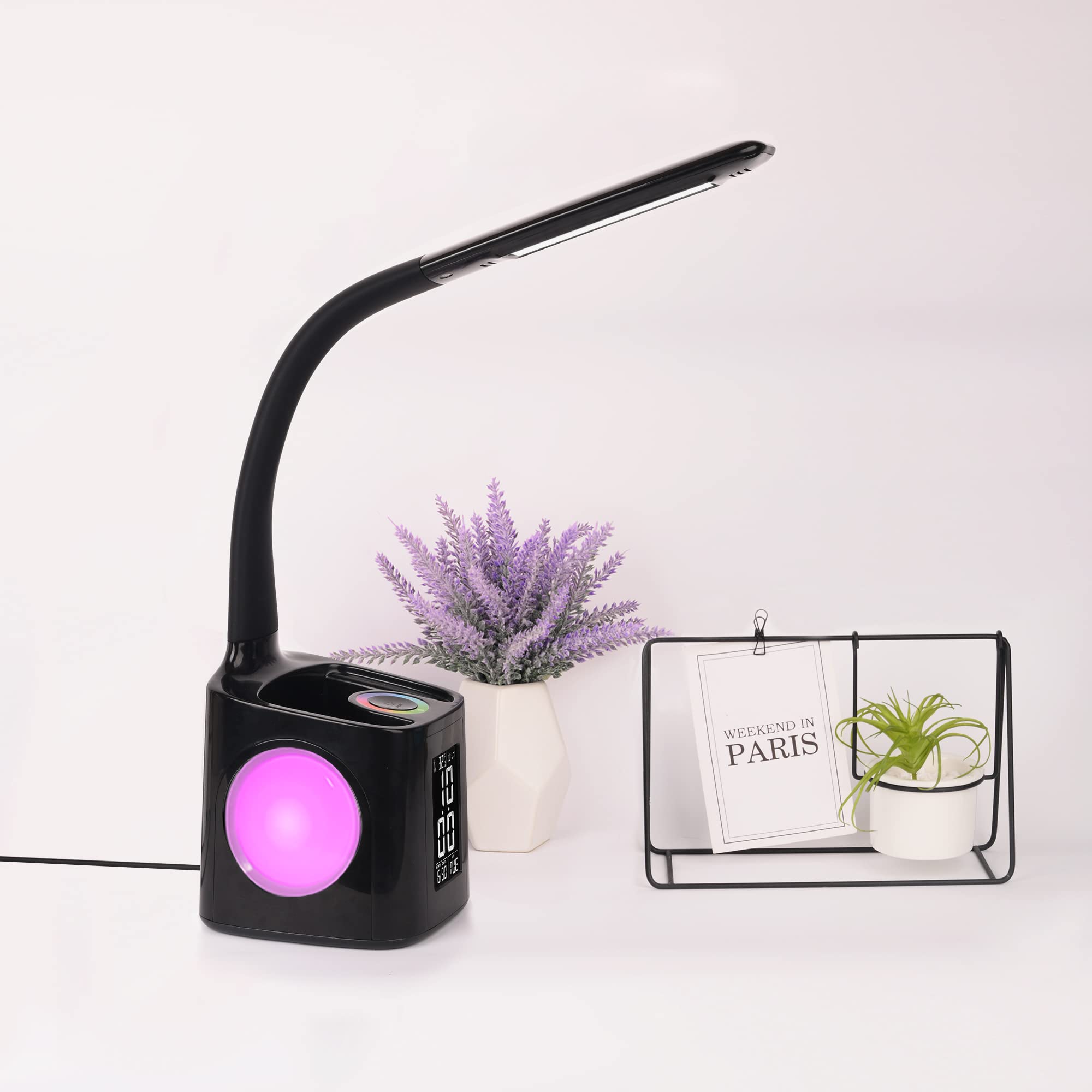 Die Wanjiaone Schreibtischlampe ist eine multifunktionale LED-Lampe, die ideal für Kinderzimmer oder Schlafzimmer geeignet ist. Mit ihrer modernen, rechteckigen Form und dem matten Schwarz Design passt sie perfekt in jeden Raum. Die Lampe ist mit einem farbwechselnden Nachtlicht, einem Stifthalter, einem USB-Ladeanschluss und einer Uhr mit Kontrollbildschirm ausgestattet. Die Schreibtischlampe ist dimmbar und verfügt über eine fortschrittliche LED-Lichtquelle Technologie und hohe Farbwiedergabe, die sanftes, natürliches Licht für Lesen, Arbeiten oder Studieren bietet. Die Lampe ist 40,7 cm hoch, 12,8 cm tief und 12,3 cm breit und wiegt 1,07 kg. Sie ist einfach zu installieren und eignet sich perfekt für die Verwendung auf einer Tischplatte.