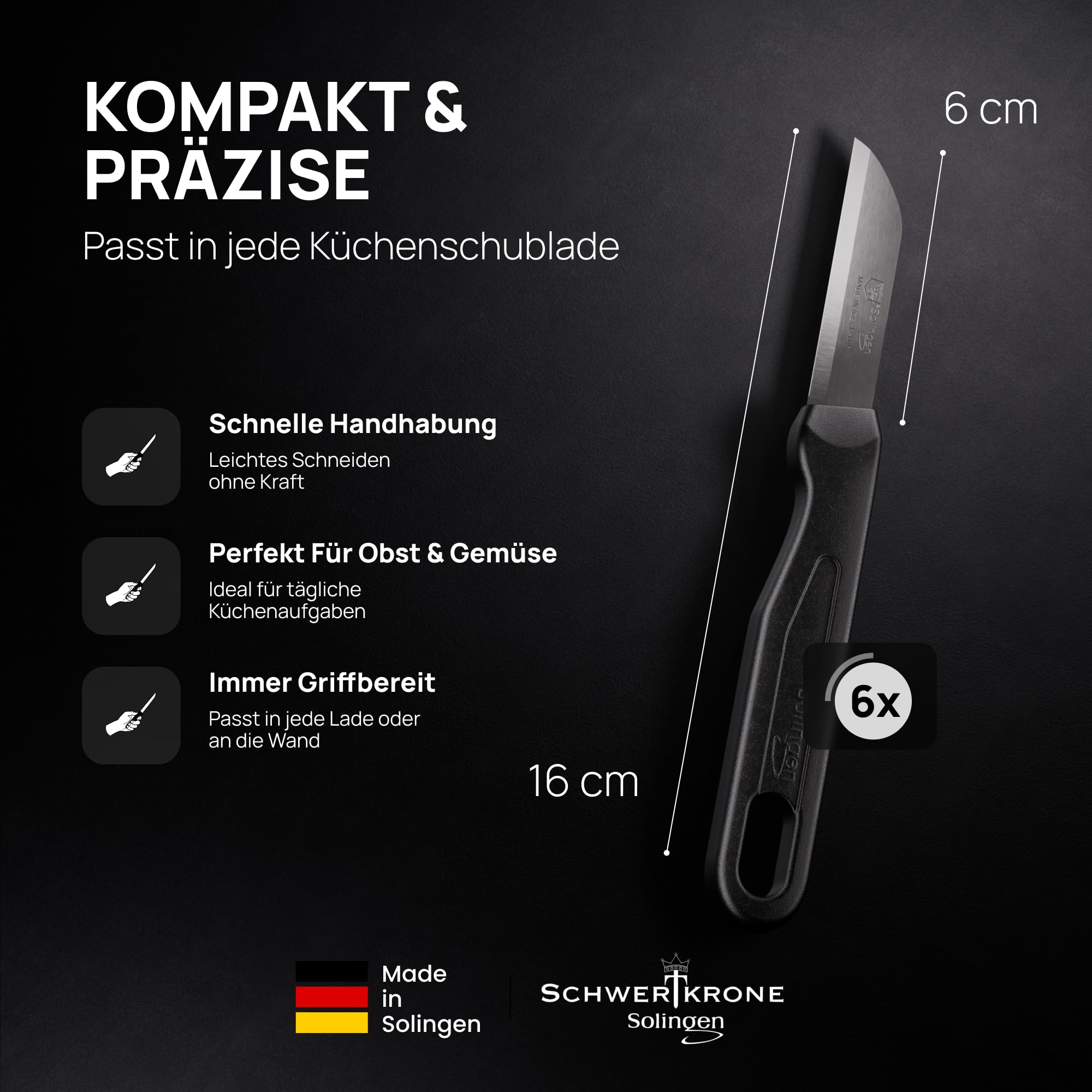 Schwertkrone Küchenmesser Set 6er Allzweckmesser Schälmesser Obstmesser Gemüsemesser sehr scharf Allesschneider Edelstahl rostfrei Solingen