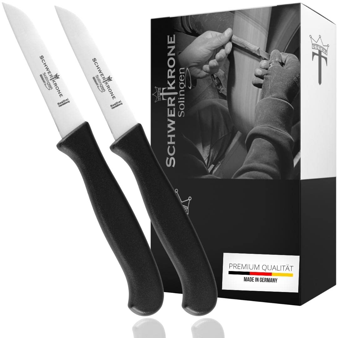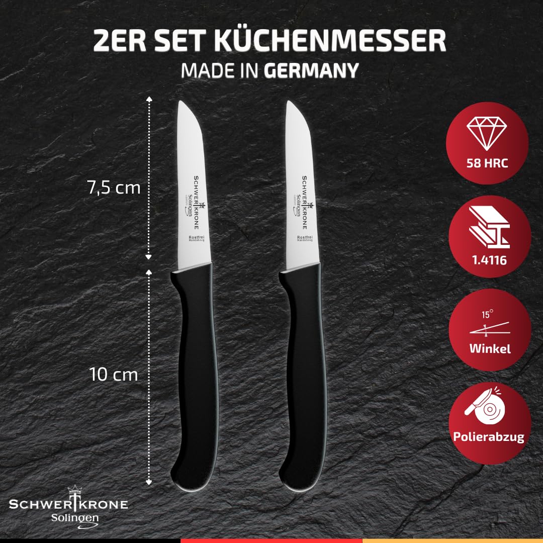 Schwertkrone® Schälmesser 2er Set [MADE IN SOLINGEN - GERMANY] - Gemüsemesser Obstmesser - Küchenmesser klein scharf - Schneidemesser Kartoffelschälmesser - Allzweckmesser rostfrei (2x7,5 cm gerade)