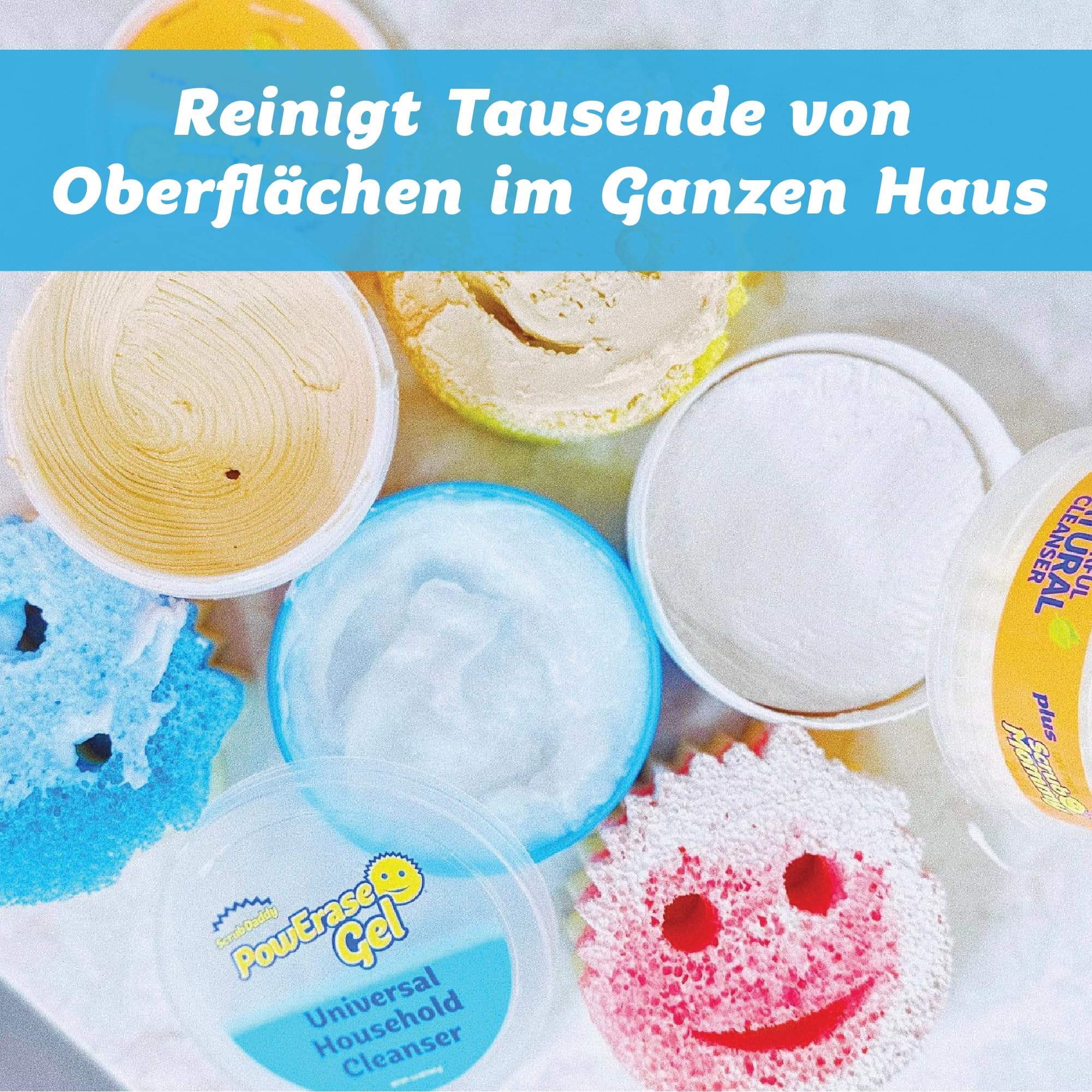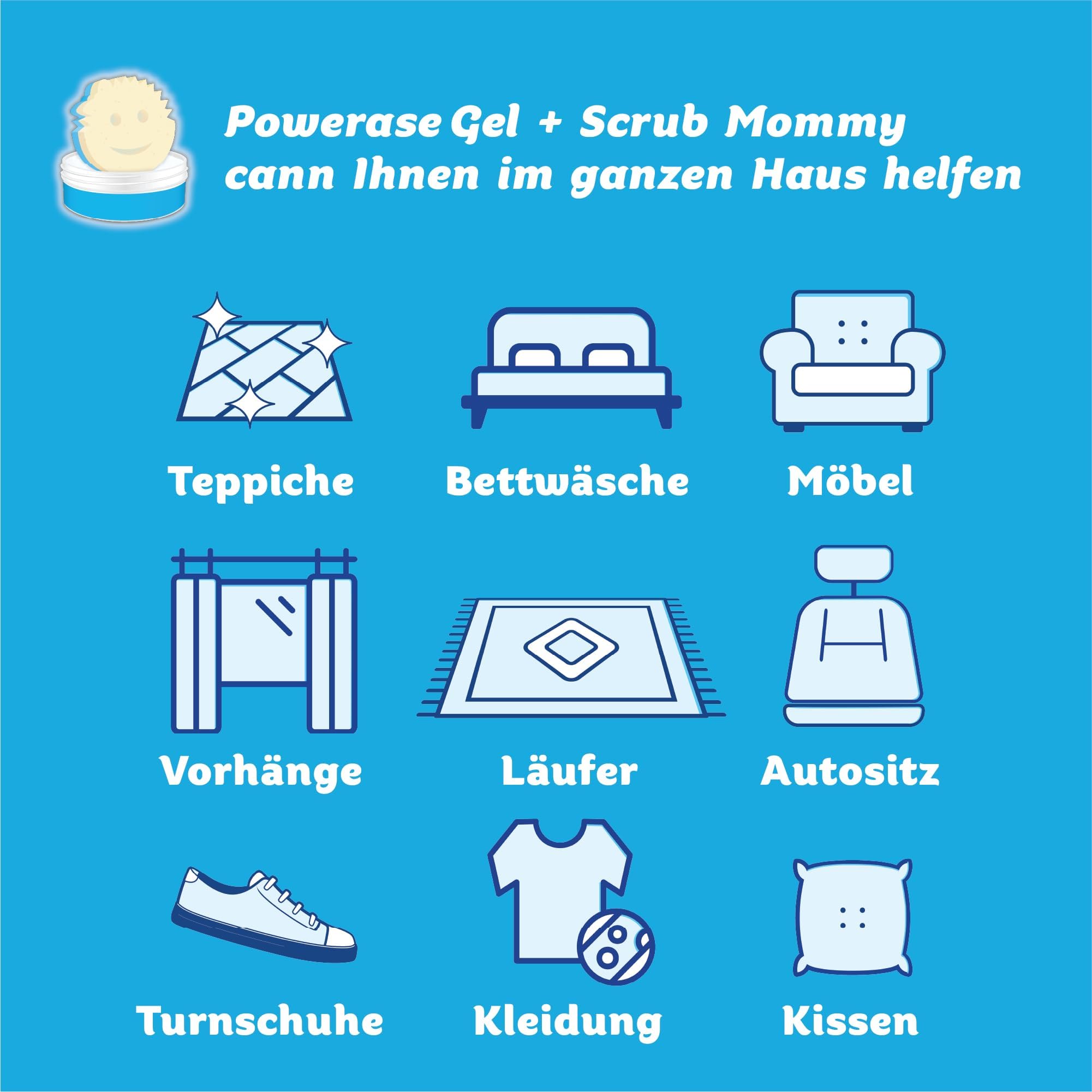 Scrub Daddy Powerase Gel - der ultimative Mehrzweckreiniger für den Haushalt, wurde für die mühelose Fleckenreinigung auf verschiedenen Oberflächen entwickelt. Dieses leistungsstarke Teppichreinigungsmittel ist Ihre Lösung für einen makellosen und frischen Lebensraum, das Schmutz sowohl auf Textilien als auch auf harten Oberflächen mühelos entfernt. Ganz gleich, ob Sie einen Lederfleckenentferner, einen erfrischenden Teppichreiniger, einen Sofa Reiniger oder einen Fettfleckenentferner benötigen, Powerase Gel ist die flexible Lösung, die sich an Ihre verschiedenen Reinigungsbedürfnisse anpasst. Besonders nützlich auch als Fleckenentferner für alte Flecken auf Textilien oder als Sportwaschmittel. Steigern Sie Ihr Engagement für Nachhaltigkeit mit unserer umweltfreundlichen Teppich Reiniger Formel. Mit einer ungiftigen Zusammensetzung und biologisch abbaubaren Inhaltsstoffen sorgt dieser universelle Polsterreiniger für Stoffsofas für einen grüneren Lebensstil und unterstützt Ihr Engagement für ein gesünderes Zuhause in jedem Aspekt Ihrer täglichen Routine. Dieses Oberflächenreinigungsmittel für Textilien und Polstermöbel eignet sich sowohl für die Vorwäsche als auch für die Handwäsche. Als Fleckenentferner für Autositze, Teppichreiniger und Textil Reiniger Sofa mit Scheuerschwamm Scrub Mommy bekämpft er mühelos Schmutz und Flecken und bietet Ihnen eine vielseitige Auswahl, die sich den unterschiedlichen Reinigungsherausforderungen für jede Oberfläche in Ihrem Zuhause anpasst - einschliesslich Teppich, Sofa, Waschbecken und Badezimmer. Für einen umfassenden und effizienten Reinigungsansatz ist Scrub Daddy Powerase Gel mit dem Scrub Mommy Schwamm ein kraftvoller, schnell wirkender Fleckenentferner. Das Reinigungs-Duo wurde sorgfältig entwickelt, um Ihnen als idealer Couch Reiniger oder Matratzenreiniger und Polsterfleckenentferner zu dienen.