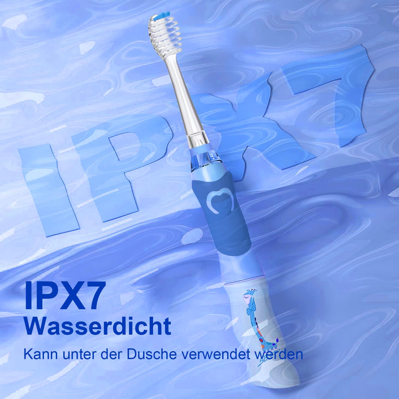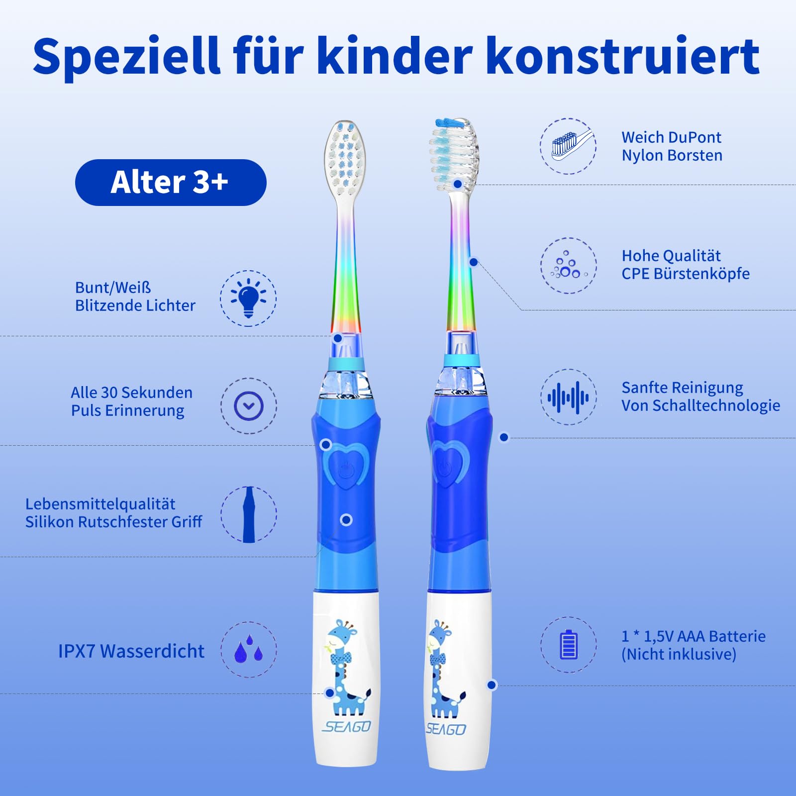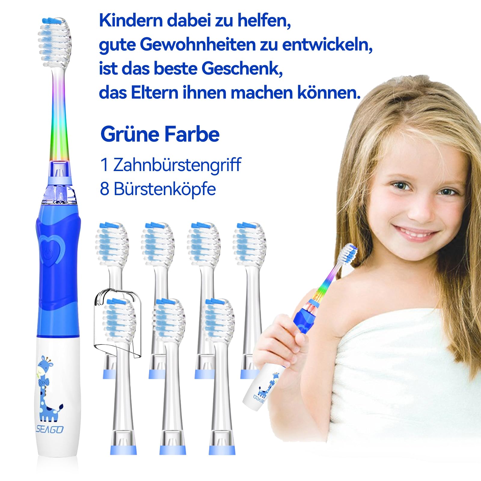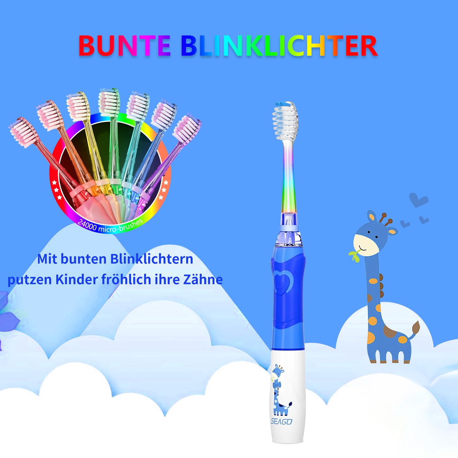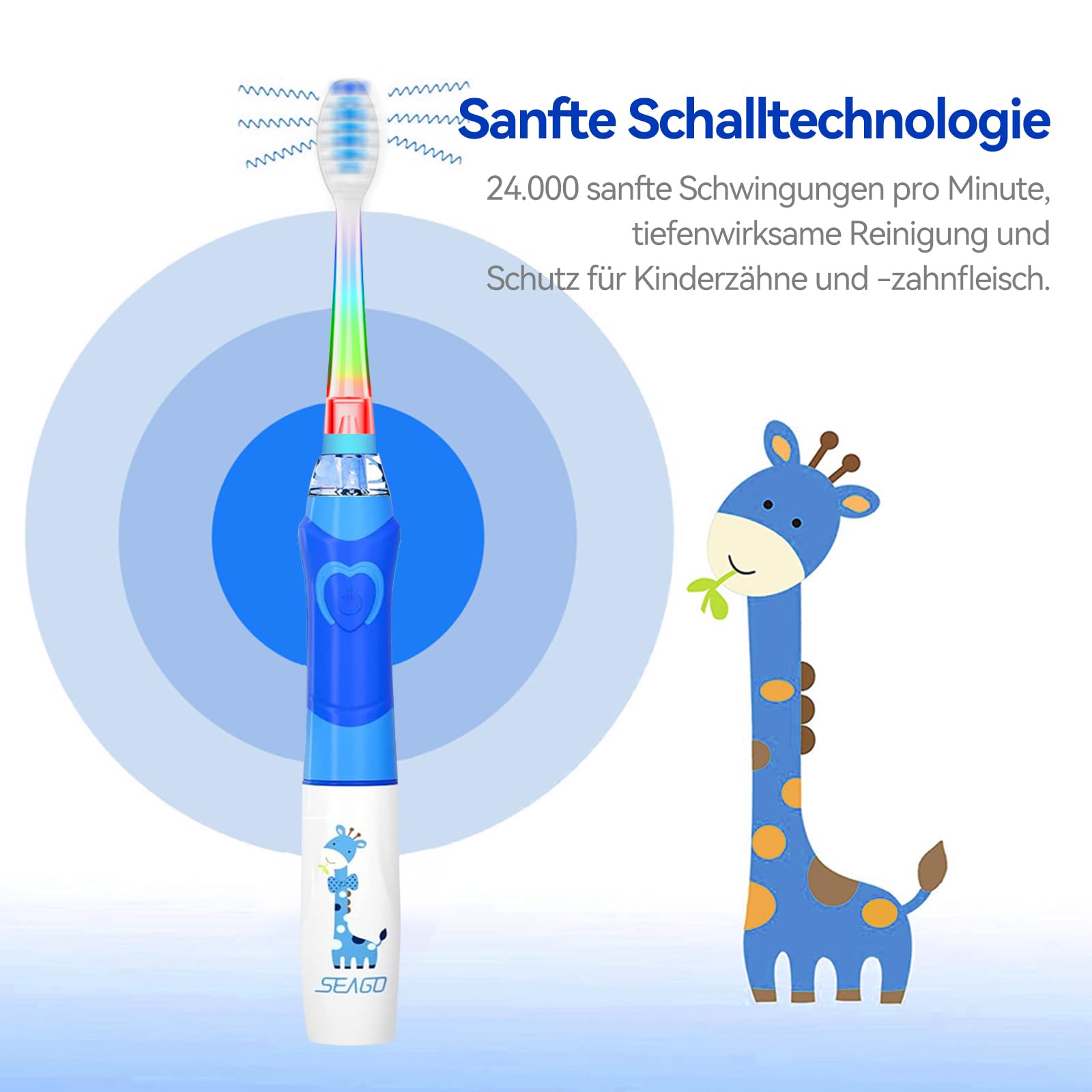 Die Seago SG-977 Elektrische Zahnbürste Kinder speziell für Kinder von 3-12 Jahren. Schlüsselmerkmale: Sicherheit: Sanften Schallvibrationen, abgerundeten Weiche Borsten, lebensmittelechte Materialien. Effektivität: 24.000 VPM, 2-Minuten-Timer, Weisse LED-Beobachtungslicht. Spass: Regenbogenlicht und Giraffen-Griff bringt viel Spass beim Bürsten. Einfach: Ein Knopf, ein Klick, einfach zu bedienen. Praktisch: IPX7 wasserdicht, lange Batterielaufzeit (nicht im), Auswechselbarer Bürstenkopfe.