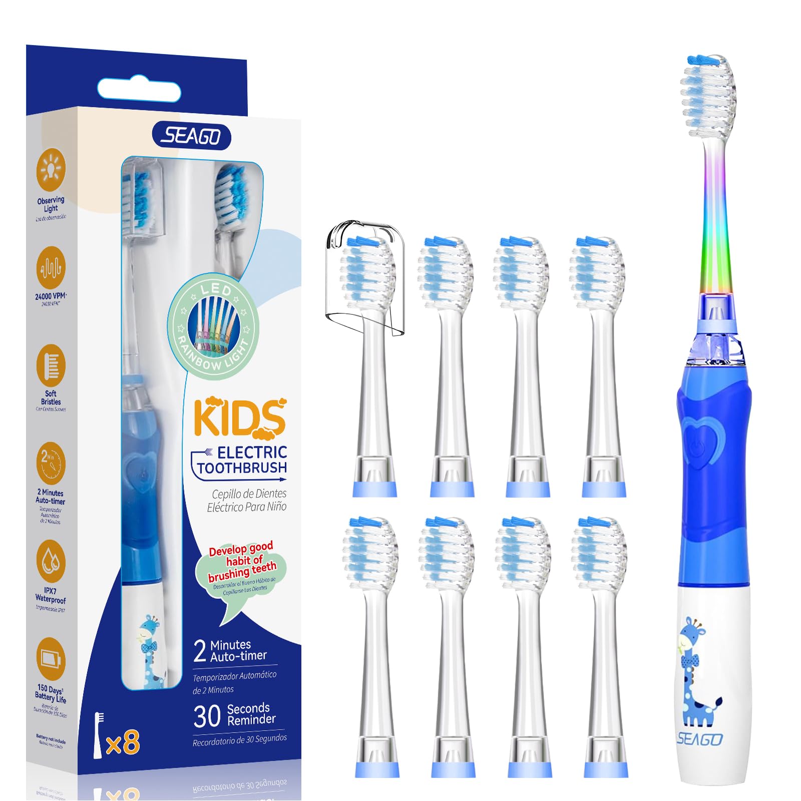 Seago Elektrische Zahnbürste Kinder ab 3-12 jahre Kinderzahnbürsten Elektrisch mit Farbigem Licht Smart Timer 8 Weich Bürstenköpfes Wasserdicht Baby Schallzahnbürste SG977 (Blau-8)
