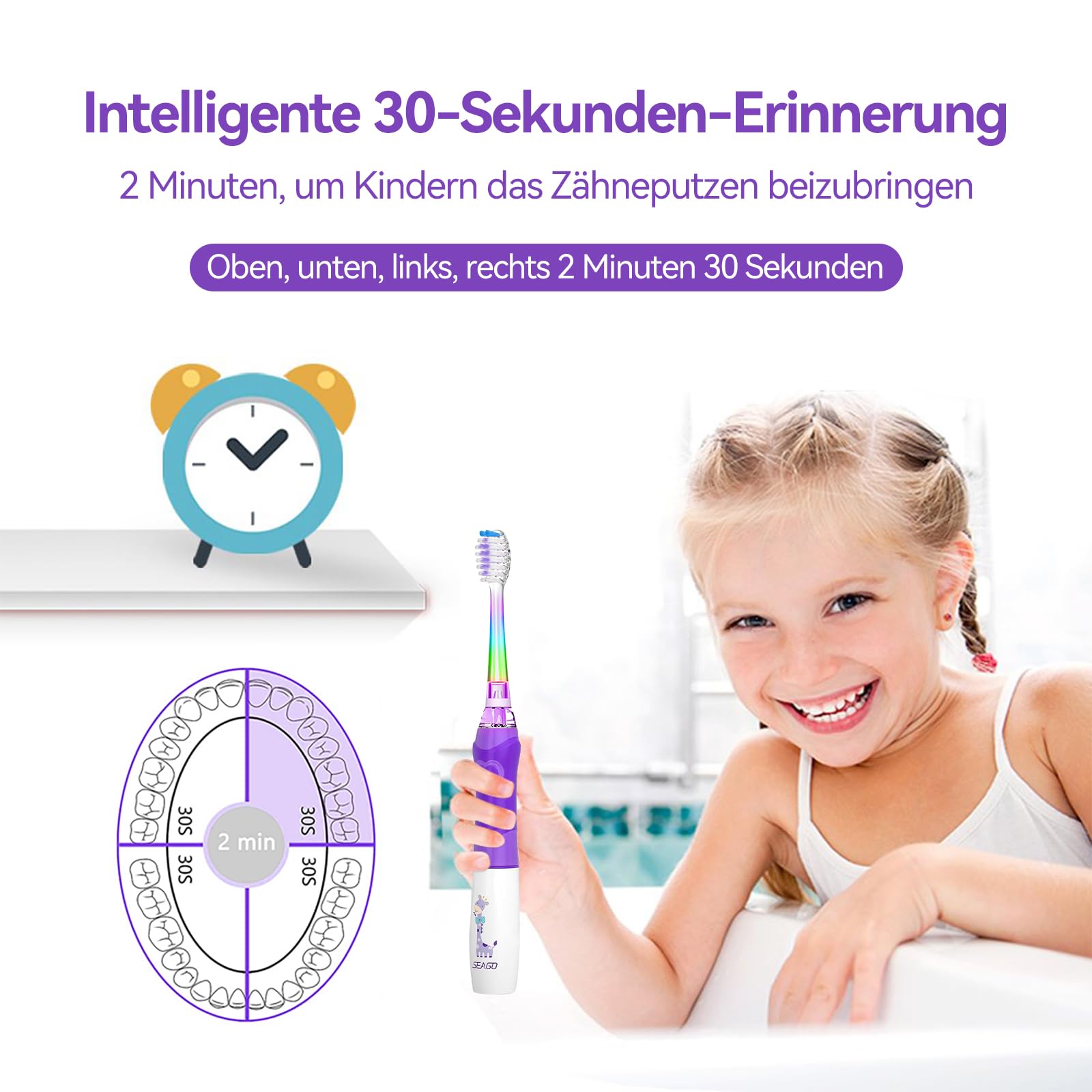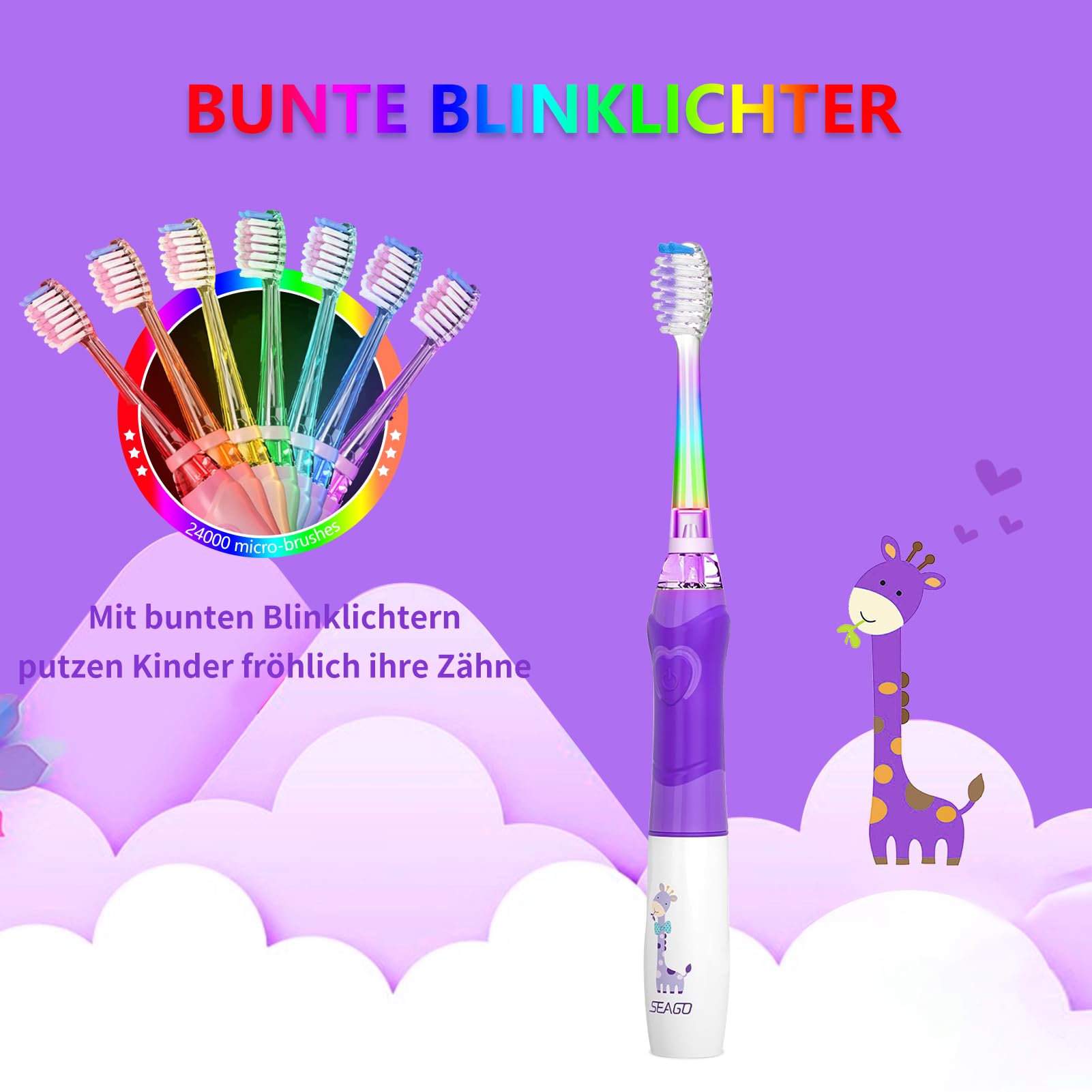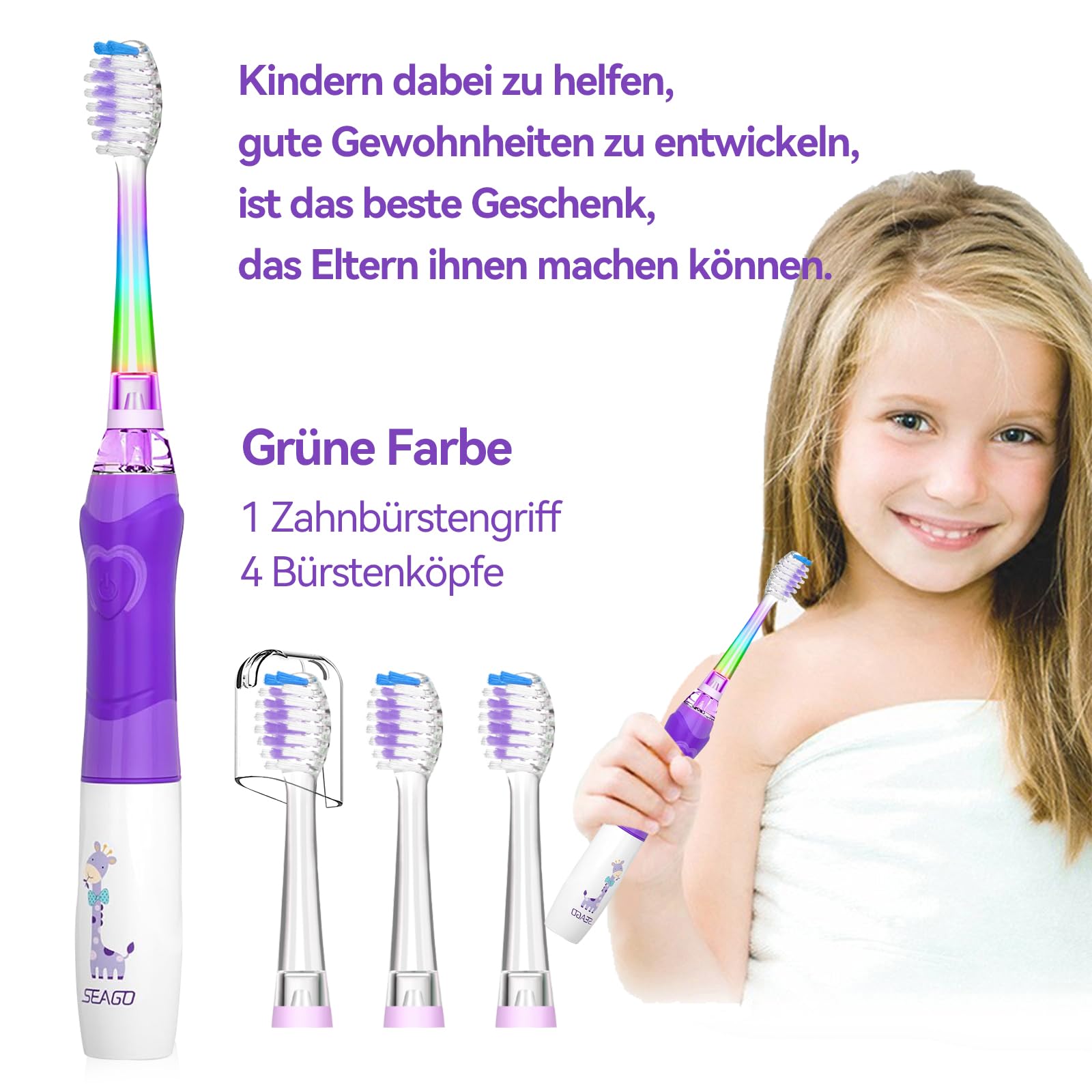Seago Elektrische Zahnbürste Kinder ab 3-12 jahre Kinderzahnbürsten mit Farbigem Licht Smart Timer 4 Weich Bürstenköpfes Wasserdicht Baby Schallzahnbürste für Mädchen Jungen SG-977 (Violett-DE)