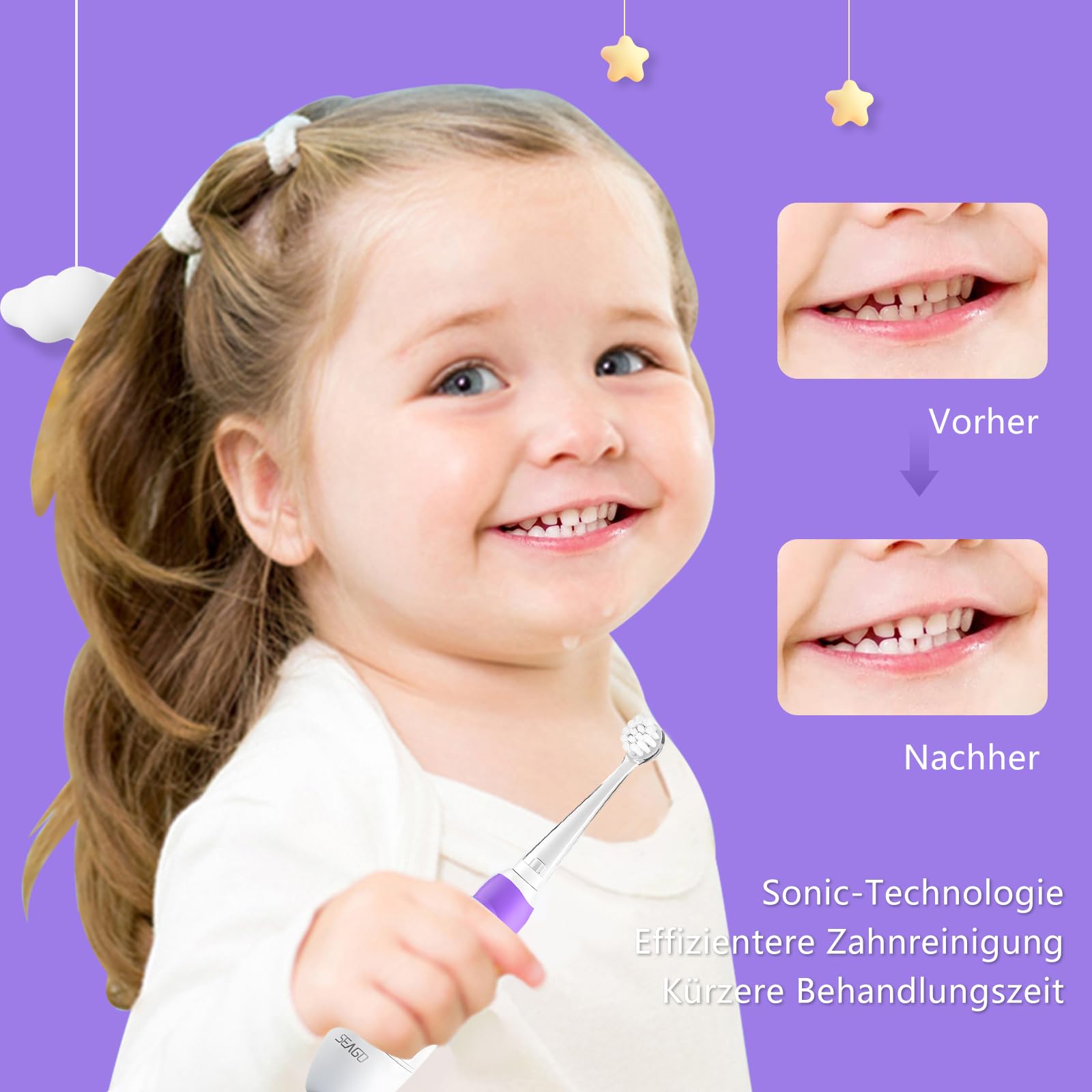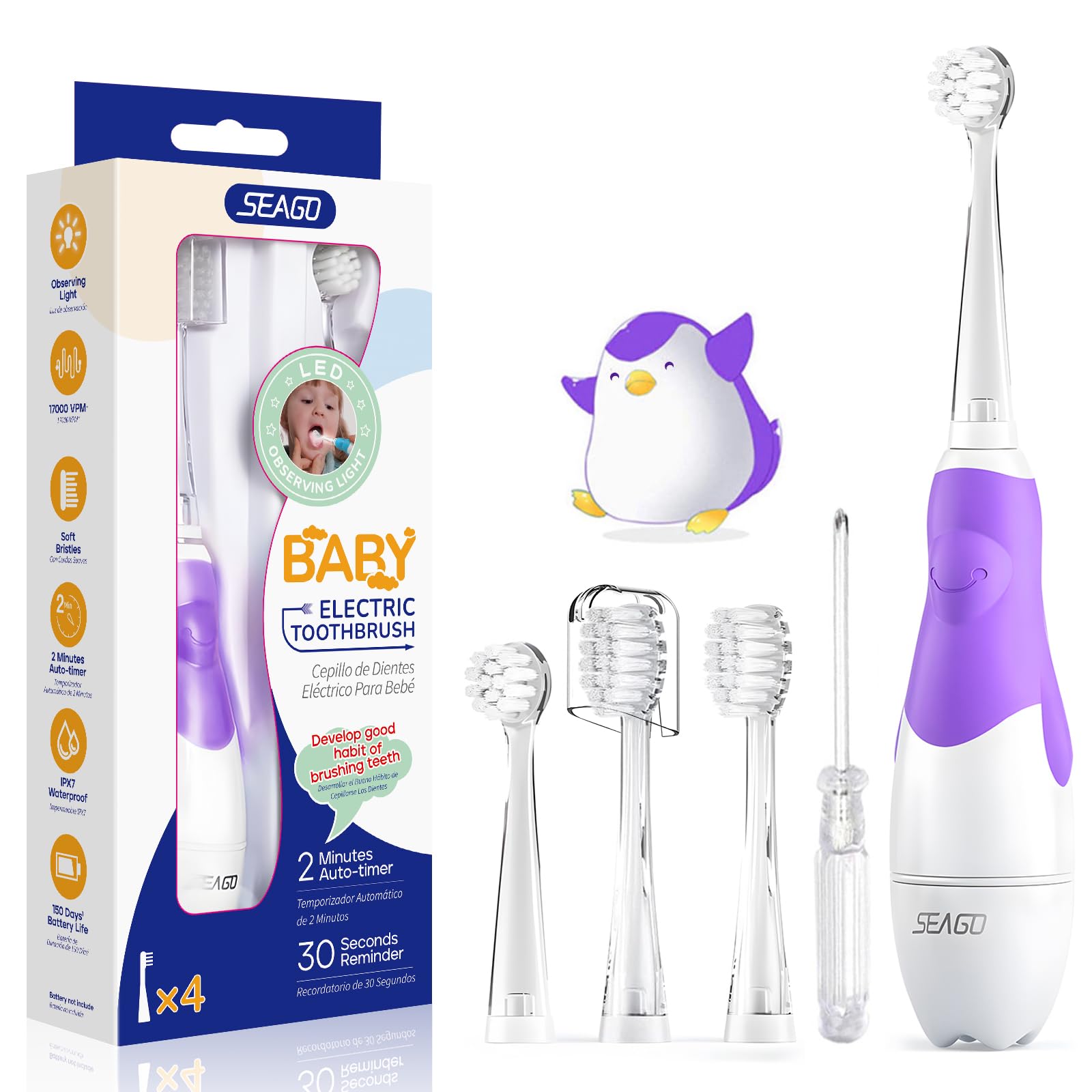 Seago SG-513 Elektrische Zahnbürste Kinder Baby Kinderzahnbürste Elektrisch ab 0-3 Jahre mit LED Licht Smart Timer Babyzahnbürste Wasserdicht IPX7 Schallzahnbürste (Baby Violett)