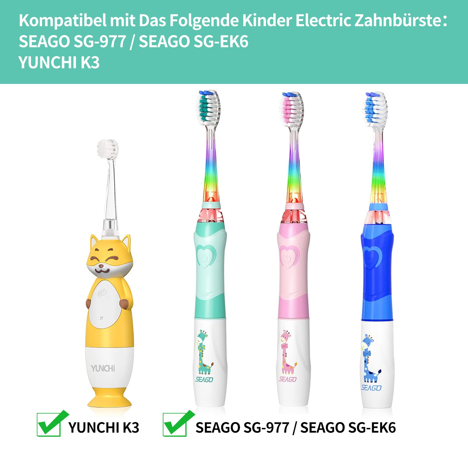 Seago SG977 SGEK6 Ersatzbürsten kompatibel mit YUNCHI K3 Kinder Elektrische Zahnbürste 4 Stück Weich Aufsteckbürsten Ersatzköpfe (4 Grosse Bürstenköpfe)
