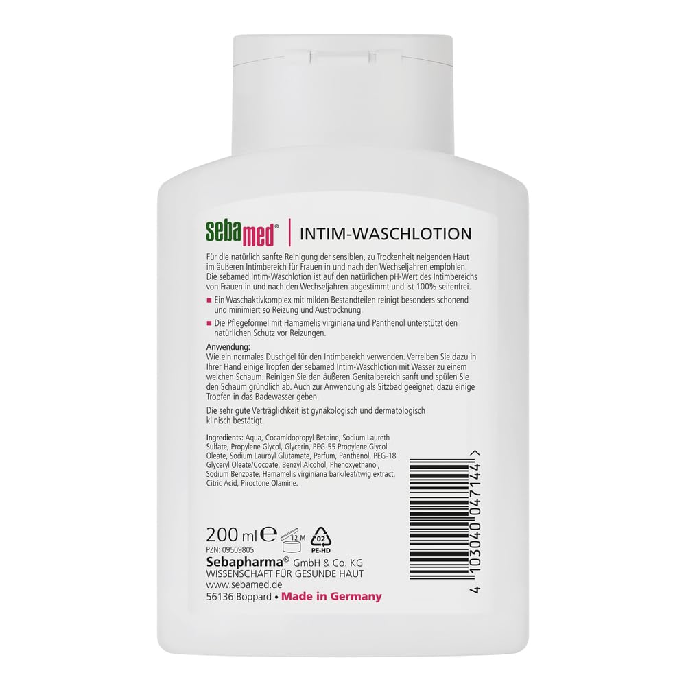 Die sebamed Intim Waschlotion wurde fuer die natuerlich sanfte Reinigung der sensiblen, zu Trockenheit neigenden Haut im aeusseren Intimbereich entwickelt. Sie richtet sich speziell an Frauen in und nach den Wechseljahren und ist auf die veraenderten Anforderungen dieser Lebensphase abgestimmt.