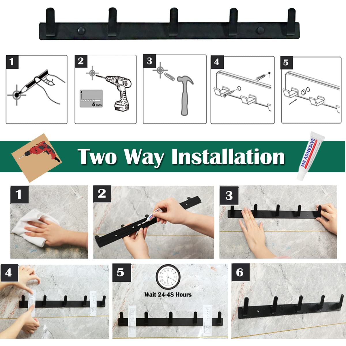 BeschreibungDie an der Wand montierte Kleiderhakenleiste von Sevenpers kann in Ihrem Wohnzimmer, Schlafzimmer, Badezimmer oder Ihrer Küche angebracht werden, um viele Dinge wie Schlüsselhaken, Taschenhalter, Garderobenständer und Handtuchhalter aufzuhängen. Die Hakenleiste mit einfachem, aber funktionalem Design kann Ihnen helfen, Ihr Zimmer aufzuräumen und gemütlich zu machen.SpezifikationMaterial: MagnesiumaluminiumLänge der 5 Hakenleiste: 17,12 ZollHakenabstand: 3,38 ZollF: Wie wird sie installiert?A: Zwei Möglichkeiten zur Auswahl.Methode 1: Klebstoff verwenden ?Wischen Sie die Oberfläche der Kleiderhaken und der Wand ab.?Legen Sie das Produkt an die Wand und markieren Sie die Position. ?Tragen Sie Klebstoff auf die Unterseite des Produkts auf.?Kleben Sie es an die Wand und befestigen Sie es mit dem Hilfsaufkleber. ?Entfernen Sie den Hilfsaufkleber nach 48 Stunden.Methode 2: Bohrer verwenden?Wischen Sie die Oberfläche der Kleiderhaken und der Wand ab.?Legen Sie das Produkt an die Wand und markieren Sie die Position der Löcher.?Bohren Sie Löcher entsprechend der markierten Position. ? Klopfen Sie die Dübel in die Löcher und drehen Sie die Schrauben fest. Gute Tipps: Wenn Sie die Kleiderhaken mit Klebstoff an die Wand kleben, hängen Sie 24–48 Stunden nach der Montage nichts auf. Sie können den QR-Code in der Verpackung scannen, der Ihnen bei der Verwendung des Klebstoffs und des Hilfsaufklebers hilft. Das maximale Hängegewicht der Kleiderhaken darf 40 Pfund nicht überschreiten. Lieferumfang: 1 × schwarze Kleiderhaken zur Wandmontage, 2 × Dübel, 2 × Schrauben, 2 × Schraubenabdeckungen, 1 × Klebstoff, 2 × Hilfsaufkleber (mit Montageanleitung).