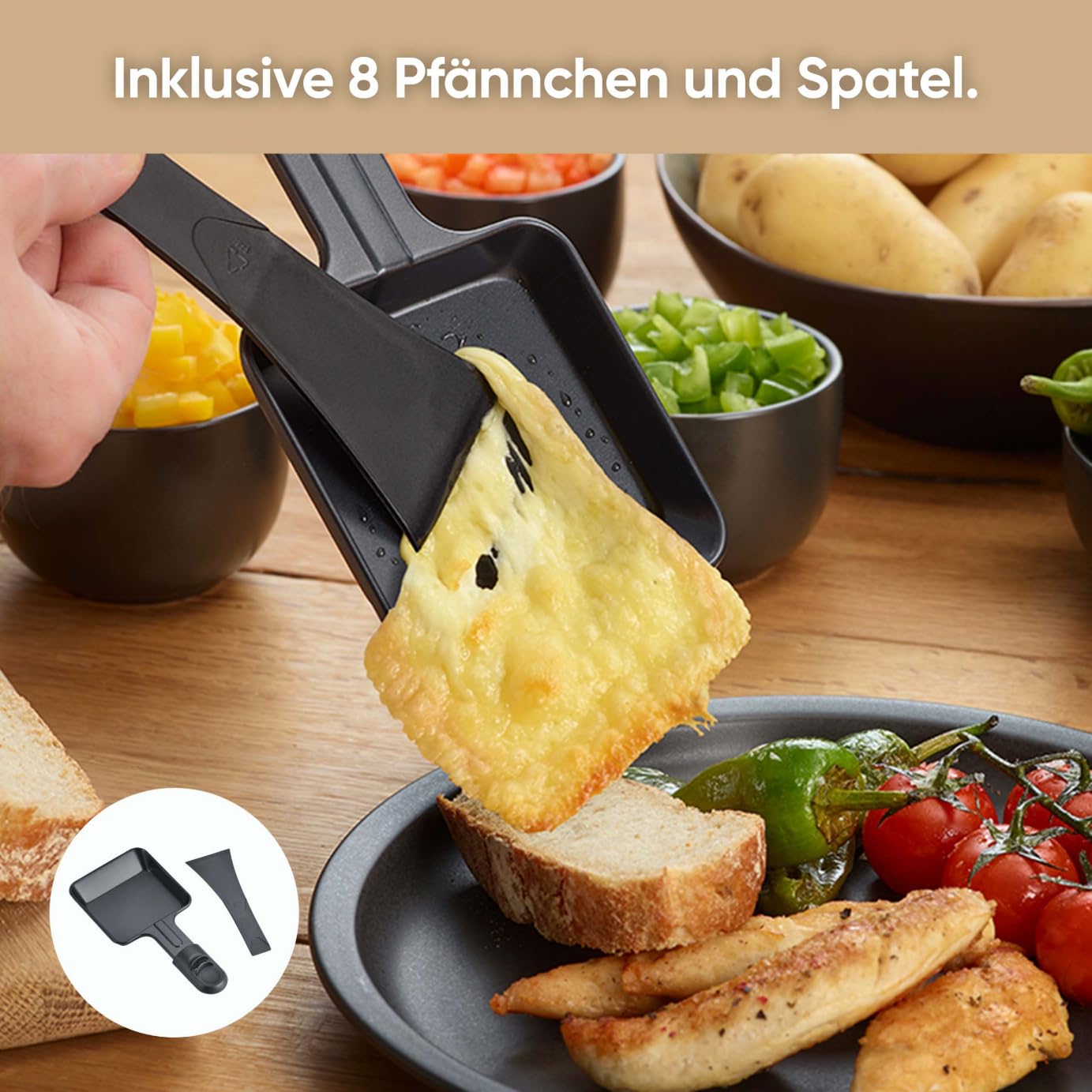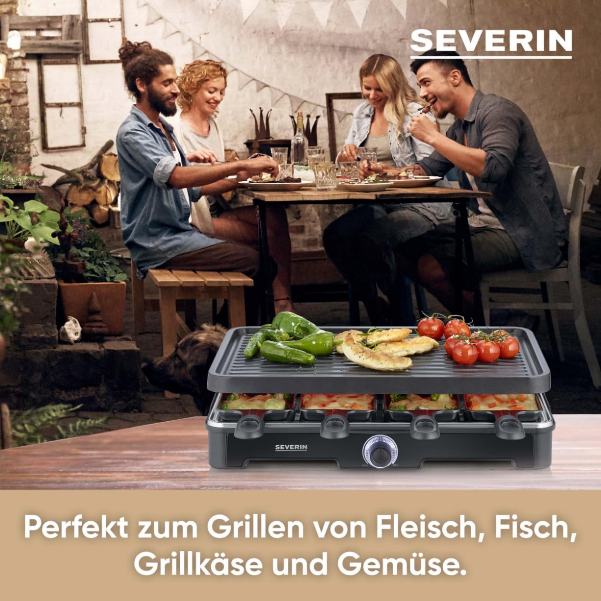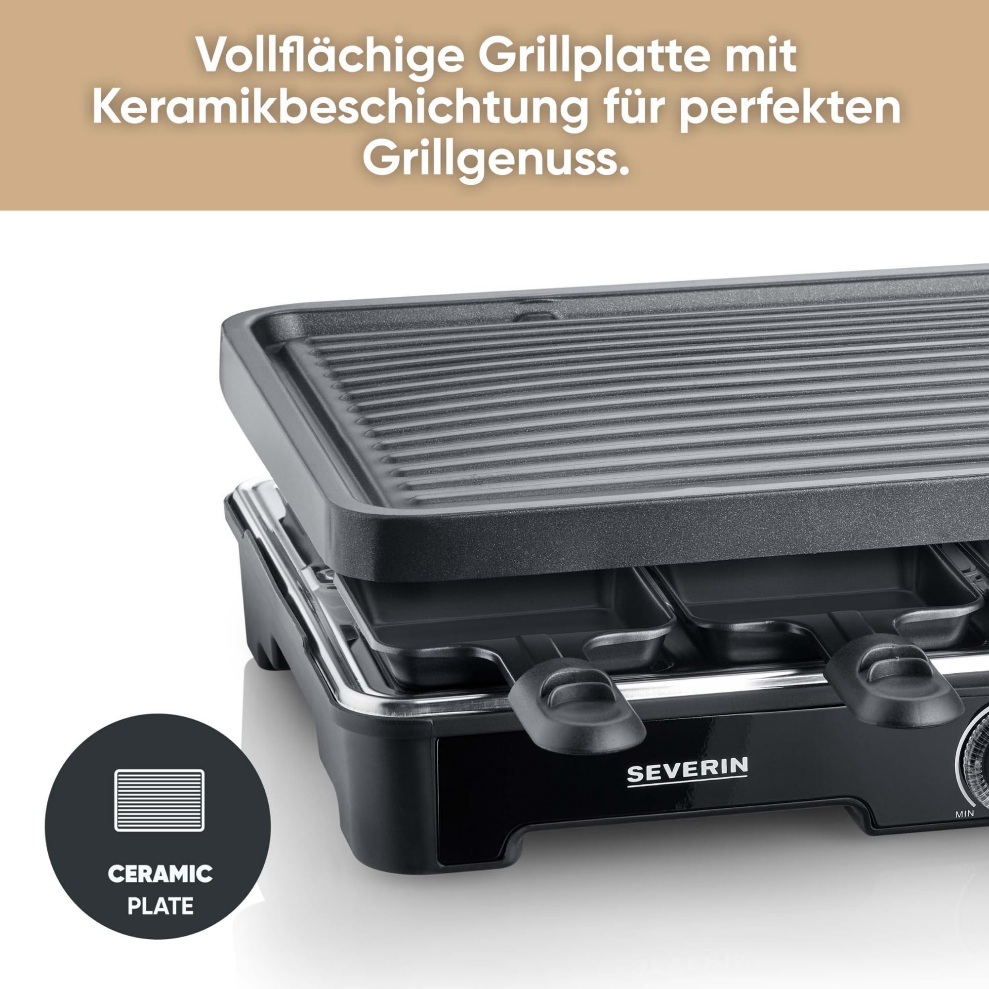 Severin Raclette-Grill, mit grosser Grillplatte, Keramik- & Antihaftbeschichtung, 8 Raclette Pfännchen & 8 Spatel, Tischgrill für bis zu 8 Personen, 1.400 W Leistung, schwarz, RG 9670