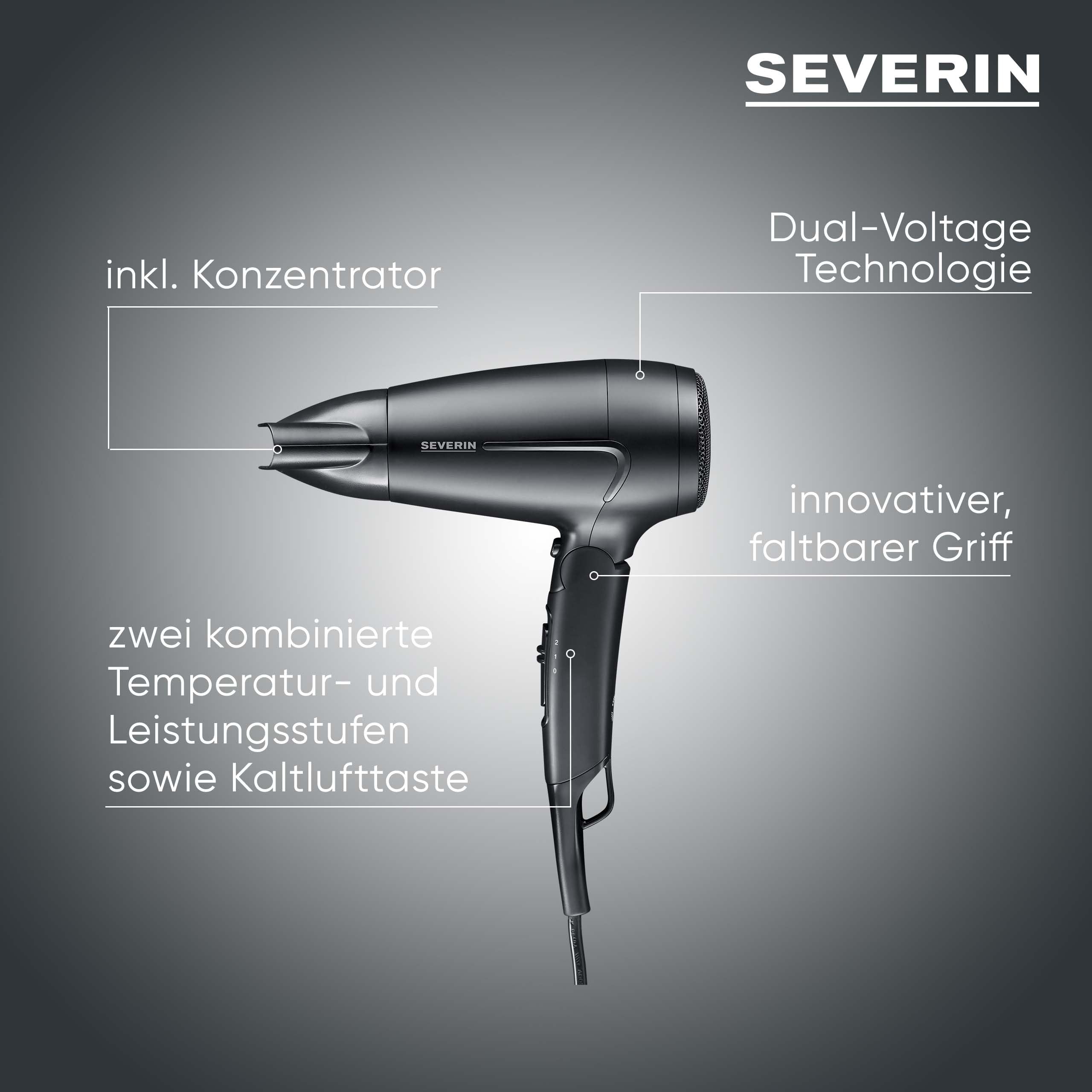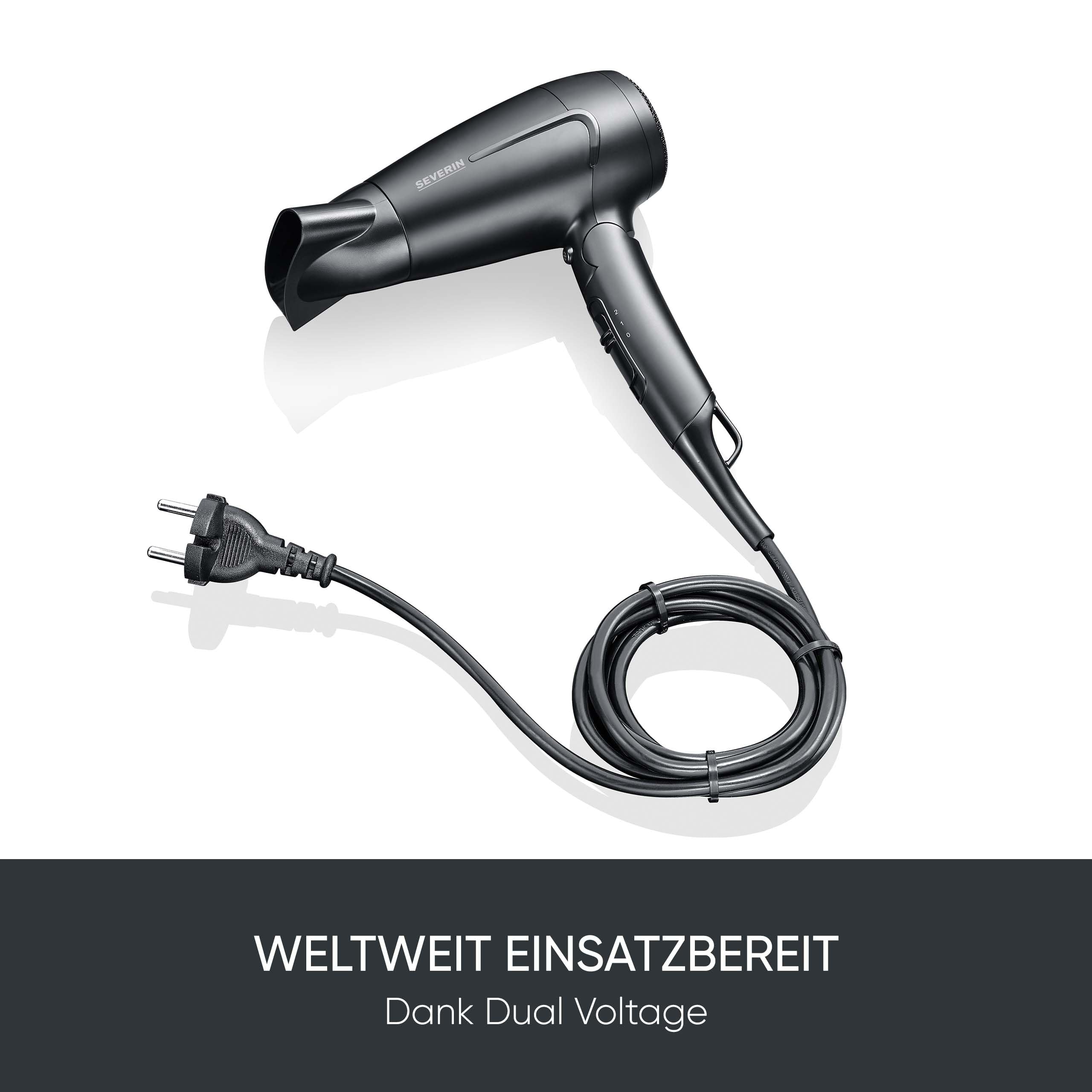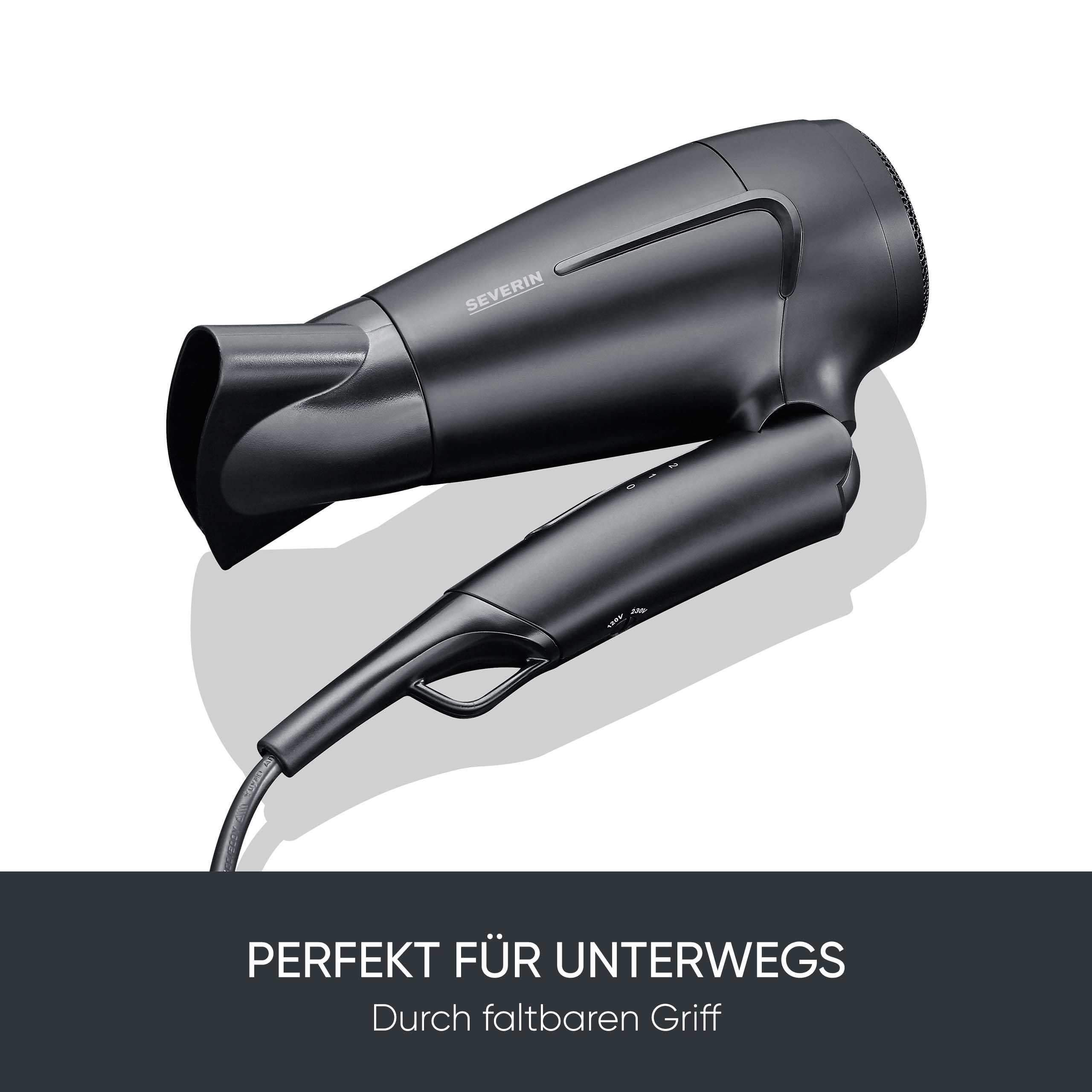 SEVERIN Reise-Haartrockner, weltweite Spannungsanpassung 110,220-240V, klappbarer Griff, Reisefön mit Kaltlufttaste, 1.600 Watt, schwarz, HT 0159