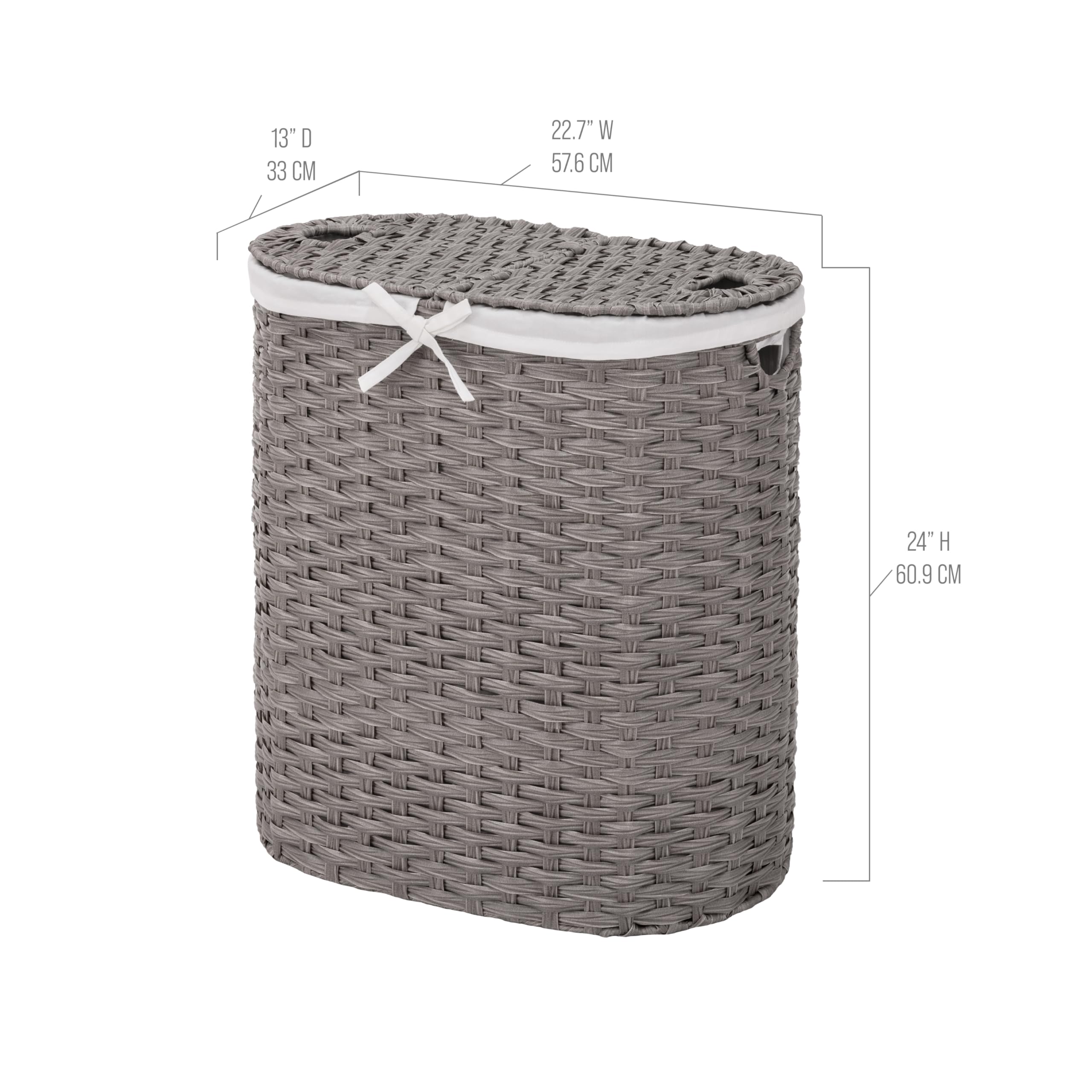 Masse: 31 cm T x 47 cm B x 61 cm H. Handgewebte, wasserabweisende Polyethylenharz-Stränge, rechteckiger Rahmen mit Stahlverstrebung für Stabilität und Robustheit, abnehmbarer, maschinenwaschbarer Canvas-Wäschesack mit integrierten Griffen, zusätzlicher Stoffeinsatz separat erhältlich, Klappdeckel mit Aussparungen als Griffe, keine Montage erforderlich, Volumen: 2,5 Scheffel oder 3,1 Kubikfuss (ca. 88 Liter). Nettogewicht: 3,7 kg. Zum Patent angemeldetes Design.