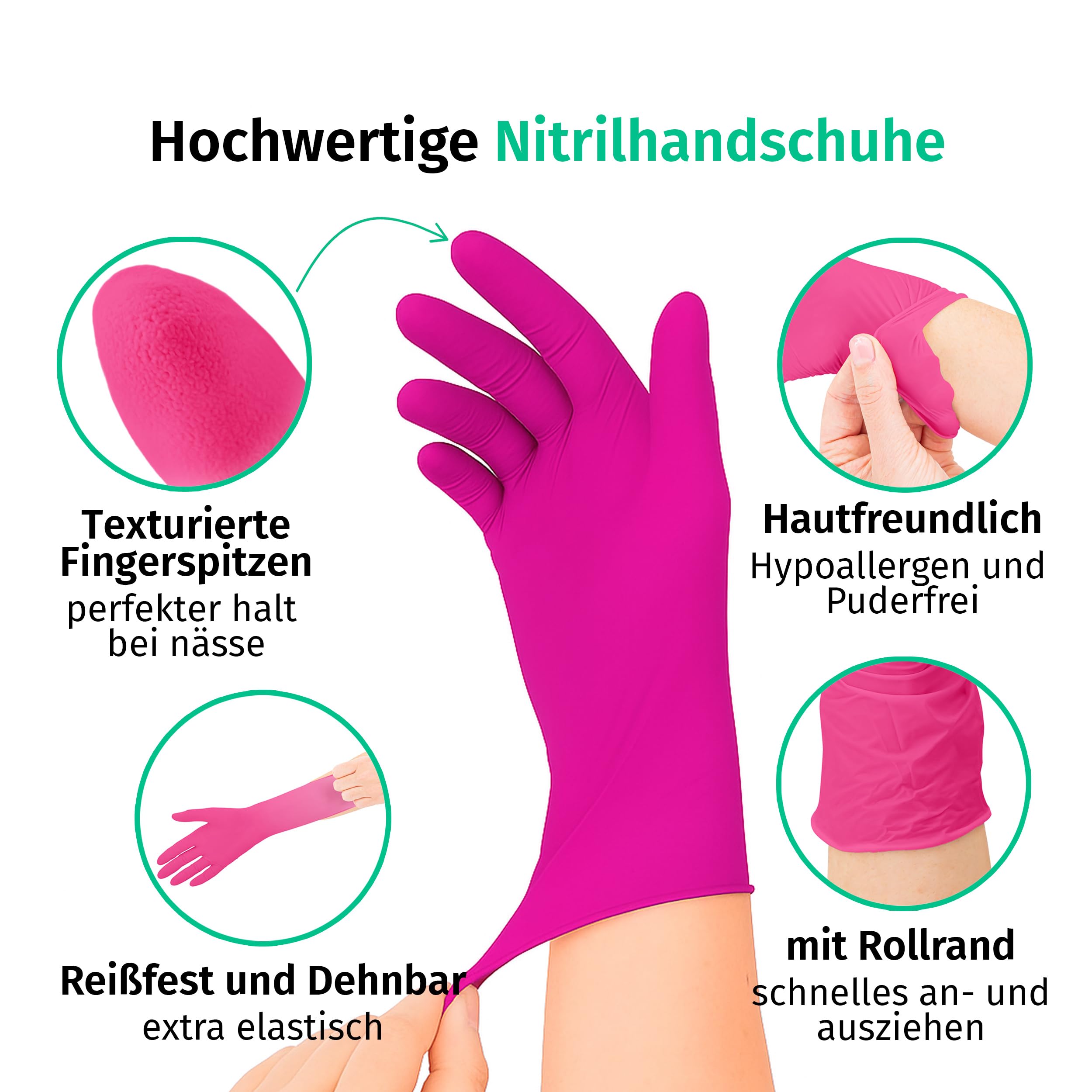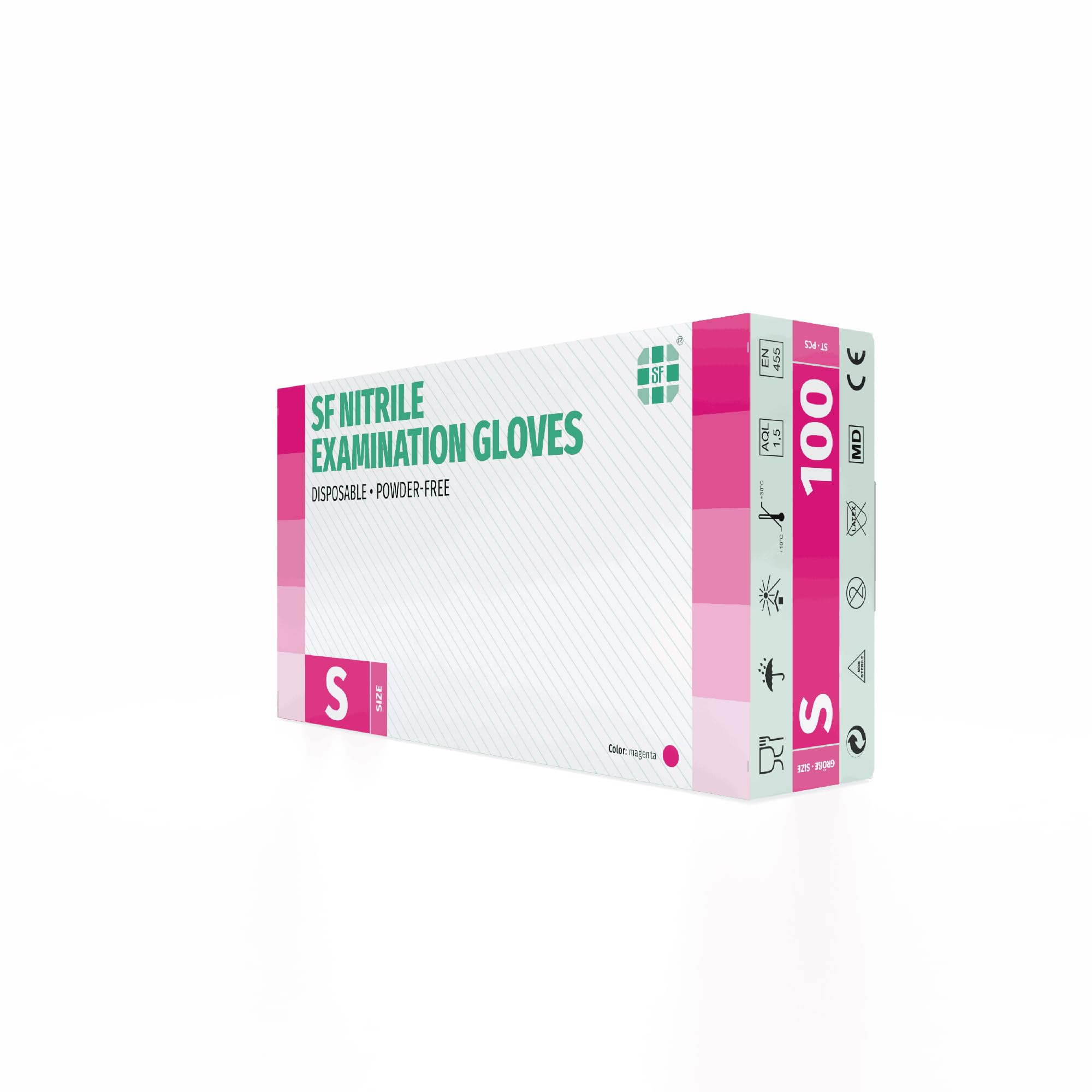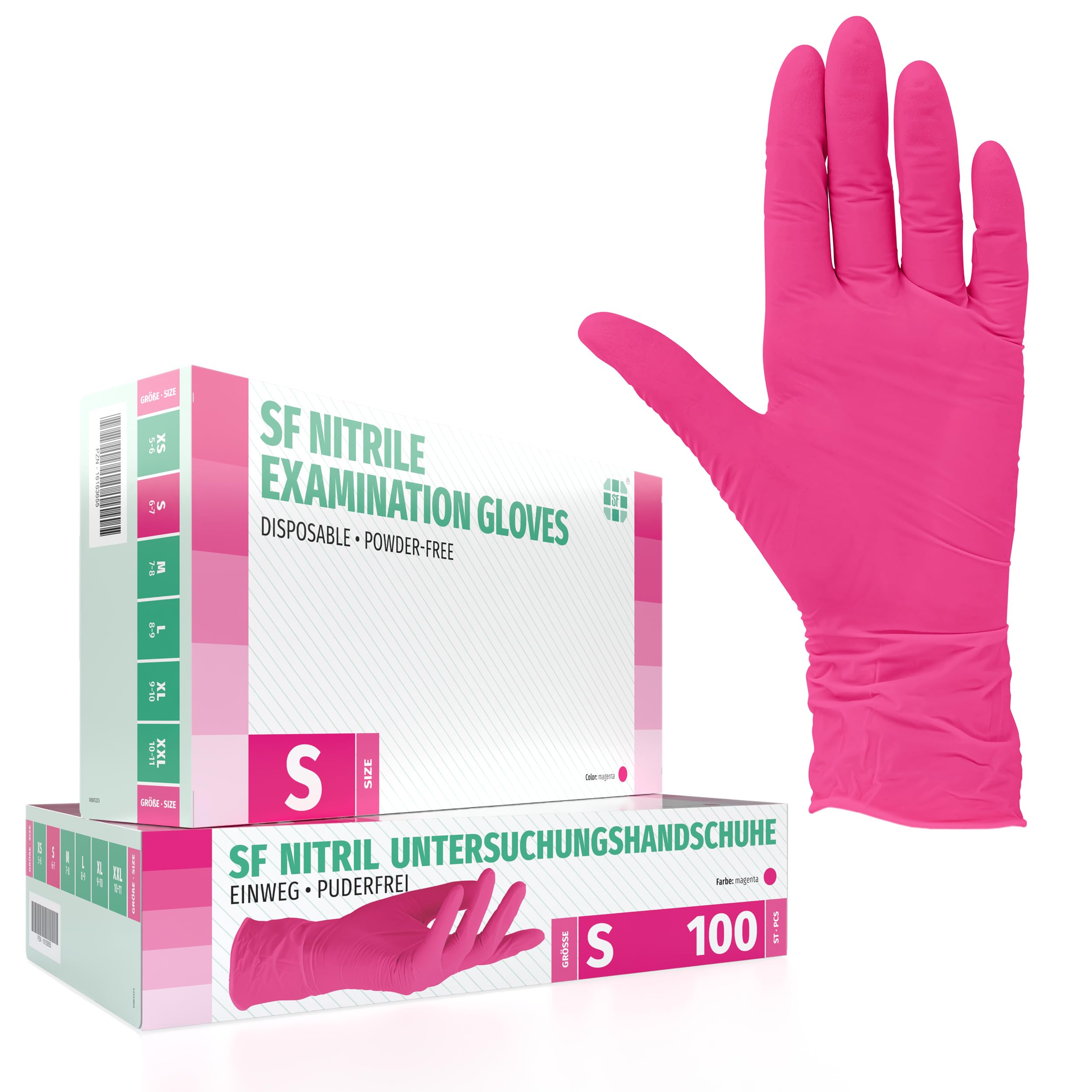 SF Nitrilhandschuhe S Magenta – Vielseitig, Hautfreundlich und ZuverlässigSF Nitrilhandschuhe bieten optimalen Schutz, hohen Tragekomfort und Flexibilität. Sie sind die perfekte Wahl für den Einsatz in der Medizin, Kosmetik, Nageldesign, der Lebensmittelindustrie, mechanischen Arbeiten und bei Reinigungsaufgaben. Das robuste Nitril-Material gewährleistet Langlebigkeit, während die texturierten Fingerspitzen einen sicheren Griff und präzises Arbeiten ermöglichen. Die Handschuhe sind chemikalienbeständig, hypoallergen und bieten zuverlässigen Schutz gegen Infektionen sowie Chemikalien wie Säuren und Laugen.Einsatzbereiche – Die perfekte Wahl für zahlreiche Anwendungen:Medizin & Tiermedizin – Einmalhandschuhe Magenta für Krankenhäuser, Praxen, Kliniken, Pflege und Tierarztpraxen, die auf Hygiene und Präzision angewiesen sind.Lebensmittelzubereitung & Gastronomie – Gummihandschuhe S für den Einsatz in Küche, Catering und der Lebensmittelindustrie, sicher und lebensmitteltauglich.Kosmetik & Nageldesign – Ideal für Kosmetikstudios und Nageldesigner, die auf hygienisches und präzises Arbeiten angewiesen sind.Tattoo & Piercing – Perfekte Untersuchungshandschuhe für Tattoo-Studios mit texturierten Fingerspitzen für optimalen Halt und Präzision. Die Handschuhe bieten eine hygienische und sichere Wahl für Tattoo-Artists, die höchste Standards erfordern.Reinigung & Haushalt – Optimal als Haushaltshandschuhe, Putzhandschuhe oder Schutzhandschuhe in der Küche.Mechanische Arbeiten & Werkstatt – Robuste KFZ-Handschuhe als Zubehör für Werkstätten und technische Arbeiten.Gartenarbeit & Grow-Zubehör – Ideal für Gartenarbeiten und die Handhabung von Pflanzenschutzmitteln, zuverlässig und bequem.Labor & Forschung – Chemikalienbeständige Einweghandschuhe für den sicheren Einsatz in Laborumgebungen, bei Analysen und in der wissenschaftlichen Forschung.ProduktdetailsMarke: SFMaterial: Nitril (Alternative: Vinyl & Latex Einmal handschuhe)Eigenschaften: Einweg, puderfrei, nicht steril, beidhändig tragbar, mit Rollrand, reissfestPackungsgrösse: 100 Einweghandschuhe pro BoxGrössen: XS, S, M, L, XL – Einmalhandschuhe für jede HandgrösseFarben: Magenta/Pink, Schwarz, Blau, Weiss, Rosa und Lila/Violett – Nitril Handschuhe in verschiedenen FarbenNormen: Erfüllt EN 455-1,2, EN 374, MDR 2017/745 Class I, PPE Regulation 2016/425 Cat III