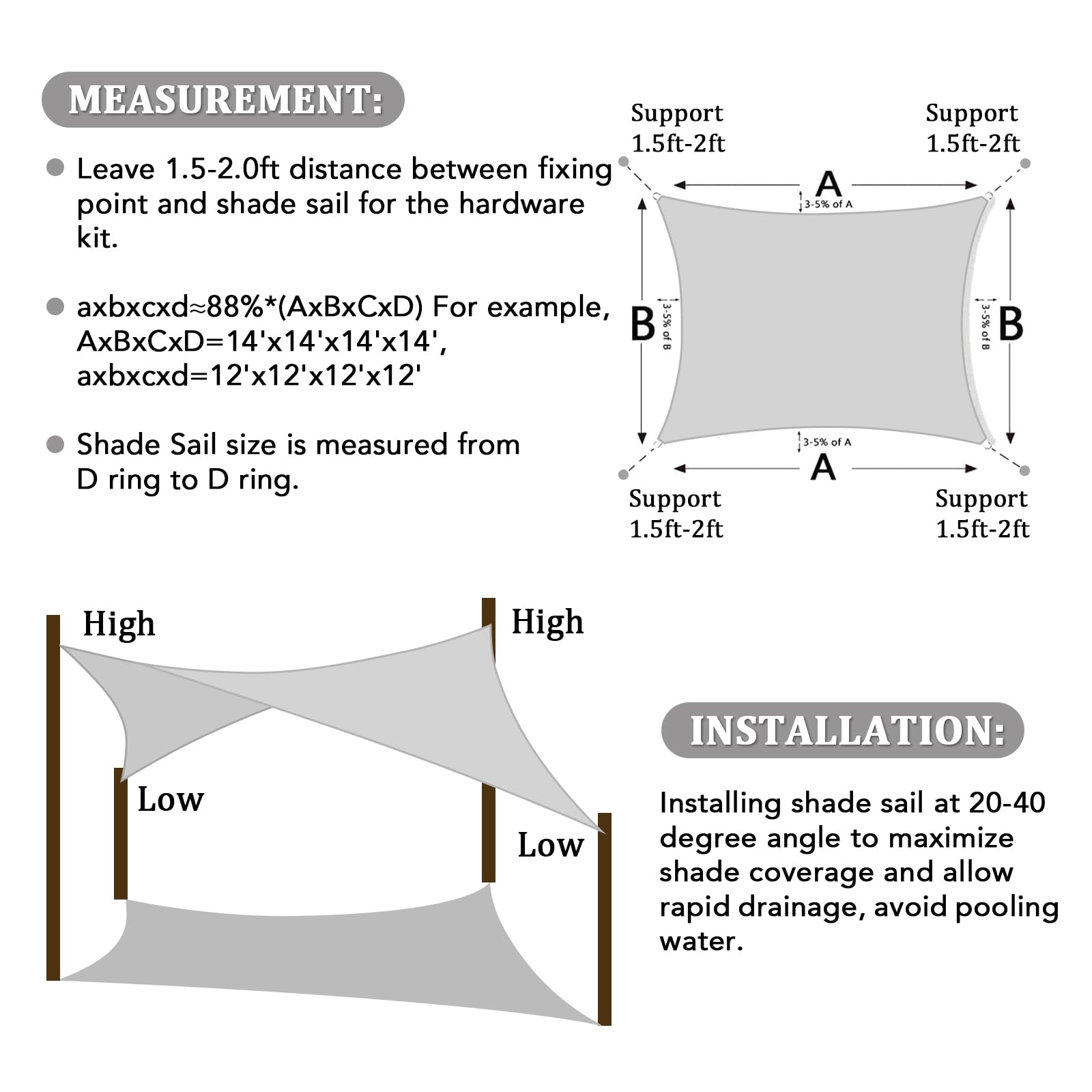 Shade&Beyond Sonnensegel Informationen Material:185 g/m² hochwertiges HDPE-Sonnenschutzgewebe. Unsere Sonnensegel sind sowohl für den privaten als auch für den gewerblichen Markt geeignet. Eine Schattenabdeckung bietet Schutz vor der Sonne und sieht in den Aussenbereichen Ihres Hauses toll aus – zum Abdecken von Pools, Rasen, Grills, Garten, Terrasse und Spa. Sonnensegel sind auch ideal für den Einsatz in öffentlichen Aussenbereichen: Einkaufszentren, Autohöfe, Minenstandorte, Gemeinschaftszentren, Kinderbetreuungszentren, Baustellen, Schulen, Spielplätze, Parkaktivitätsbereiche und Sportstätten. In der Tat können wir eine Abdeckung in jedem Bereich platzieren, in dem Schatten benötigt wird. Installationsvorschläge für rechteckige Sonnensegel. Wie im Bild oben gezeigt, mit 2 Enden höher als die anderen, sieht das Aussehen sehr schön aus und Wasser kann leichter vom Segel abfliessen. Pflegehinweise: Mit mildem Reinigungsmittel oder Wasser mit einem Schwamm oder einer sehr weichen Bürste reinigen. Nicht mit einer steifen Bürste, einem Scheuerschwamm oder einem Scheuermittel schrubben. Legen Sie das Segel nicht in Ihre Waschmaschine, Wäschetrockner. Nehmen Sie das Sonnensegel ab, wenn extremes Wetter kommt.