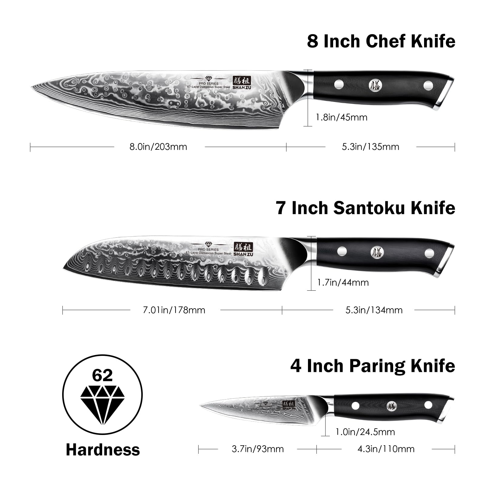 SHAN ZU Damastmesser-Set, 3-teilig japanisches Superstahl-Damast-Küchenmesser-Set, hochkohlenstoffreiches professionelles ultrascharfes Kochmesser-Set mit G10-Griff Geschenkbox
