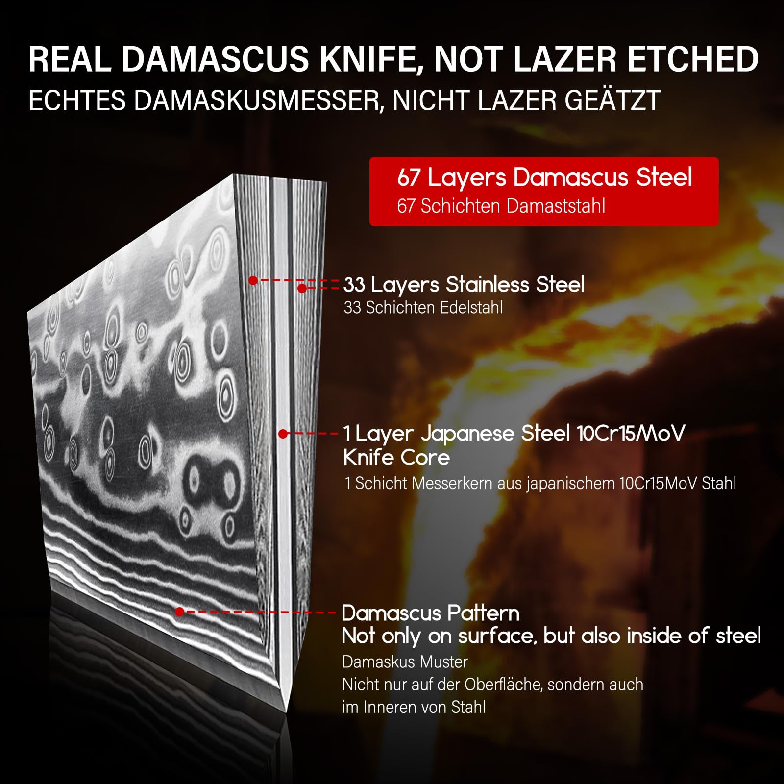 • 【ECHTE Damast Messer, Nicht Lasergeätzt】Damastmesser sind berühmt für ihr schönes Muster. Das Damastmesser von SHAN ZU bildet ein Klingenmuster durch wiederholtes Falten und Schmieden mehrerer Lagen Kohlenstoffstahlbleche, und das Muster wird nach dem Polieren besser sichtbar. Gefälschte Damastmesser werden nur lasergeätzt (oberflächenbehandelt), um ein Muster zu bilden, und es verschwindet nach dem Polieren vollständig