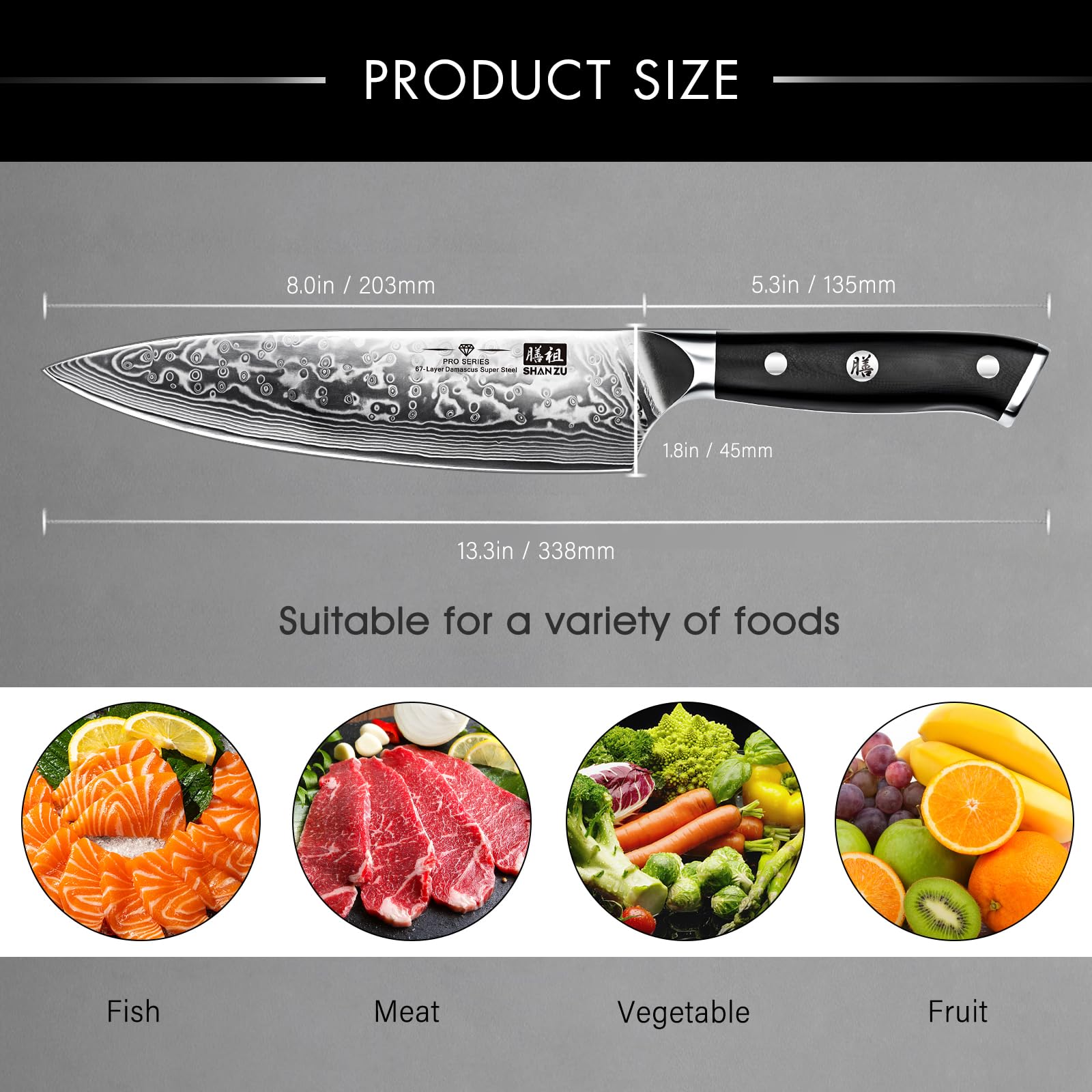• 【Japanischer Stahlkern, super scharf】SHAN ZU Kochmesser Kern nimmt 10Cr15MoV Japan Damaststahl, hohe Härte (62HRC), Korrosionsschutz und verschleissfest; In Kombination mit fortschrittlicher moderner Schmiedetechnologie erhalten Sie ein ultrascharfes Küchenmesser