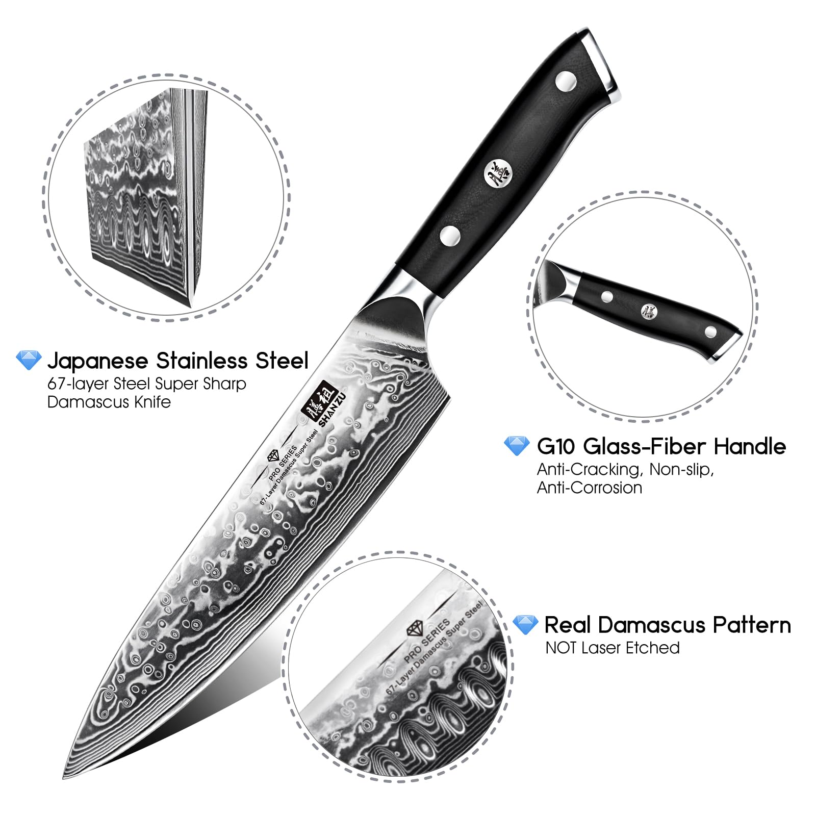 SHAN ZU Damastmesser Kochmesser 67 Schichten Damaststahl Küchenmesser mit G10 Griff 20CM - PRO Series