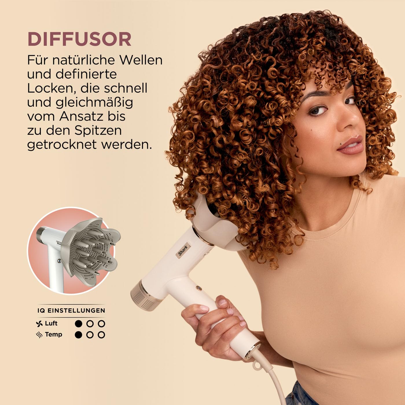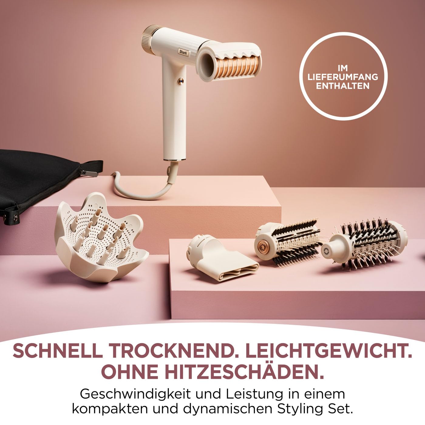 • BEINHALTET: Shark SpeedStyle-Haartrockner, RapidGloss-Finisher, QuickSmooth-Bürste, Turbo-Konzentratordüse, DefrizzFast Diffusor, Express Touchup-Bürste, Aufbewahrungstasche. Gewicht: 750g. Farbe: Seidenweiss