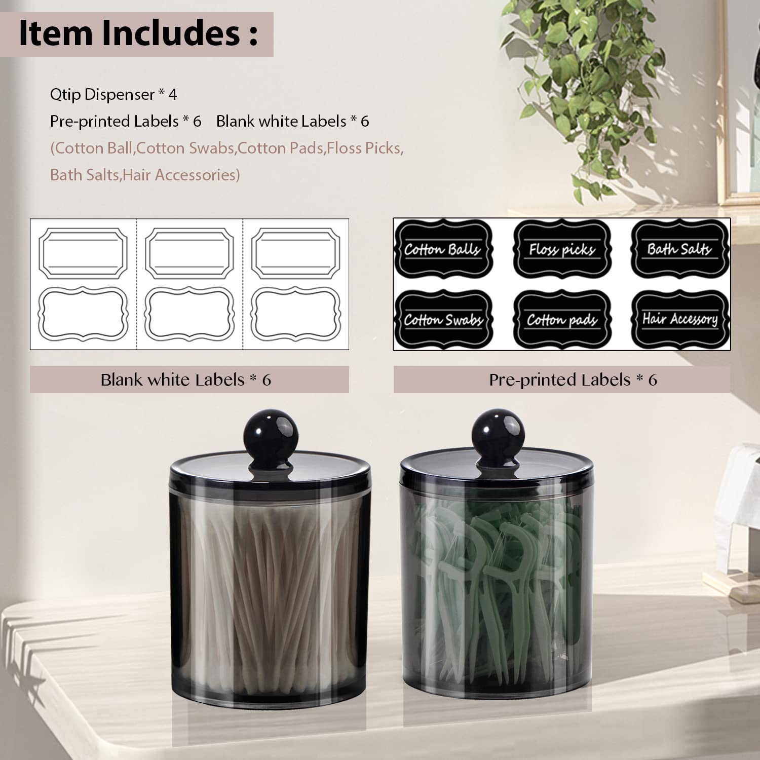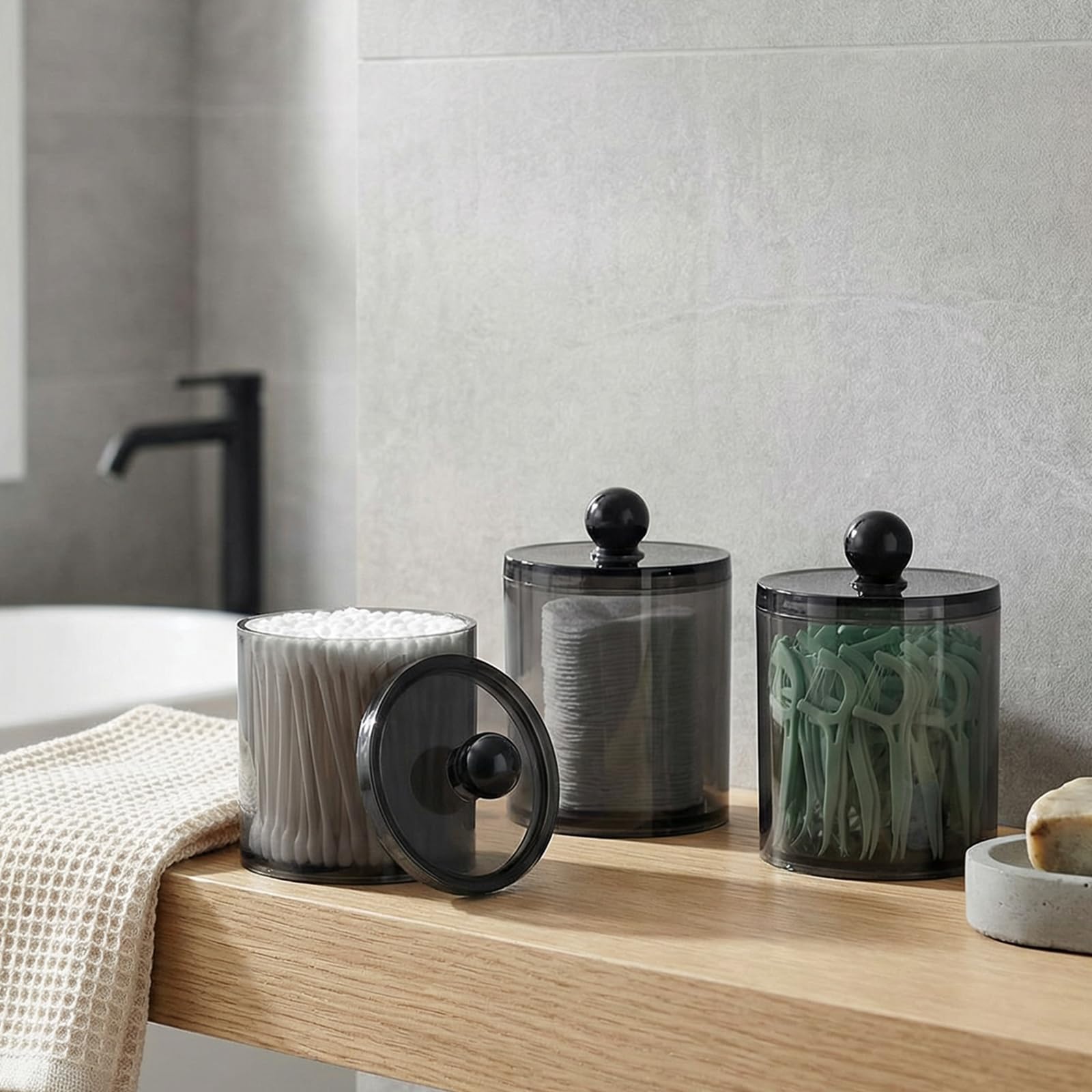 SheeChung Apothekergläser aus schwarzem Acryl mit Kreidetafel-Etiketten, bruchsicherer Qtip-Halter für Badezimmer, Kosmetik-Aufbewahrungsbehälter für Wattestäbchen, Bälle, Zahnseide-Picker, modernes