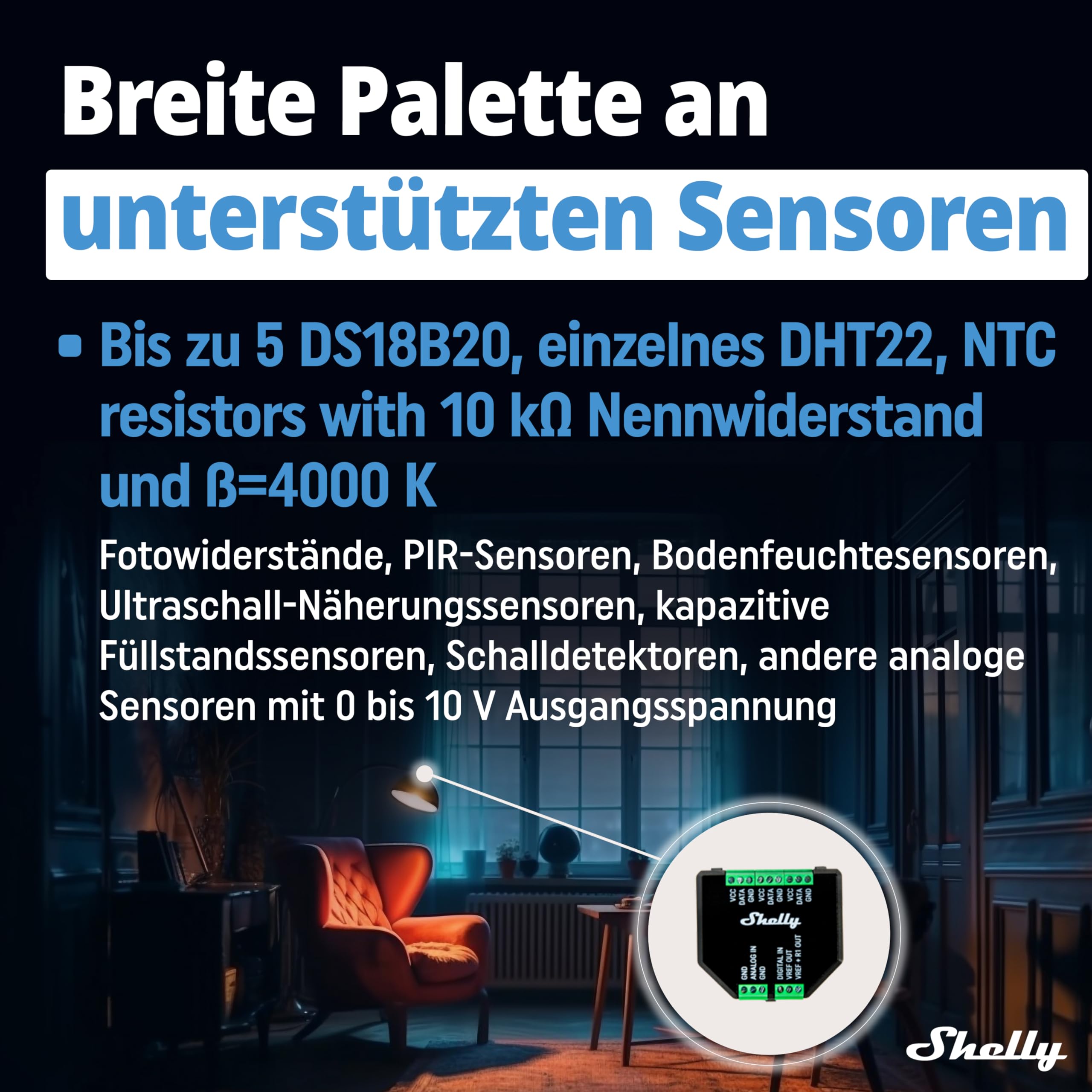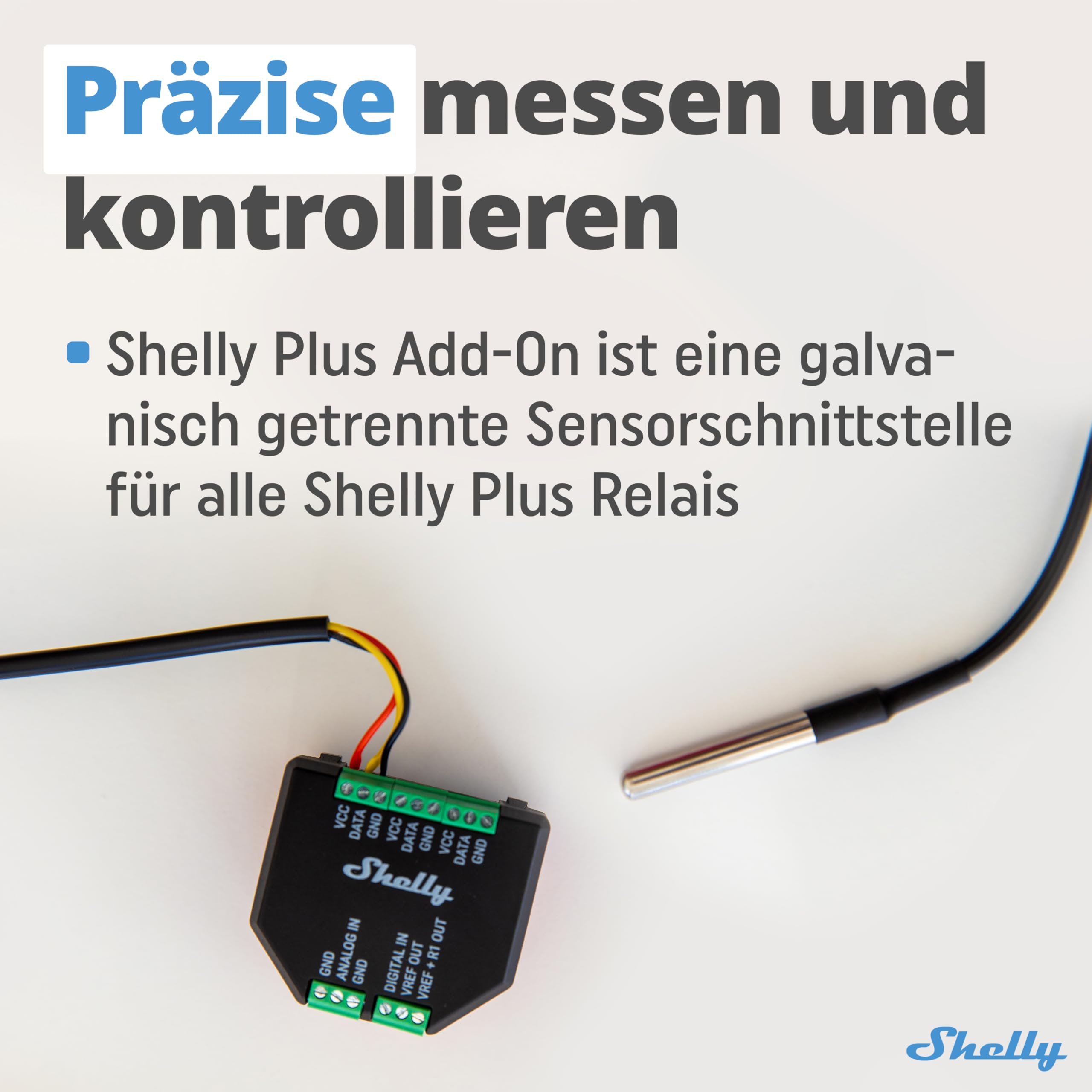 Shelly Plus Add-On - Add-On für Shelly Plus & Gen3 Geräte, Schnittstelle für Temperatur- und Luftfeuchtigkeitssensoren, DS18B20, DHT22 & Arduino Sensoren, Analoger und Digitaler Eingang