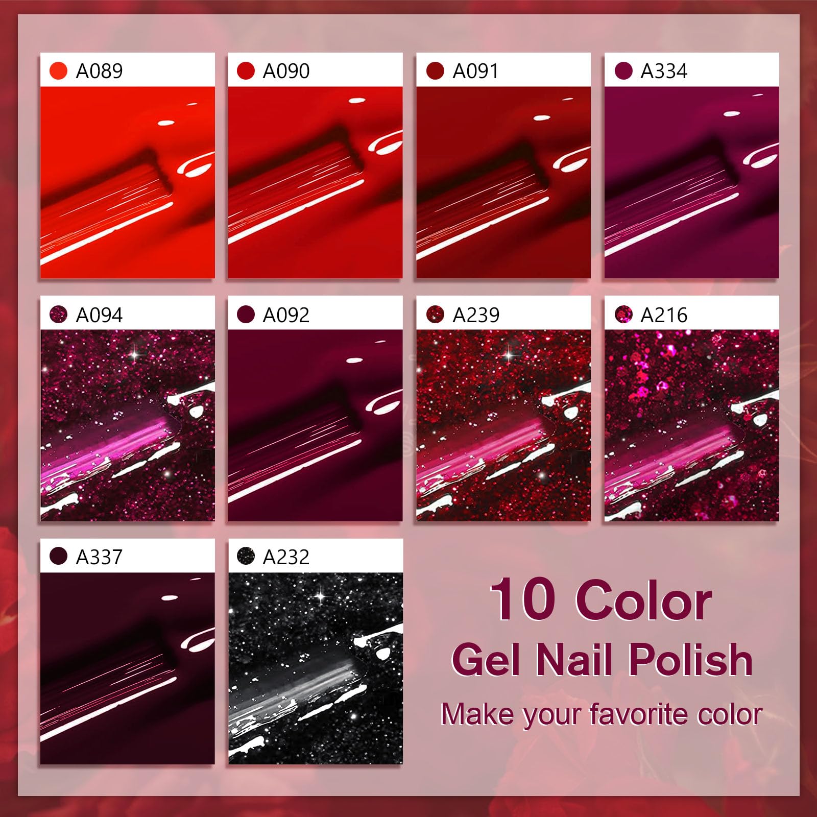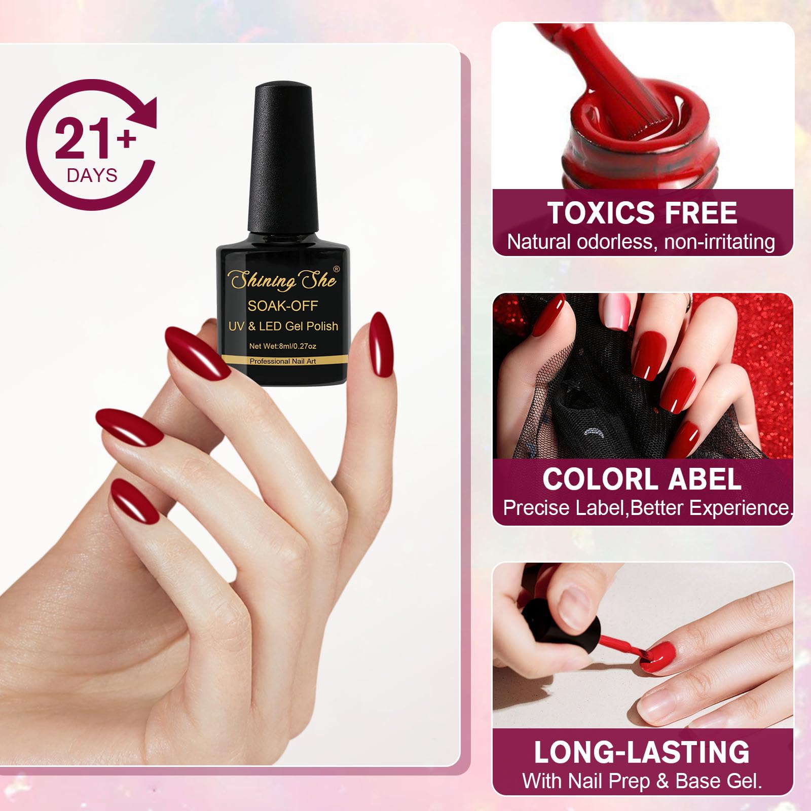 Shining She UV Gel Nagellack Rot Set, Burgunder & Glitzer Farben, Soak-Off, 10 x 8 ml