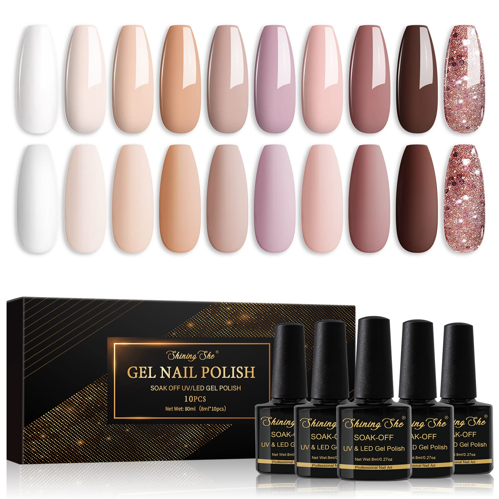 Shining She UV Gel Nagellack Nude Set, Beige Rosa Weiss Champagner Braun Glitzer, Soak-Off, 10 x 8 ml