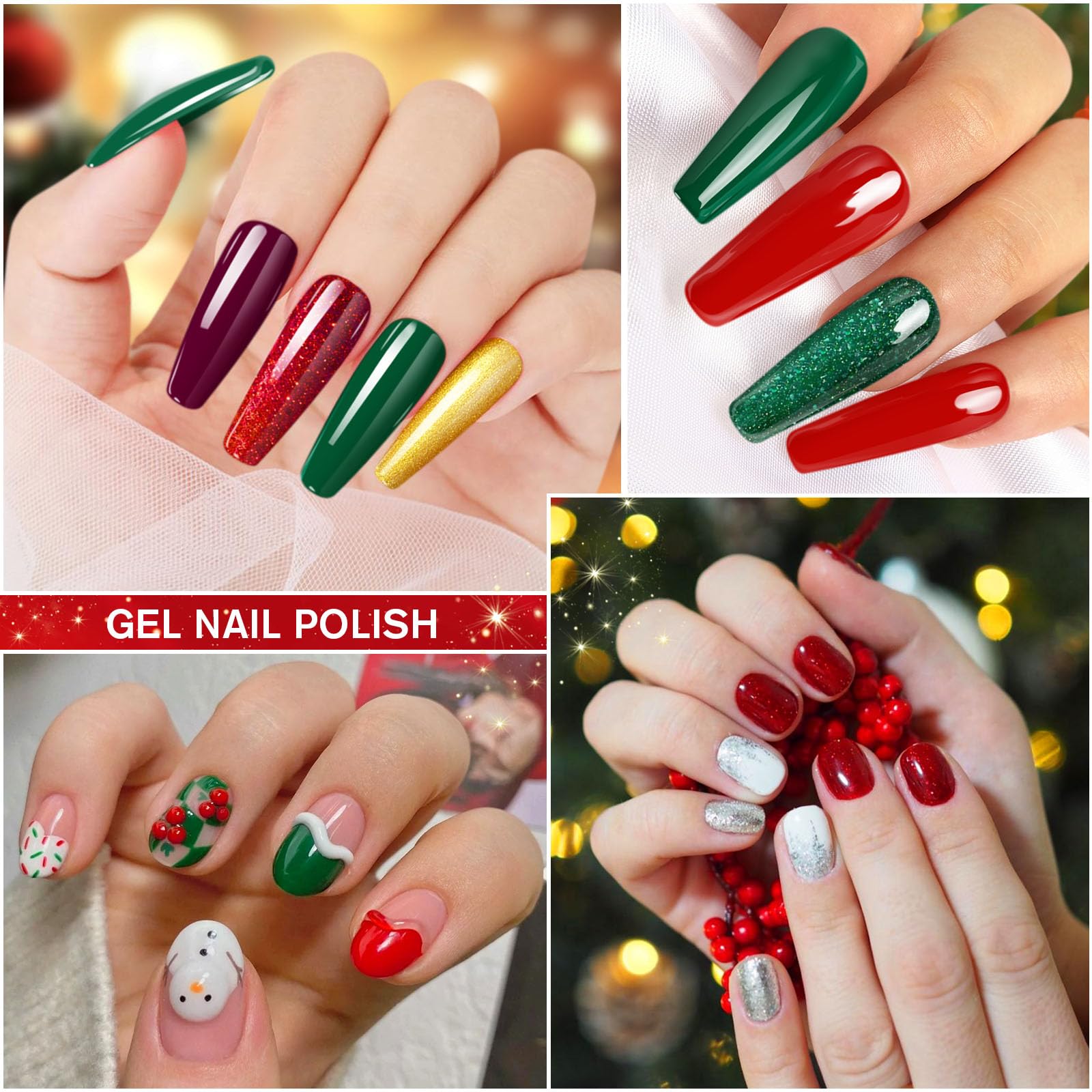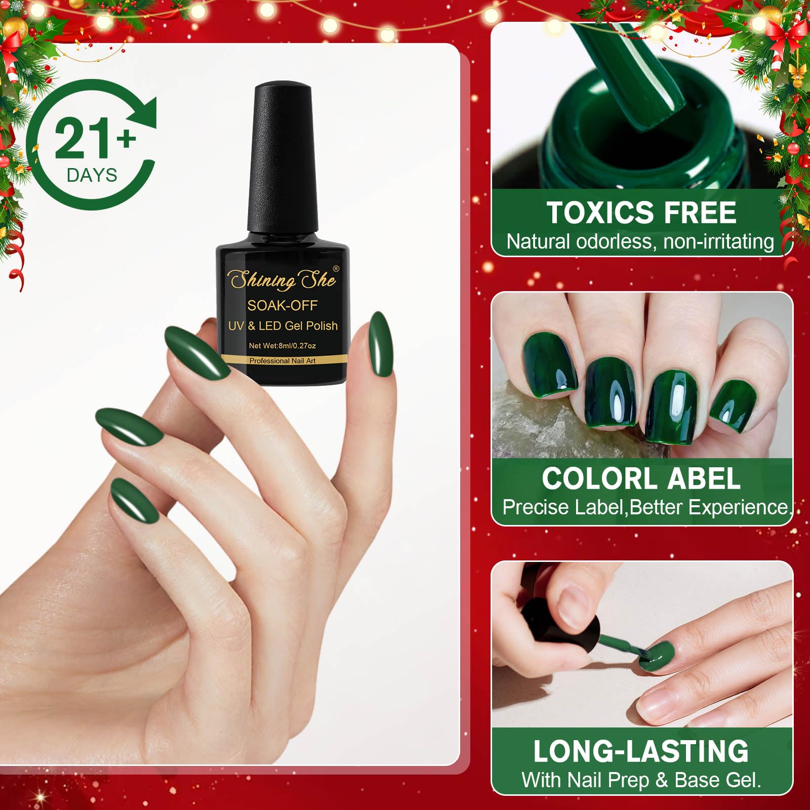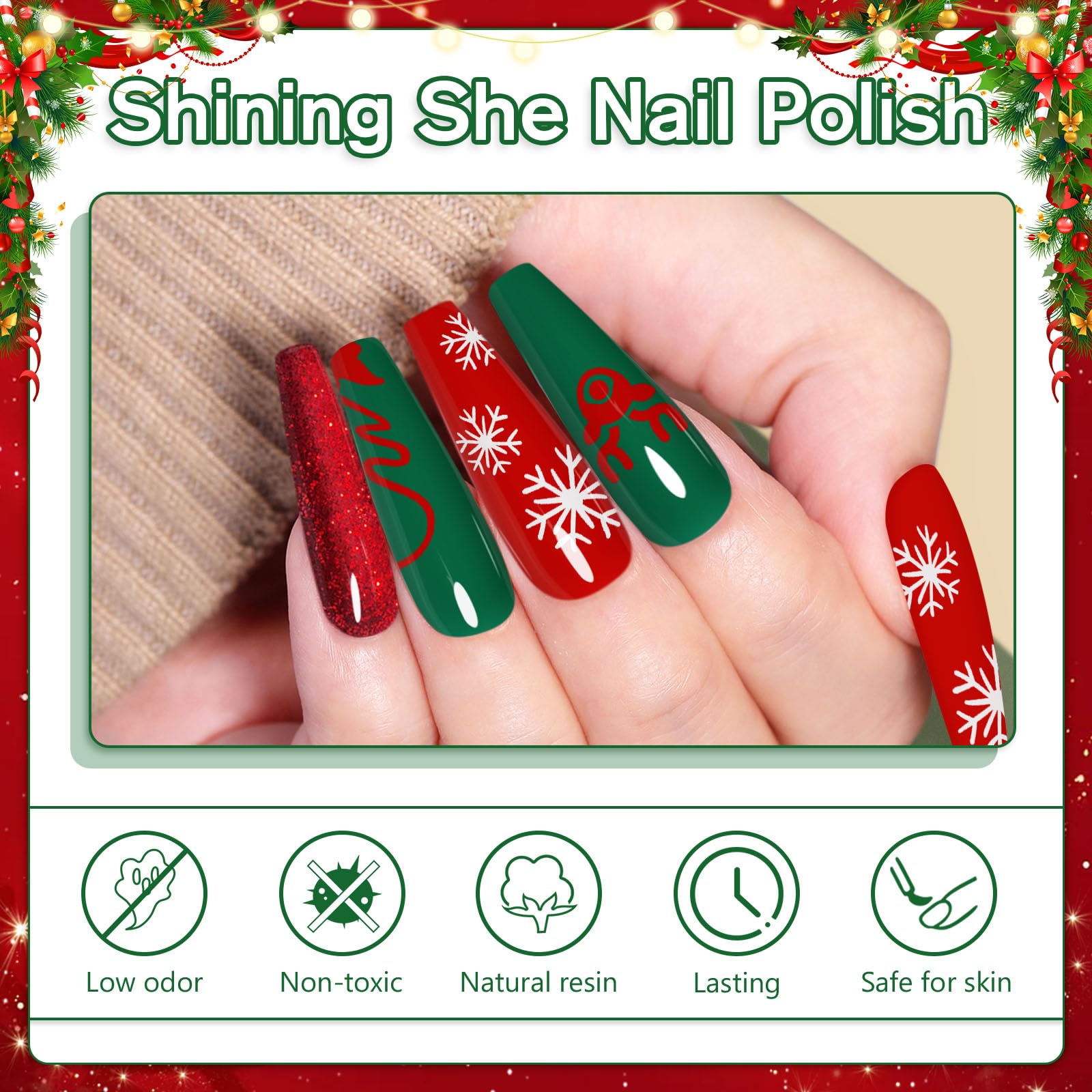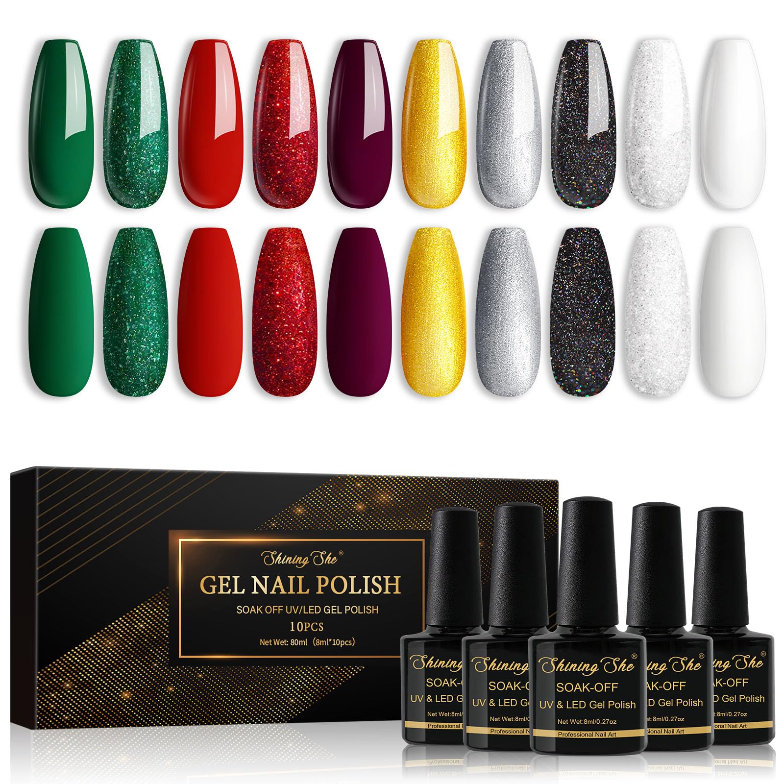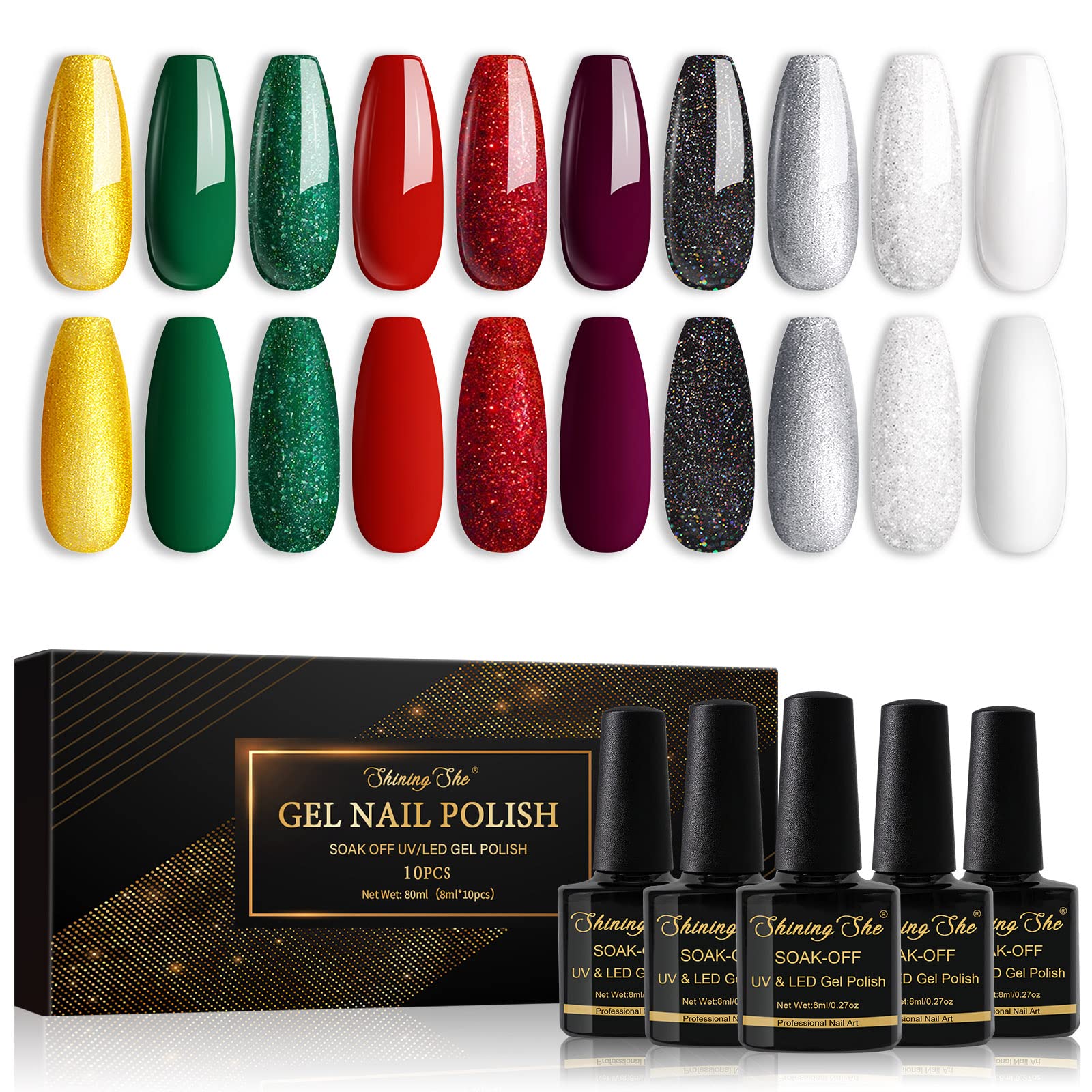 Das Shining She UV Gel Nagellack Set fuer Weihnachten enthaelt zehn festliche Farben, die perfekt auf Herbst- und Winterlooks abgestimmt sind. Glitzernde und klassische Toene wie Gold, Gruen, Rot, Weiss und Schwarz eignen sich ideal fuer elegante Weihnachtsdesigns, kreative Nail Art oder stilvolle Alltagsmanikueren.