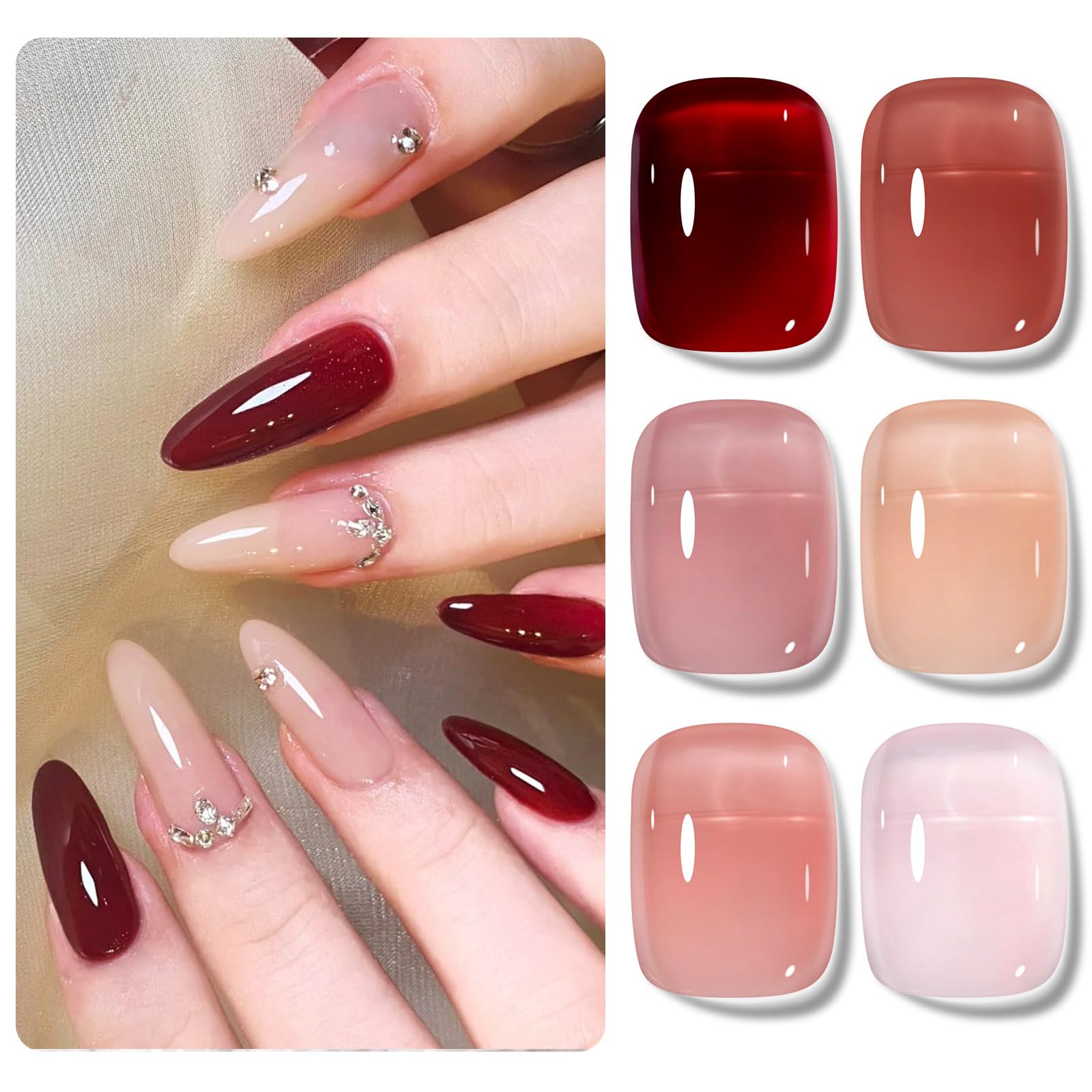 Das Shining She Jelly UV Gel Nagellack Set enthaelt sechs transparente Jelly-Farben in natuerlichen Nude-, Rosa-, Haut-, Burgunder- und Rottönen. Die durchscheinende Textur verleiht den Nägeln einen dezenten Hochglanz-Look und eignet sich ideal für moderne Jelly Nails, natürliche Maniküren und kreative Nail Art Designs – besonders für Herbst und Winter.