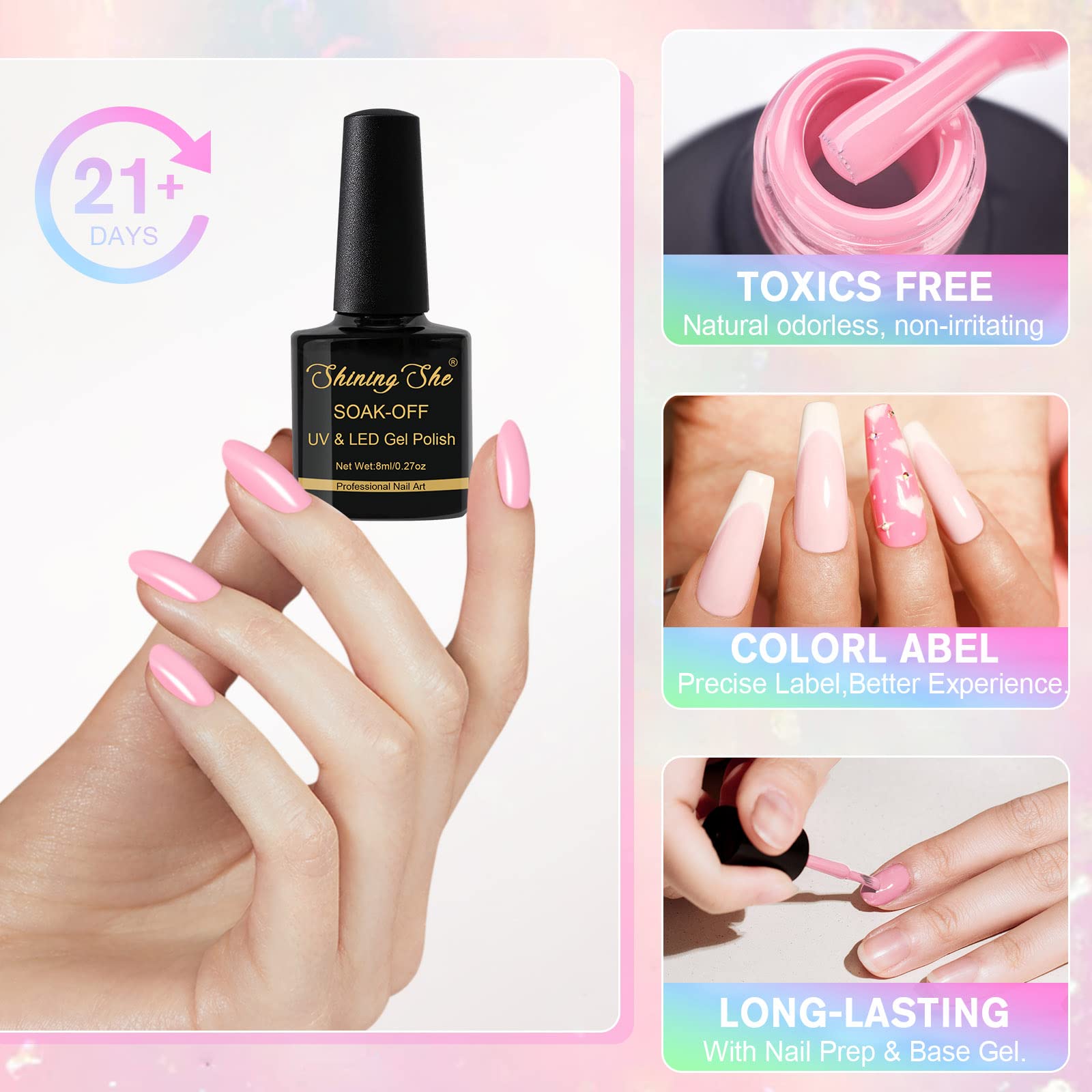 Das Shining She UV Gel Nagellack Set enthaelt 10 sanfte Pastellfarben, perfekt fuer Fruehling und Sommer. Die stilvollen, frischen Farbtöne verleihen deinen Naegeln einen eleganten und modernen Look und eignen sich ideal fuer den taeglichen Gebrauch, kreative Nail Art oder eine gepflegte Manikuere zu Hause und im Salon.