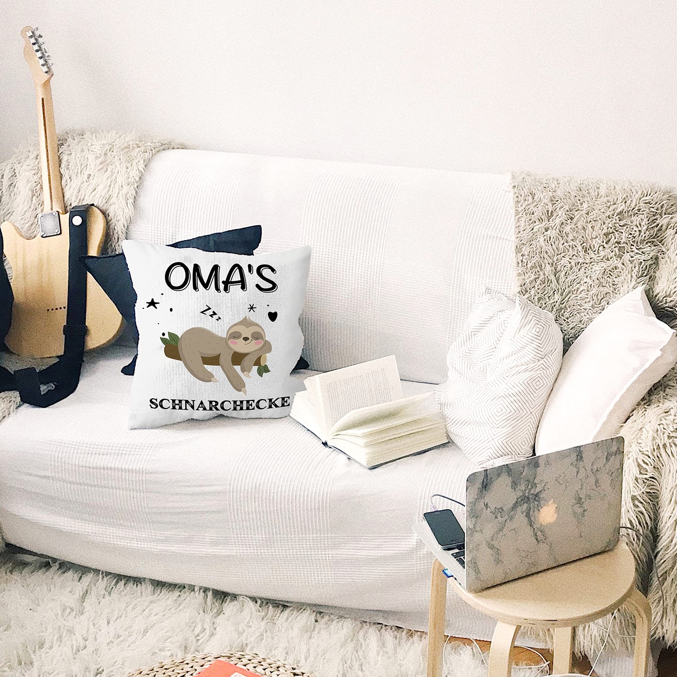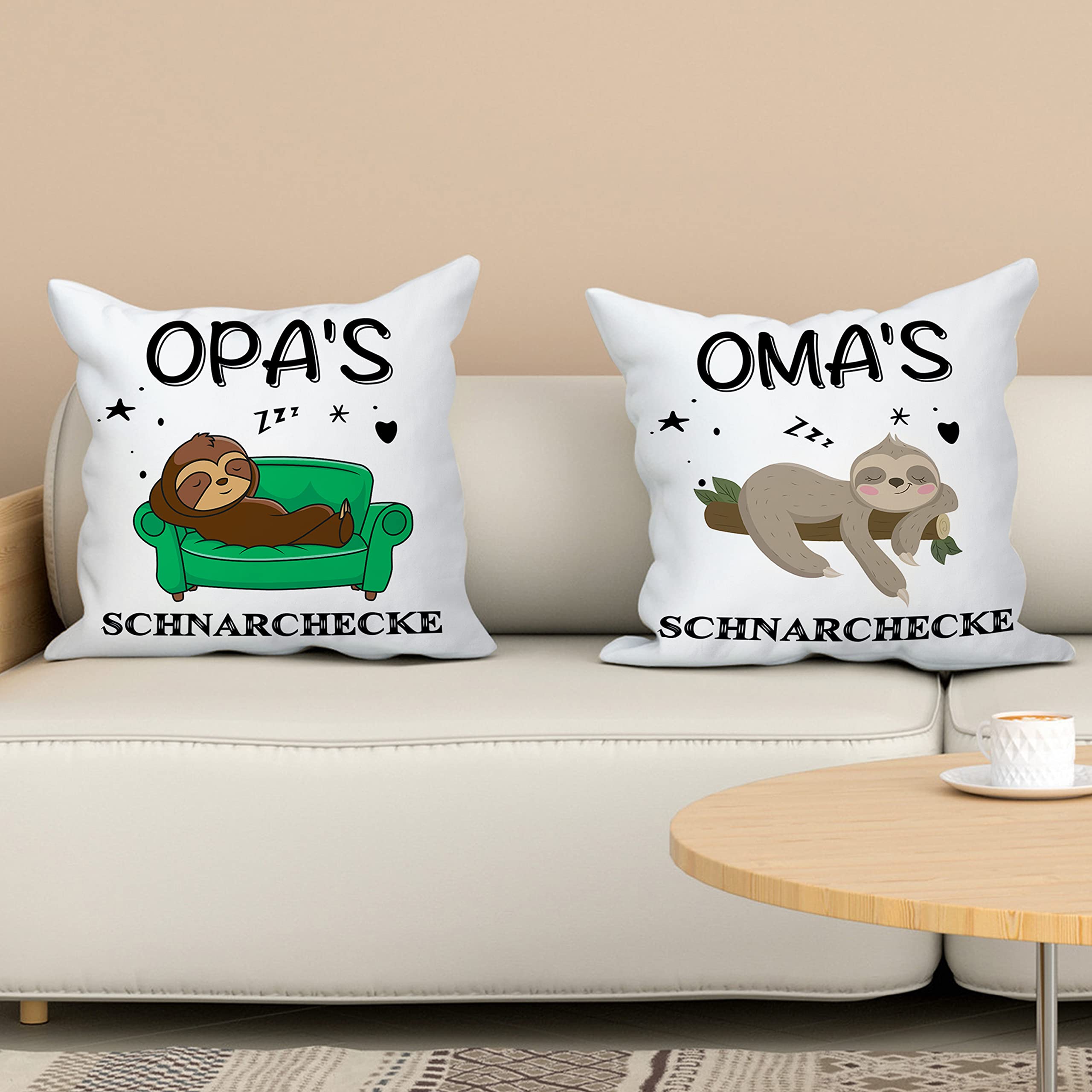 Oma und opa geschenke: Die vorderseite des kissenbezugs ist bedruckt: Niedliches cartoon-faultierbild "Oma's/Opas Schnarchecke ". Interessanter kissenbezug, perfekt geburtstagsgeschenk für oma opa.