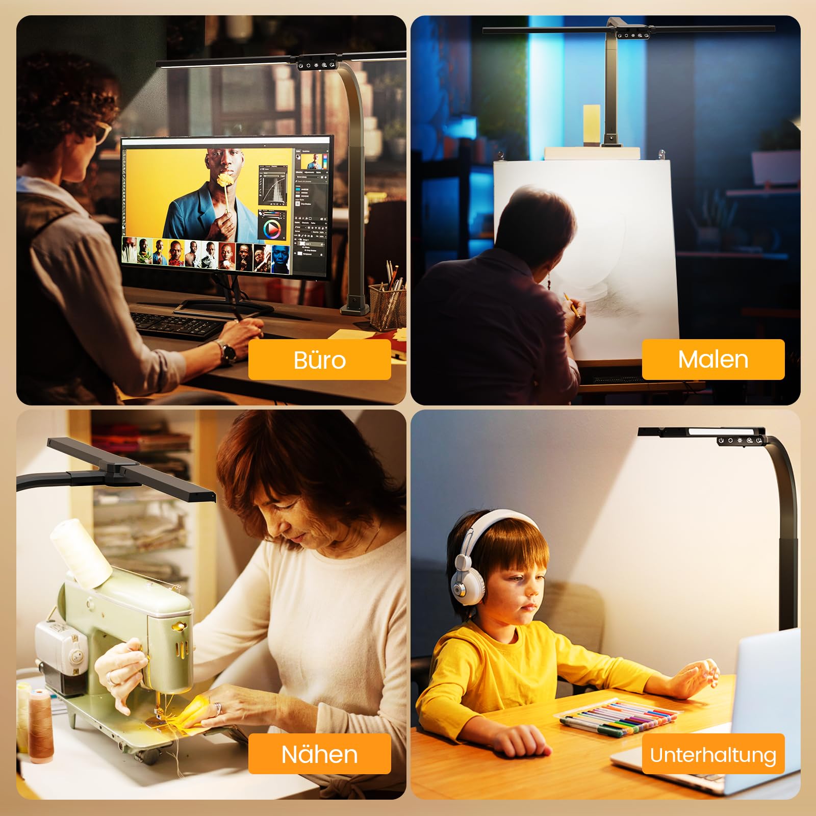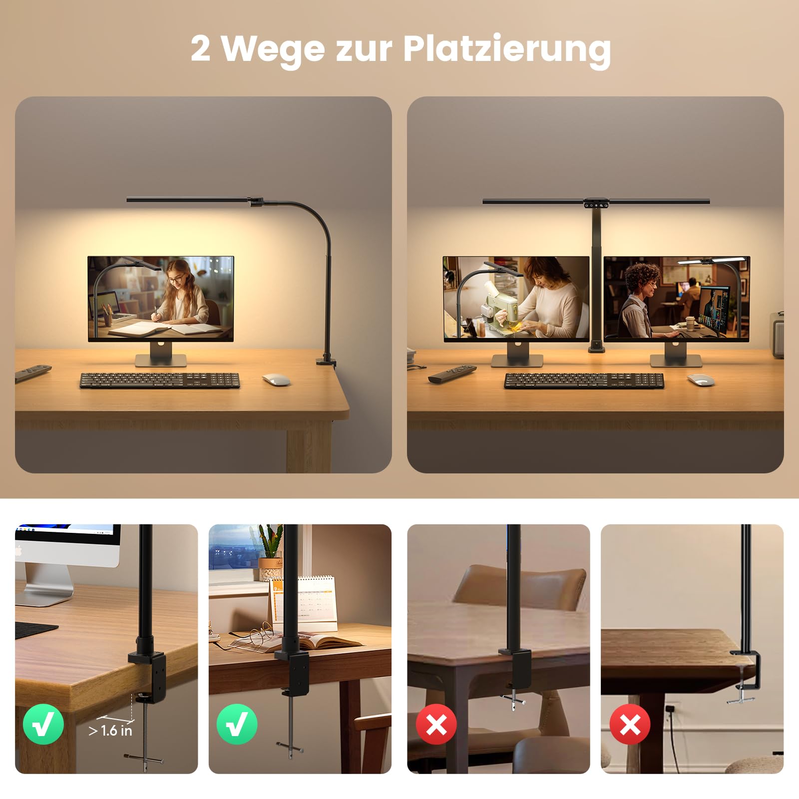 Diese doppelkopf Schreibtischlampe RGB, entworfen mit 2 flexiblen schwenkbaren Lampenstäben, die bis zu 180°auf 80cm ausgefahren werden können, frei drehbar 270° vorne und hinten, so dass Sie die Schreibtischlampe in jeden Winkel drehen können. Und mit dem biegsamen Schwanenhals kann sie einen Schreibtisch mit einer Breite von 180 cm gleichmässig abdecken und bietet eine ausreichende und komfortable Beleuchtung.