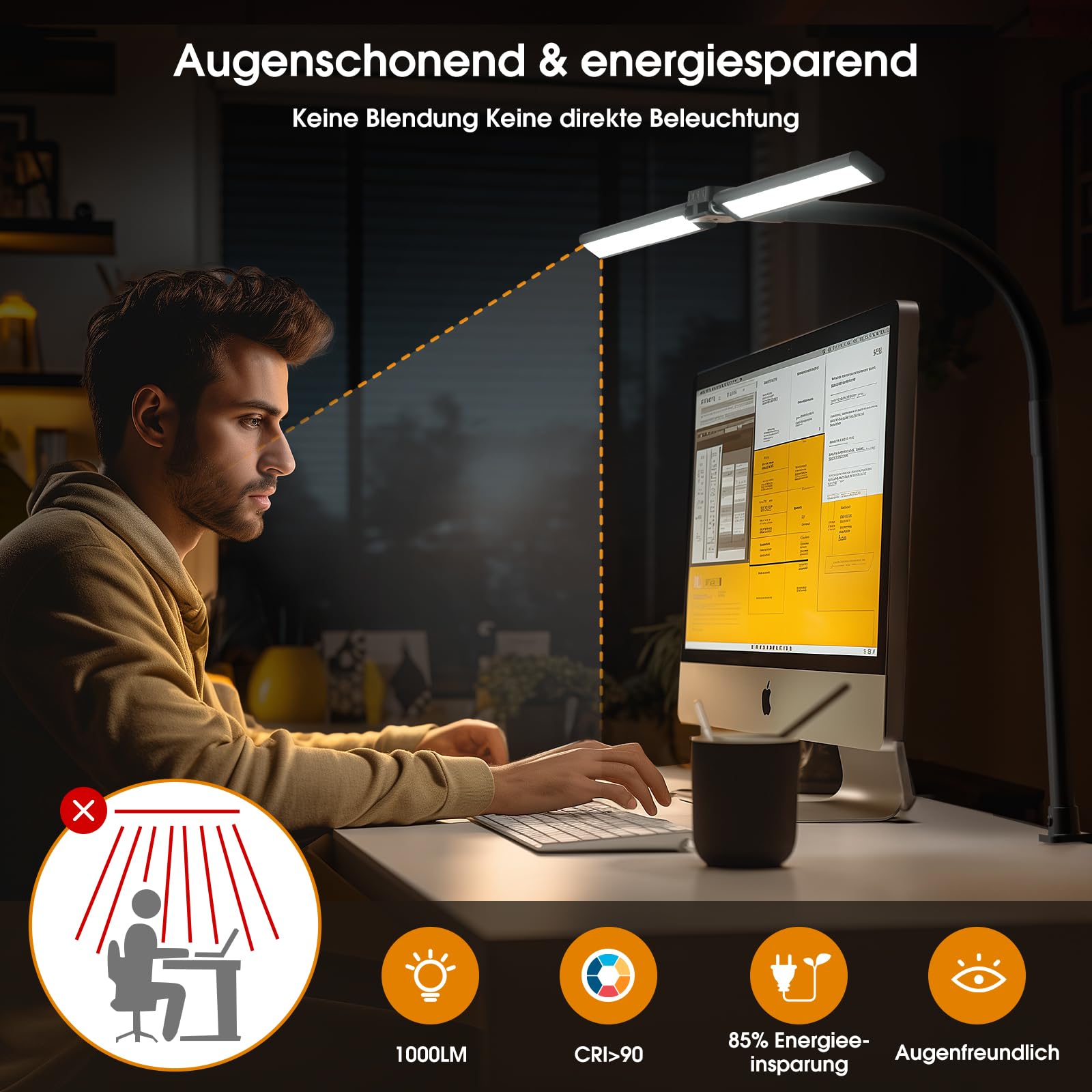 SIBRILLE Schreibtischlampe LED, Doppelkopf Schreibtischlampe Dimmbar, Klemmbar Desk Lamp für Büro, Augenschutz Monitor Lampe Tageslichtlampe, PC Lampe Tischlampe mit Schwanenhals, Schwarz