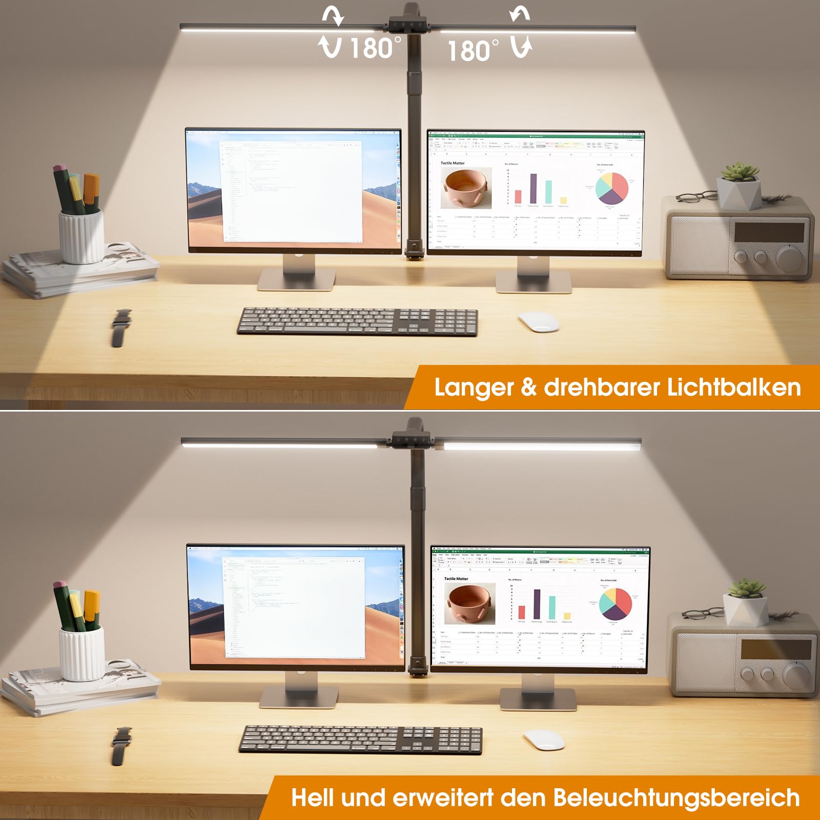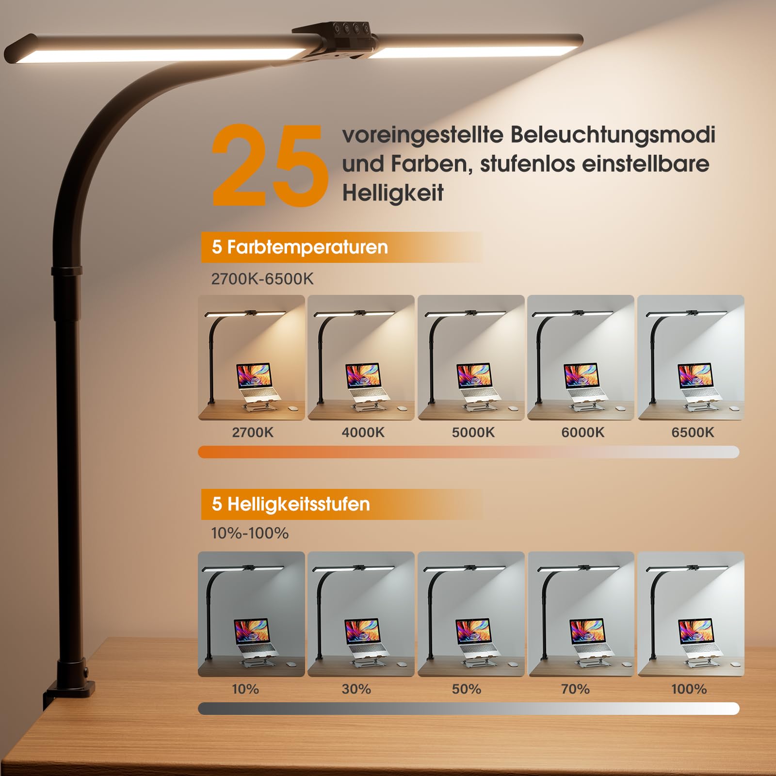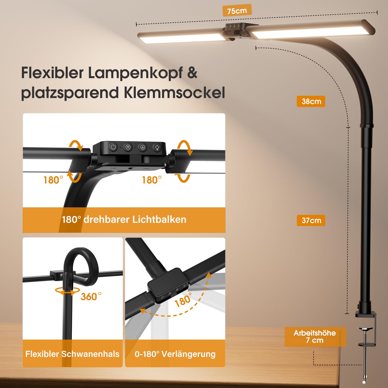 Doppelkopf Schreibtischlampe LED Dimmbar,doppelkopf schreibtischlampe,schreibtischlampe klemmbar,【Hell & Multi-Lighting Modes】 SIBRILLE LED Schreibtischlampe, Doppelkopf, super hell. Breiter Bereich der Helligkeit & Farbeinstellung; KURZ drücken Sie die Taste, um schnell die 5 Farbtemperaturen oder Helligkeit schrittweise einzustellen, oder LANG drücken Sie für stufenloses Dimmen (10% - 100%) oder Temperieren (2700K - 6500K, während andere 3000K-5500K sind). Die Speicherfunktion speichert Ihre letzte Einstellung.【Drehbarer Lampenkopf & Ultra Wide Coverage】Diese Tageslichtlampe, entworfen mit 2 Lampenstäben, 30in lang, 0-180°ausziehbar, sich 0-180° nach vorne und zurück drehen, so kann es genug Licht für den ganzen Schreibtisch bieten. Und der Schwanenhals kann in jede gewünschte Richtung und Position eingestellt werden.