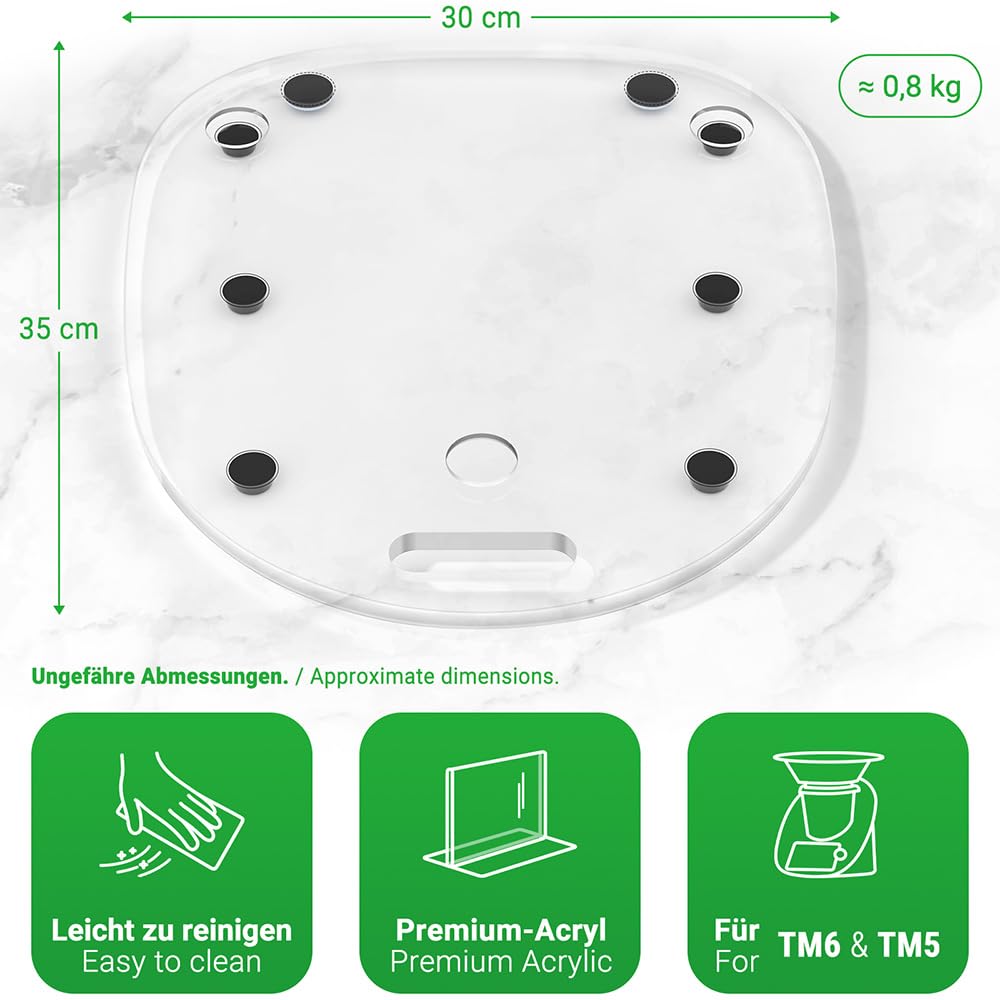 Siegvoll Gleitbrett – speziell für Thermomix TM6 und TM5! Spezifikationen: Abmessungen: 35 × 30 cm Ungefähres Gewicht. 780 gr Material: Acryl Farbe: Transparent Hochglanz Merkmale: 1. Zubehör für Thermomix: Die Form passt sehr gut zum Thermomix. Die drei runden Aussparungen auf der Platte entsprechen den drei Füssen von TM6 bzw. TM5. 2. Schutz für Waage und Arbeitsplatte: Beim Bewegen des Thermomix mit diesem Gleitbrett wird die empfindliche Waage geschont und die Küchenarbeitsplatte kratzfrei gehalten. 3. Geschnitzter Griff: Der Griff an der Vorderseite erleichtert das Halten, Anheben und Bewegen des Gleitbretts. 4. Leicht zu reinigen: Wischen Sie die glatte Oberfläche einfach vorsichtig mit einem Tuch ab.