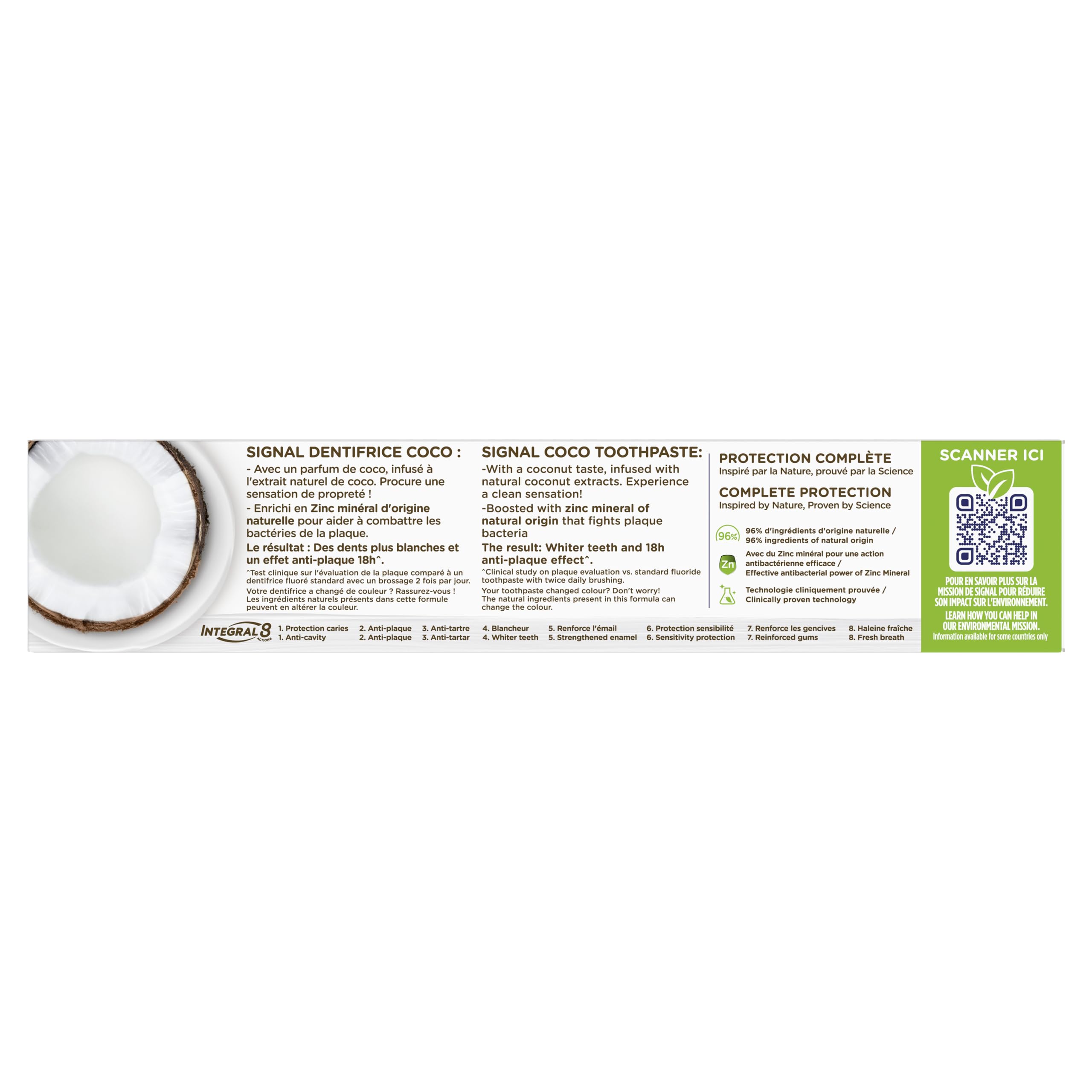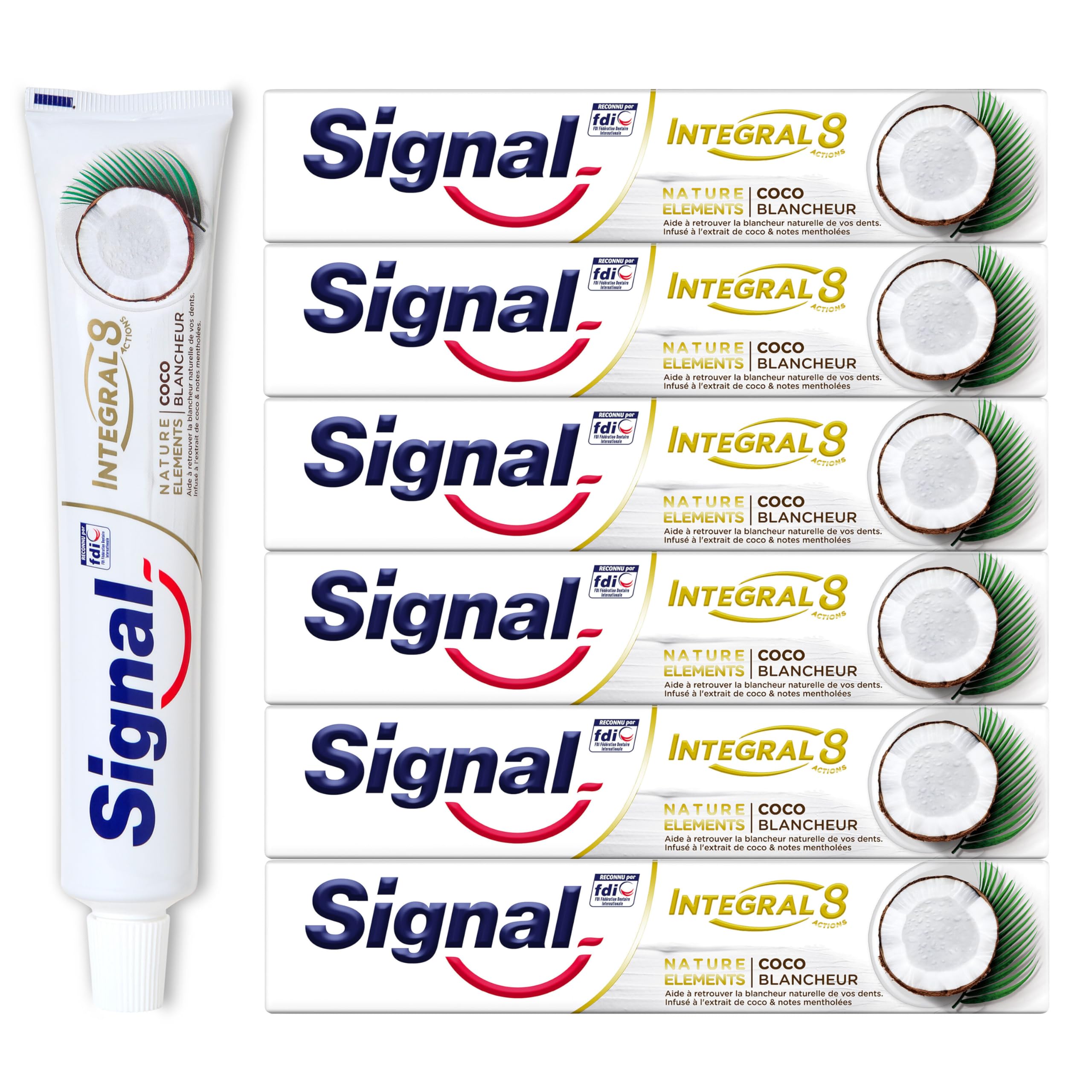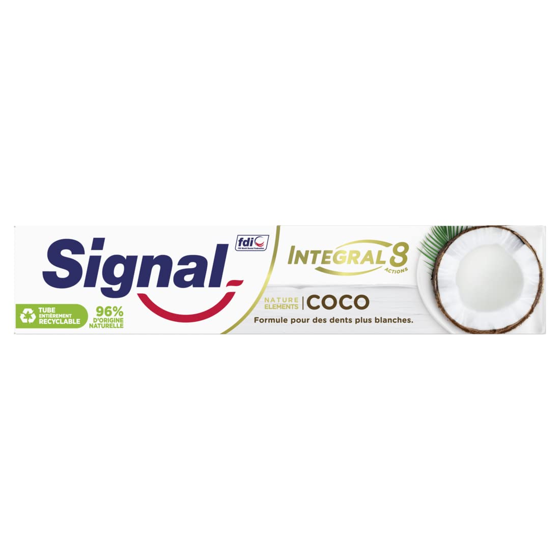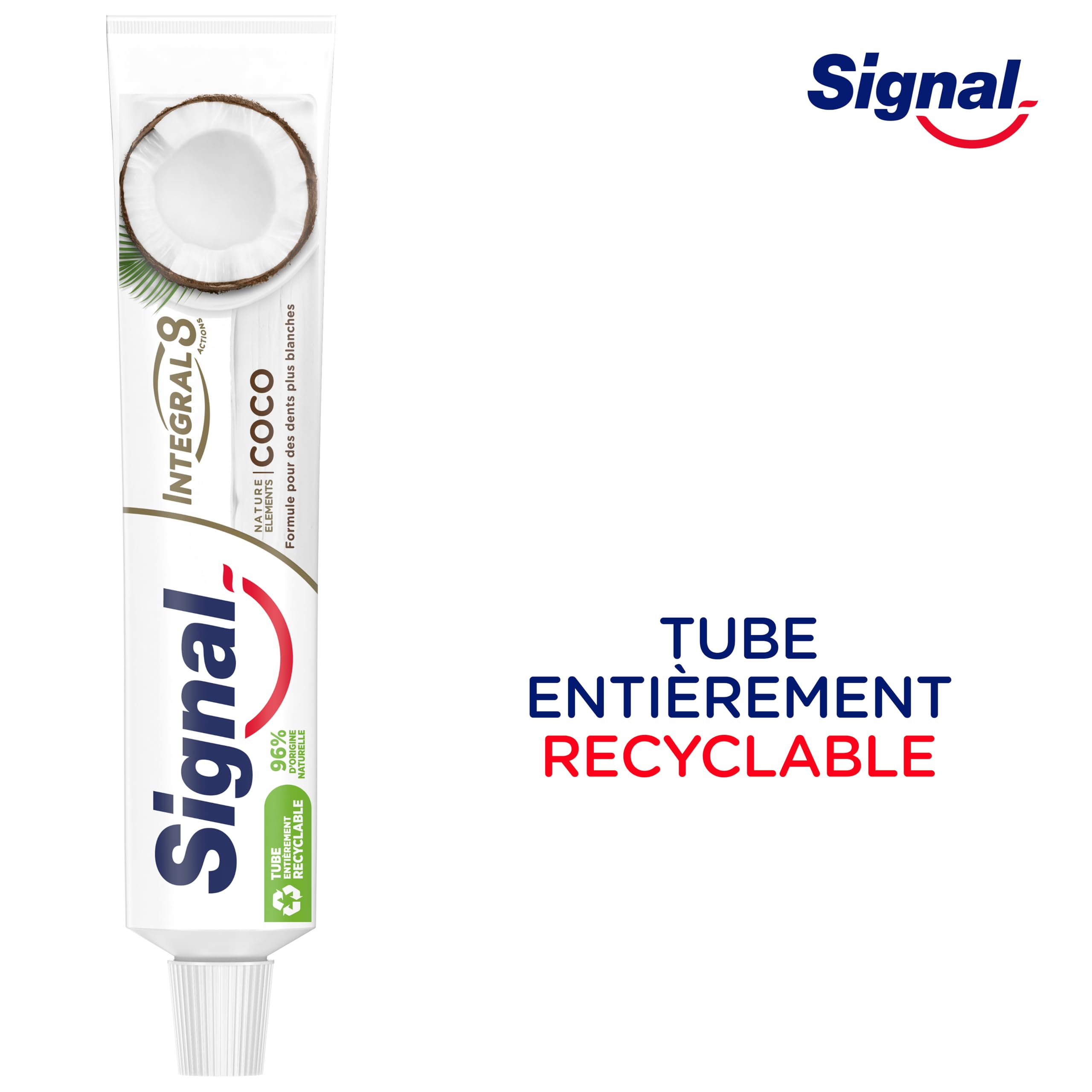Die Zahnpasta Signal Integral 8 Naturelements Coco Blancheur bietet umfassenden Schutz für die ganze Familie, inspiriert von der Natur. Die klinisch erprobte milde Formel kombiniert den natürlichen Kokosextrakt, der für seine reinigenden Eigenschaften bekannt ist, mit Mineralzink, und sorgt für eine wirksame antibakterielle Wirkung. Diese weisse Zahnpasta kombiniert 8 Wirkungen: Bekämpfung von Karies, Stärkung des Zahnfleischs, bietet einen effektiven Anti-Plaque-Effekt bis zu 18 Stunden, stärkt den Zahnschmelz, hilft dabei, das natürliche Weiss der Zähne wiederherzustellen, den Atem zu erfrischen, Zahnsteinbildung zu bekämpfen und Bakterien zu bekämpfen. Die weiche Tube der Zahnpasta ist zu 100 % recycelbar, legen Sie sie an eine TerraCycle-Sammelstelle ab, damit sie recycelt werden kann.