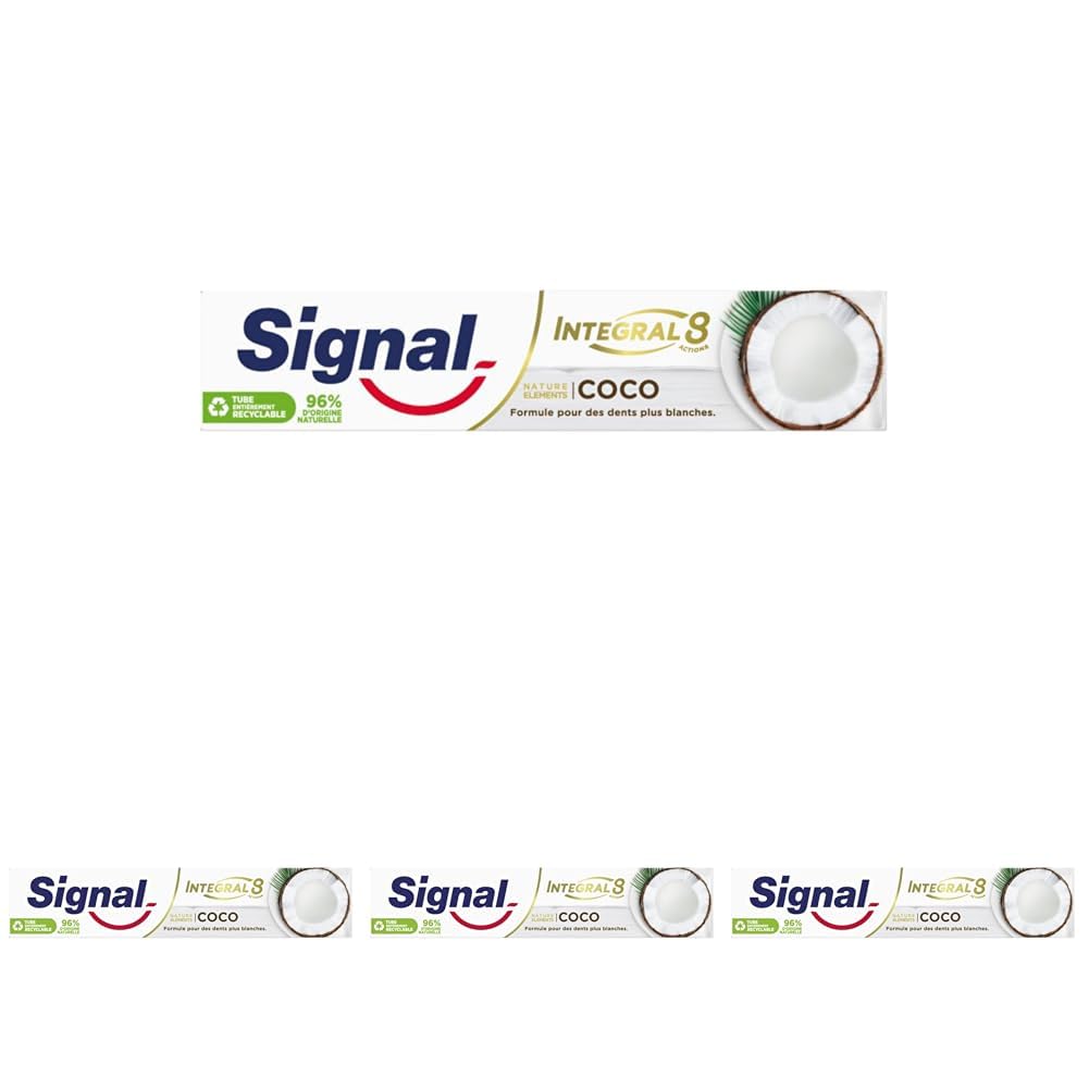 Bieten Sie Ihren Zähnen einen Rundumschutz mit der Zahnpasta von Signal Naturelements Integral 8 Coco. Die sanfte Formel dieser Zahnpasta mit Mineralzink hilft effektiv Bakterien zu bekämpfen und weissere Zähne wiederherzustellen. Die Zahnpasta kombiniert 8 Wirkungen: Schutz vor Karies, Stärkung des Zahnfleisches und des Zahnschmelzes, frischer Atem, hilft bei der Wiederherstellung des natürlichen Weiss der Zähne, Anti-Plaque, Zahnstein und antibakteriell. Das Ergebnis ist ein von der Natur inspirierter Rundumschutz für die ganze Familie. Signal Natur-Elements-Zahnpasta Coco ist vollständig recycelbar – legen Sie sie in Ihren Sortierbehälter. Wir bei Signal glauben, dass Ihr Lächeln Ausdruck Ihrer Persönlichkeit und Ihres Vertrauens ist. Unsere Mission: die Mundhygiene aller mit unseren Zahnbürsten und Zahnpasta zu verbessern, damit jeder von uns die Kraft seines Lächelns entfesseln kann. Signal begleitet die Franzosen seit 1961, um ihnen schon in jungen Jahren gute Gesten zu vermitteln und die Bedeutung des Putzens zweimal täglich, morgens und abends für weisse und gesunde Zähne zu demonstrieren. Wir ergreifen Massnahmen, um die Umweltbelastung unserer Produkte zu begrenzen. Deshalb sind unsere Signal Integral 8 Nature-Elements-Zahnpasta jetzt in der klassischen Industrie recycelbar. Mit Signal zählt jedes Lächeln.