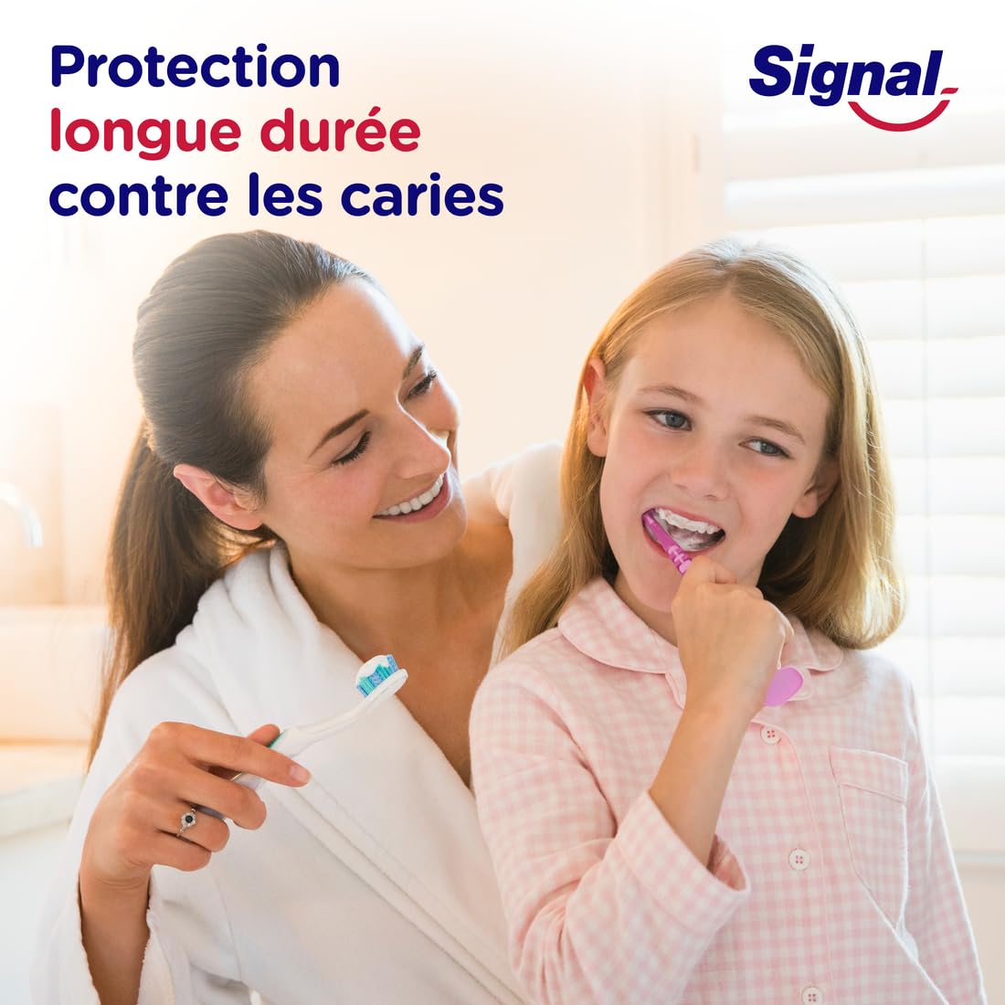 Signal Super-Mario-Zahnpasta für Kinder mit fruchtigem Aroma 0-6 Jahre ist speziell für Milchzähne entwickelt, 50% dünner als die von Erwachsenen. Mit seiner neuen Fluor-Remineralisierungstechnologie stärkt und schützt es die Zähne vor sauren Angriffen, die Karies verursachen. Die Dosierung in Fluor von 1000 ppm ist für Kinder von 0 bis 6 Jahren geeignet. Mit 97% natürlichen Inhaltsstoffen ohne Farbstoffe wurde die extra milde Formel dieser Zahnpasta für Kinder entwickelt. Geringe Schaumbildung, enthält kein sulfatiertes Schaummittel. Ihr Kind wird das fruchtige Aroma dieser Zahnpasta lieben. Mit zweimal täglichem Putzen bietet diese Kinderzahnpasta langanhaltenden Schutz vor Karies. Verwenden Sie die Signal Kinderzahnpasta mit fruchtigem Aroma 0-6 Jahre mit der Signal Kids Zahnbürste 0-6 Jahre. Wir alle wissen, dass die Entscheidungen, die wir jeden Tag treffen, Auswirkungen auf unsere Gegenwart, aber auch unsere Zukunft haben. Dies gilt für unsere Gesundheit und insbesondere für unsere Mundgesundheit. Unsere Mission bei Signal ist es, die Gesundheit aller Mundstücke in jeder Lebensphase zu erhalten. Dafür bietet Signal eine breite Palette von Zahnprodukten an, die auf die spezifischen Bedürfnisse von Kindern, Jugendlichen, Erwachsenen und Senioren zugeschnitten sind. Darüber hinaus geht Signal seit über 25 Jahren in die Schulen, um Kindern die Bedeutung einer guten Mundhygiene beizubringen. Mit Signal zählt jedes Lächeln.