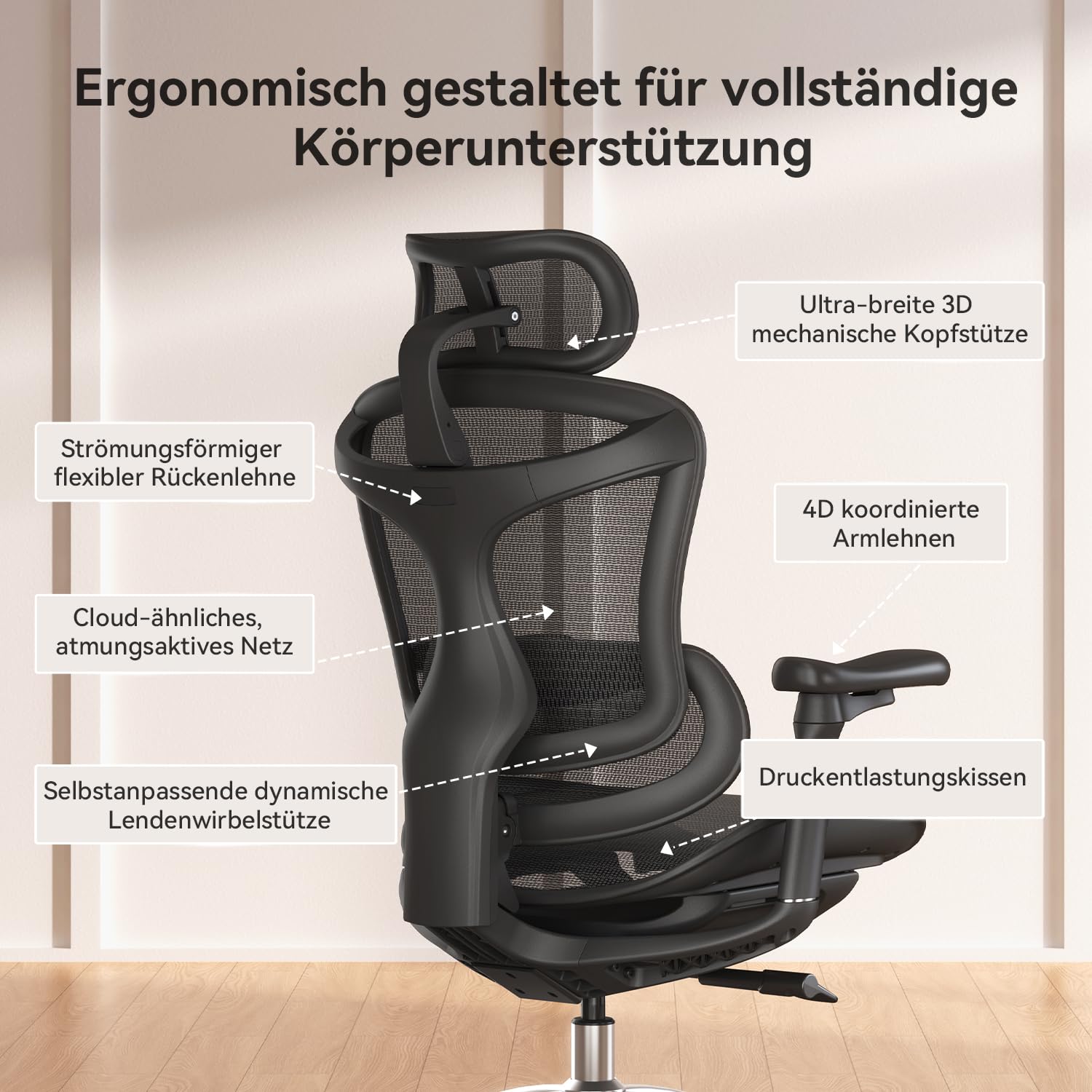 SIHOO Doro C300 Ergonomischer Bürostuhl mit ultraweichen 3D-Armlehnen, dynamischer Lordosenstütze für den Homeoffice-Stuhl, Verstellbarer Rückenlehne (Schwarz)